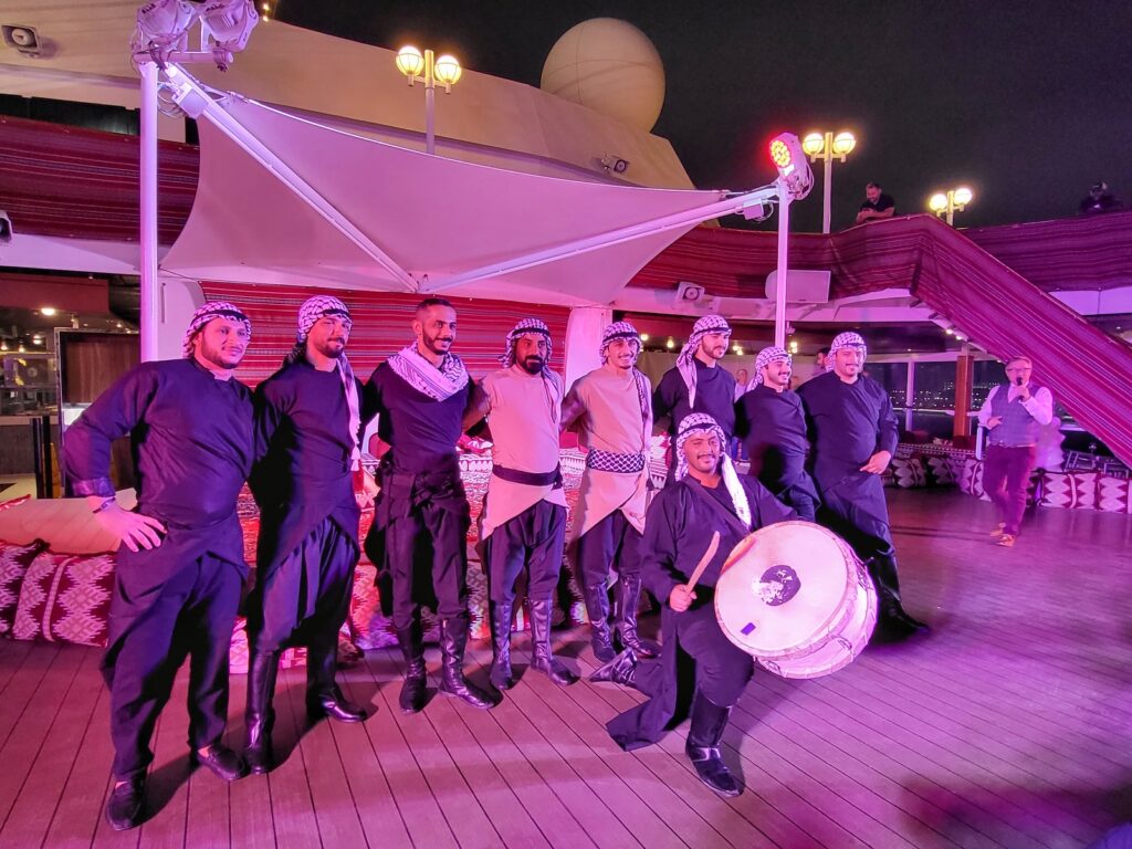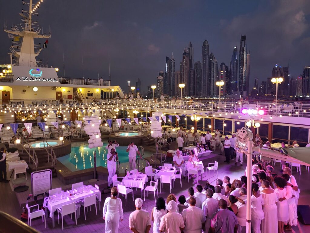Azamaran etuna on myös pidemmät satamassaoloajat, sillä ajoittain laiva jopa yöpyy satamassa. Meidän risteilyllä Azamara Journey viipyi Abu Dhabissa kaksi päivää (saapuminen tiistaiaamuna klo 8.00 ja lähtö keskiviikkoiltana kello 18.00), mikä mahdollisti tutustumisen kohteeseen paljon syvemmin. Oman risteilymme piti sisältää myös toisen samanlaisen yöpymisen Dohassa, mutta Azamarasta riippumattomista syistä Dohassa ei voitu yöpyä. Sen sijaan laiva suuntasi Dubaihin päivää aiemmin ja me matkustajat saimme nauttia parista yöstä Dubaissa laivan toimiessa hotellina. Tutustuimme Dubaihin laivayhtiön järjestämällä retkellä ja nautimme iltaisin laivan kannella Dubain valoista, söimme hyvin ja otimme ilon laivan viihteestä.