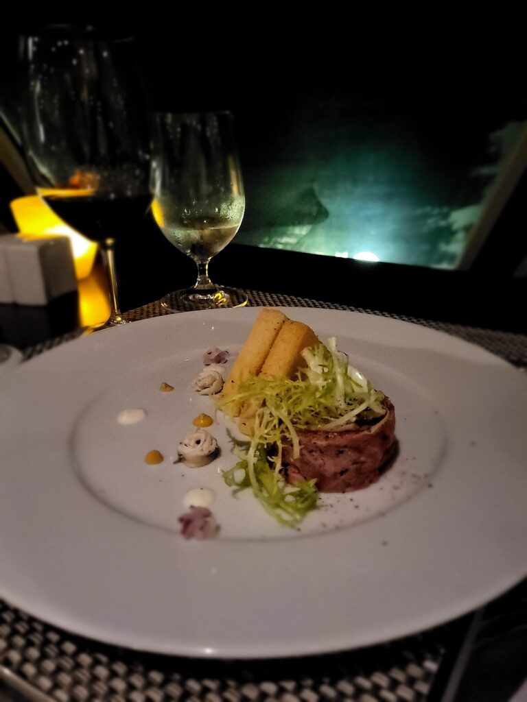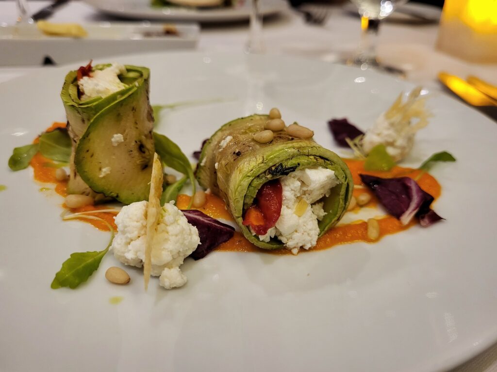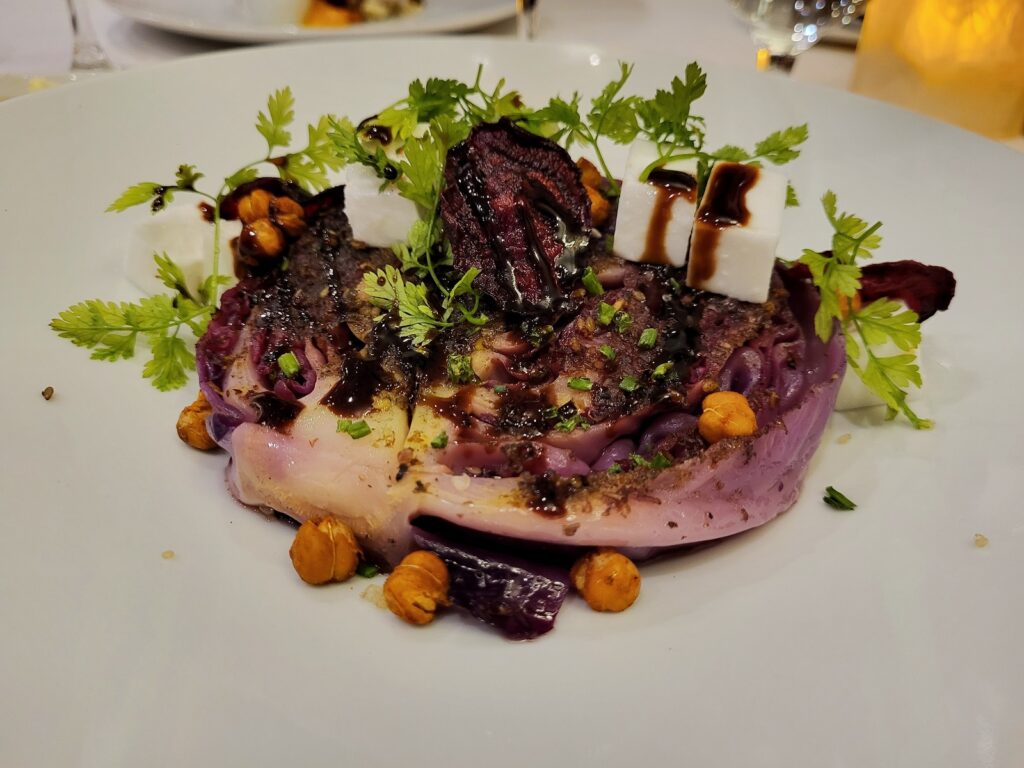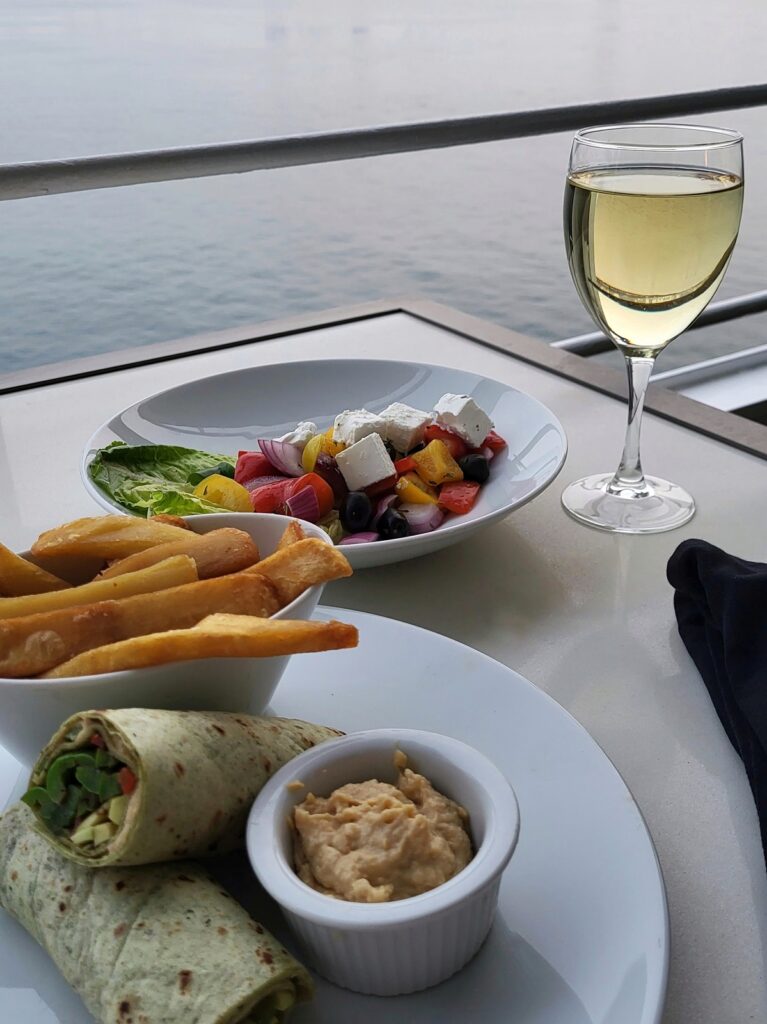Kävimme ensimmäisenä iltana aluksen pääruokaravintolassa ja varustamolla oli tiedossa ruokarajoitteemme. Ravintolan päällikkö saapui pöytämme ääreen ruokailun jälkeen esittäytymään ja kertoi, että keittiöllä oli mahdollisuus muuntaa tavallisen menun tarjonnasta meille sopivia annoksia 24 tunnin varoitusajalla. Meillä oli siis mahdollisuus tarkistaa seuraavan päivän menu ennakkoon ja minäkin olisin voinut pyytää ”herkulliselta vaikuttavan liha-annoksen” kasvissyöjälle sopivana versiona.