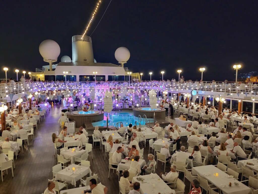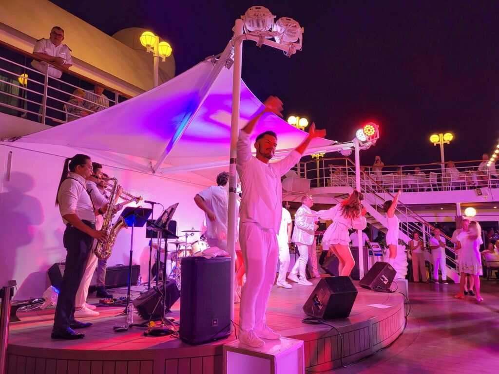 Nautin laivan Casual-ilmapiiristä, henkilökohtaisesta palvelusta ja laivan ”pienestä” koosta. Varsinaiset pukukoodit ja Formal Night-puuttui, joten vaatetuksen suhteen ei tarvinnut stressata. Laivan pesulapalvelujen sijaan käytimme itsepalvelupesulan palveluja ahkeraan ja vaikka laiva oli pieni ja suuret Bradway-tasoiset musikaalit puuttuivat, oli viihdettä ja ohjelmaa tarjolla. Laivan viihdetiimi teki hyvää työtä ja ehdoton ykkönen oli White Night Party, jolloin matkustajat pukeutuivat valkoiseen. Uima-allaskansi valjastettiin ulkoilmaravintolaksi, ruokapöydät katettiin valkoisilla pöytäliinoilla, juomat tarjoiltiin pöytiin ja ulkoilmabuffet suorastaan häikäisi tarjonnallaan. Ilta jatkui bileillä yötaivaan alla, kaupungin valojen tuikkiessa ympärillä.