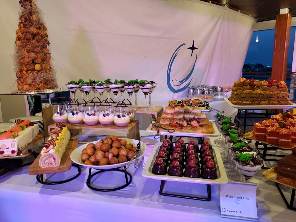 Yksi tärkeä tekijä onnistuneessa risteilyssä on ruoka ja meillekin mieheni kanssa se on tärkeää. Olemme pieniä kulinaristeja ja jotenkin sitä on risteilyillä oppinut syömään vähän ekstraa. Azamaran risteilyjen hintaan kuuluu ruokaa maksuttomasti aluksen pääruokaravintolasta (Discoveries Dining Room), uima-allaskannen yhteydessä olevasta grillistä (The Patio) ja buffetista (Windows Cafe). Maksuitta pientä purtavaa saa Mosaic Cafesta ja pehmiksiä puolestaan The Pation Swirl & Top-pisteestä. Eikä siinä kaikki, moneen varustamoon verrattuna huonepalvelu on ilmaista 24/7 ja huonepalvelun menu on laaja. Jos ei laajasta huonepalvelun menusta huolimatta löydä sitä mieluisaa annosta, on maksutta tilattavissa annoksia myös pääruokaravintolan menusta. Pisteet Azamaralle.