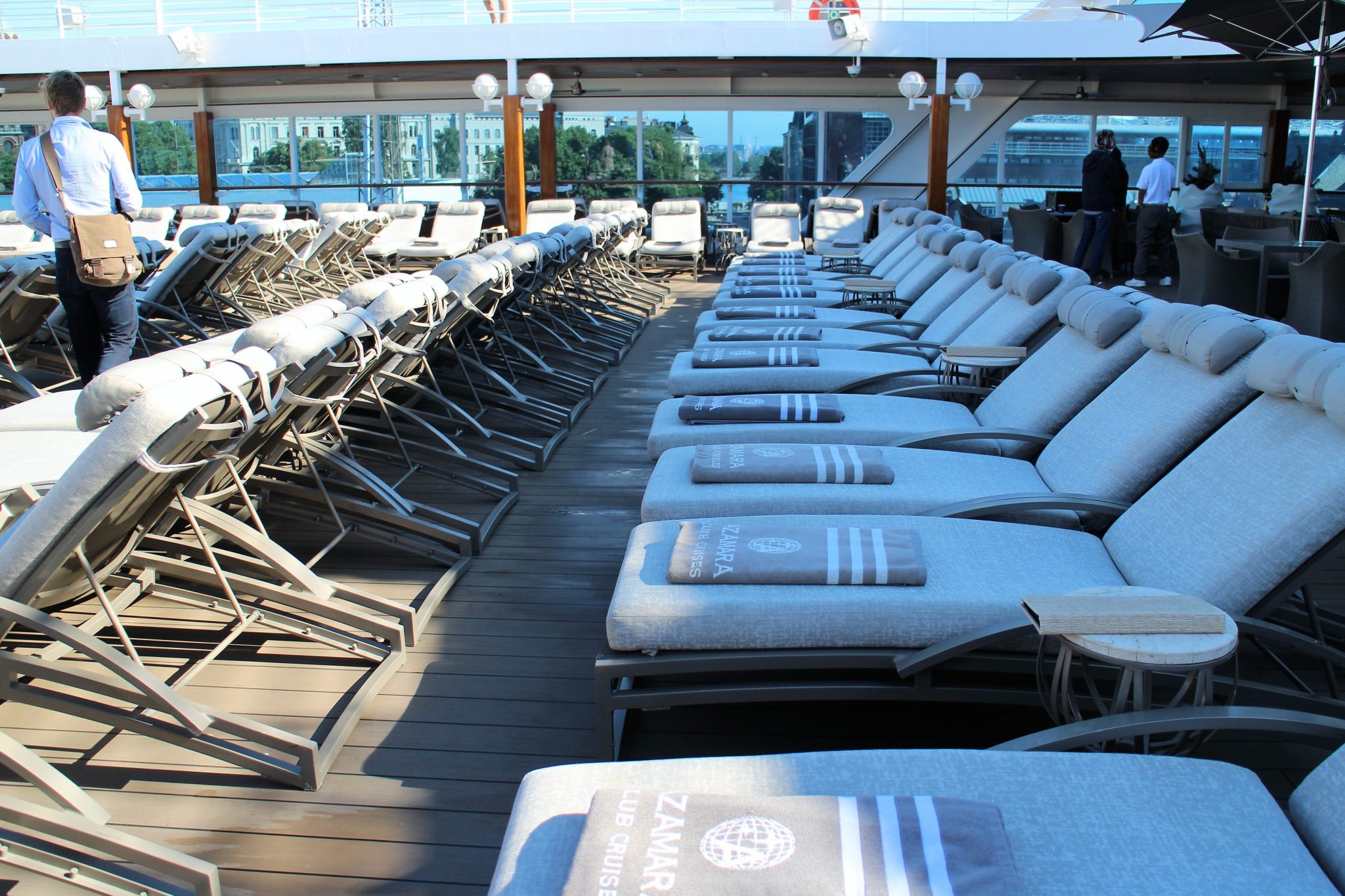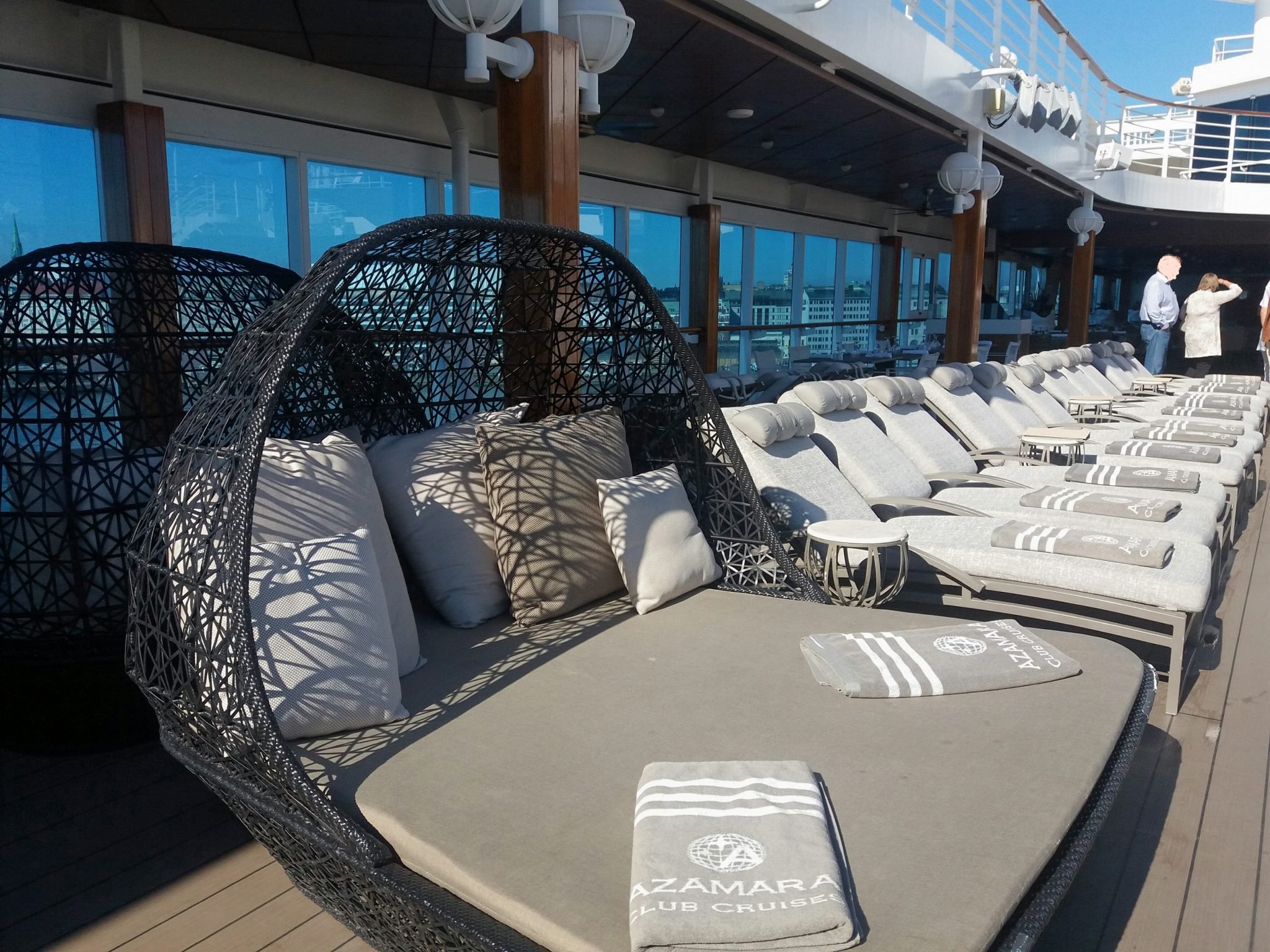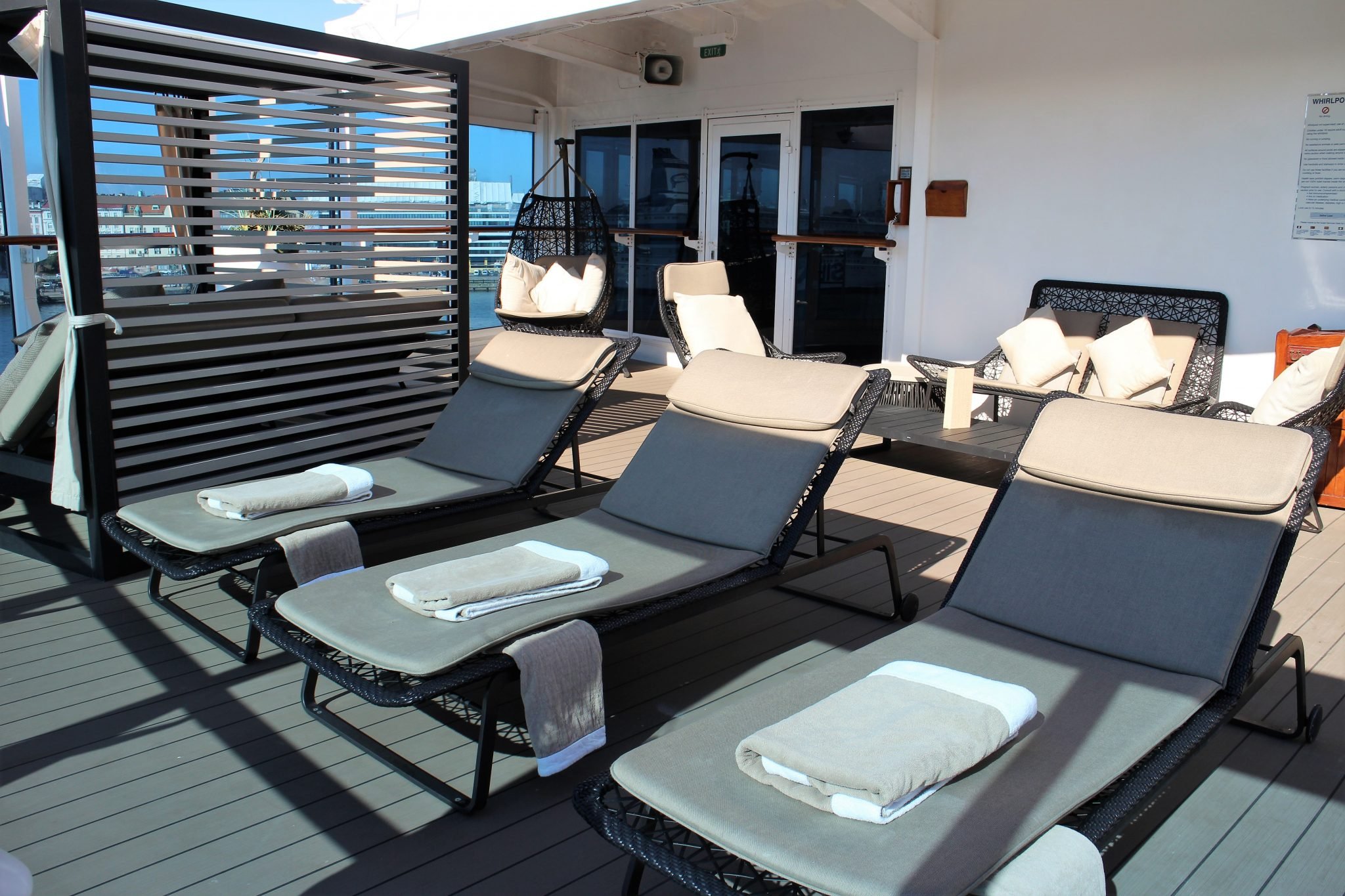 Luksusristeilijän aurinkotuolitkin ovat huomattavasti tasokkaammat (lue: ihanan unettavat), kuin tavallisilla risteilijöillä.