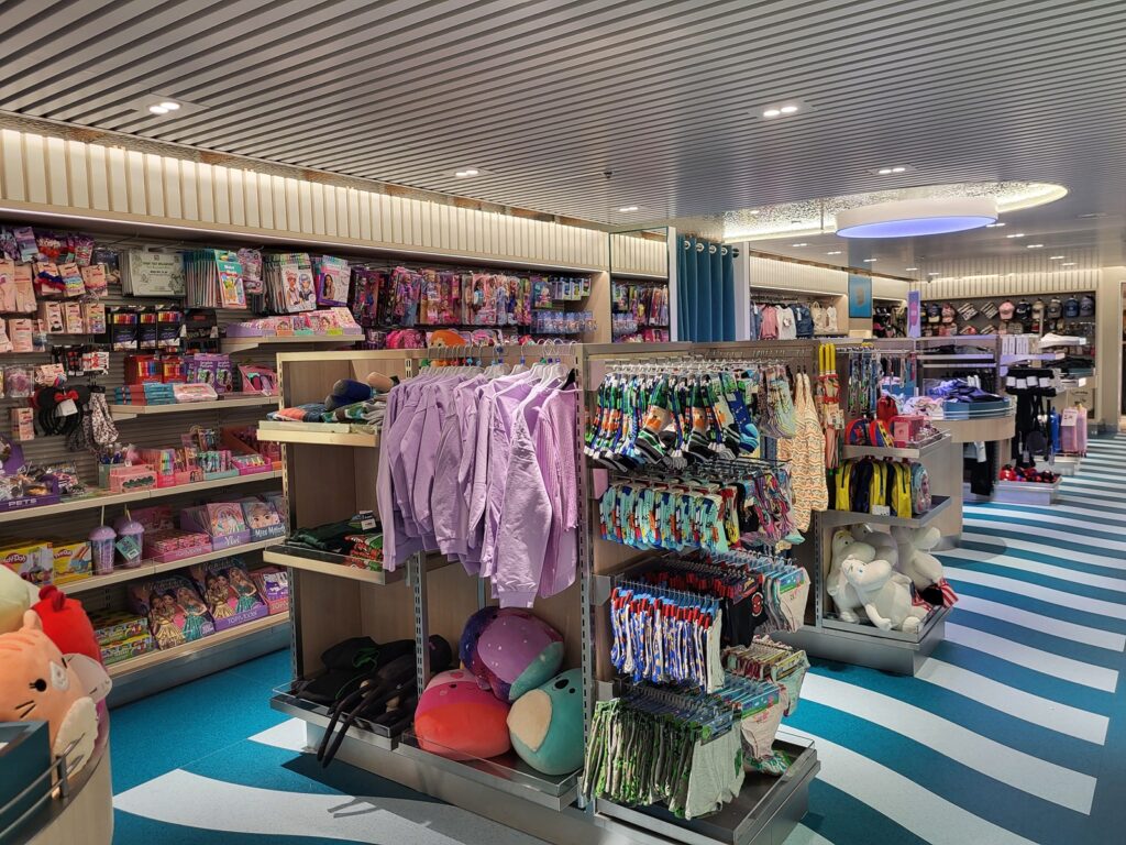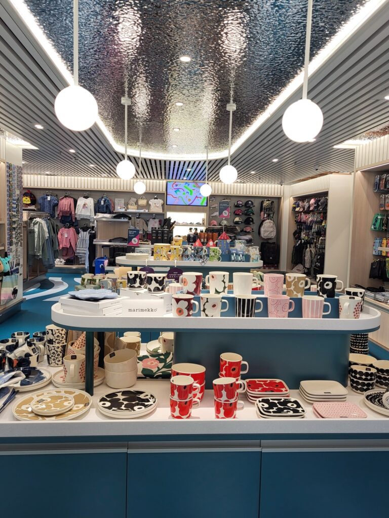 Eipä kannen 6 uudistukset loppuneet siihen. Perfumes & Cosmetics -myymälään tuli kaksi tilavaa sisäänkäyntiä ja nyt ko. myymälästä pääsee suoraan uusittuun, merellisen väriseen Gifts & Kids -myymälään. Omat pojat on jo isoja, mutta näin jo mielessäni pienten lasten tepastelevan aaltoilevien viivojen päällä. Tekipä itsekin mieli hiukkasen kävellä viivoja pitkin.