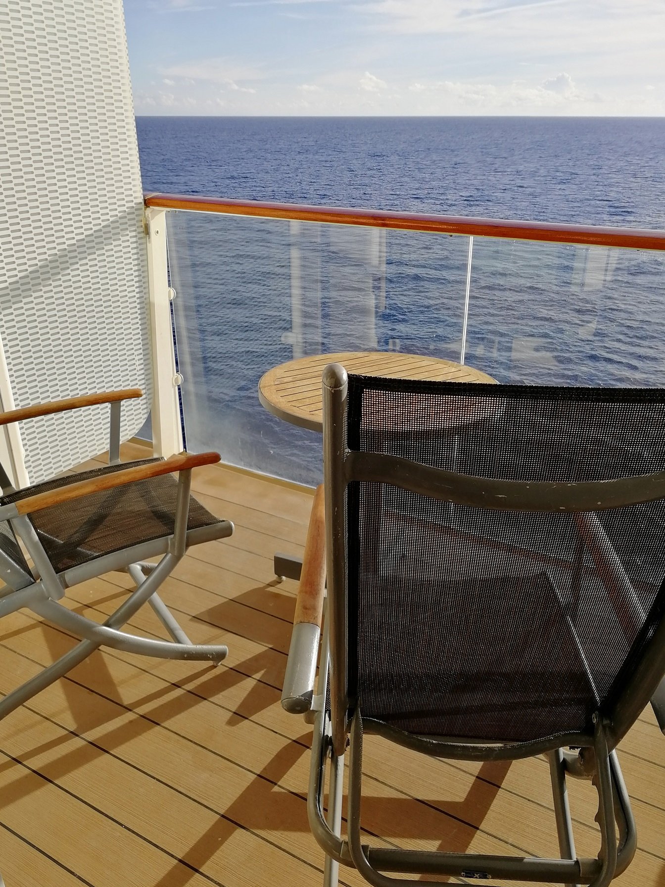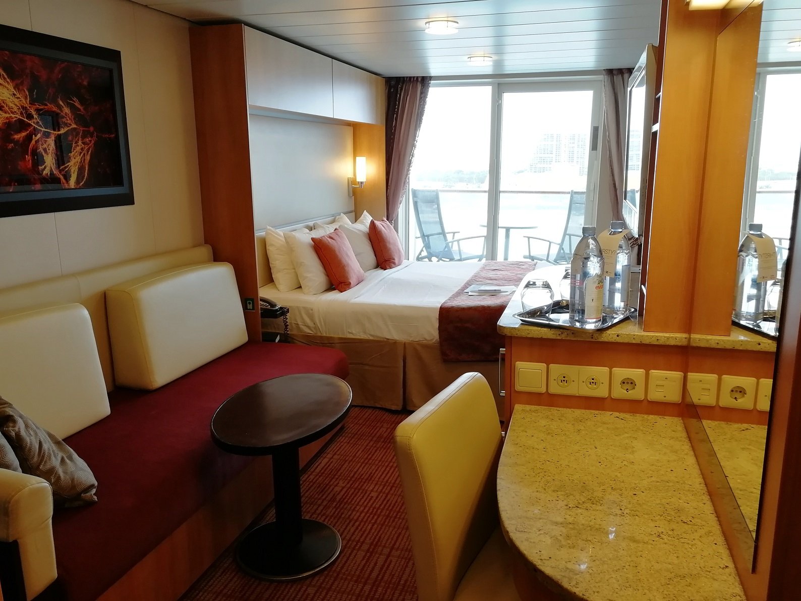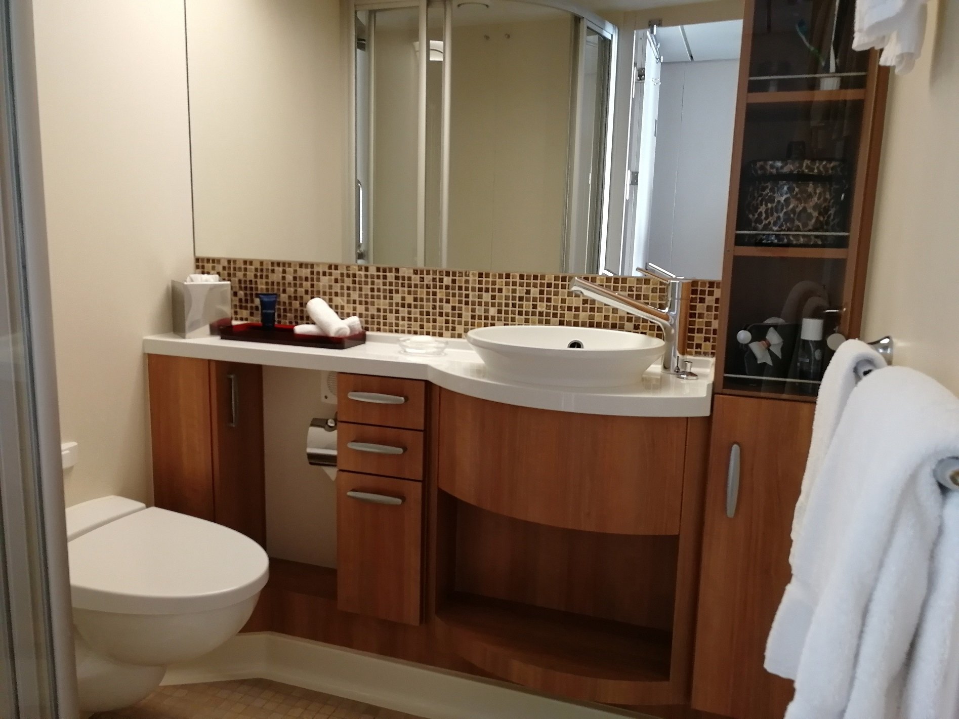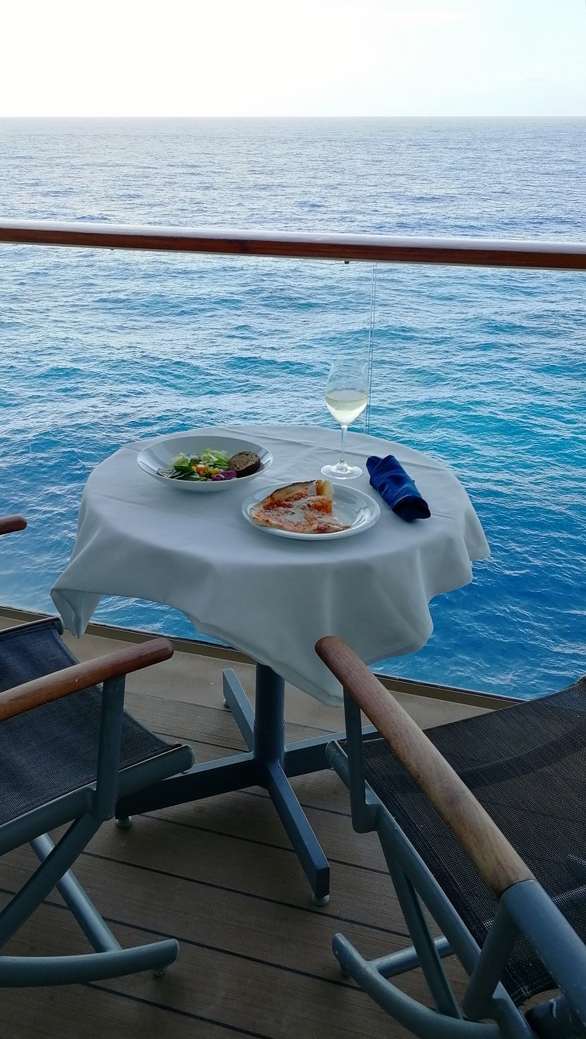 Niin, mites se meikäläisen hytti? Itse majoituin lähempänä aluksen keskisosaa Deluxe Ocean View Cabin with Balcony-hytissä. Hytti oli tilava, siisti ja hyvässä kunnossa, säilytytilaa oli hyvin, parveke hyvän kokoinen ja parvekkeella olevien aurinkotuolien selkänojat olivat kallistettavissa. Erityisesti pidin hytin kylpyhuoneesta, jossa oli mukavasti säilytystilaa ja suihkukaappikin löytyi. Kylpynutut odotti valmiina vaatekaapissa ja hytin varustukseen kuului myös kankainen ostos-/rantakassi, jonka sai kotiinviemisiksi.