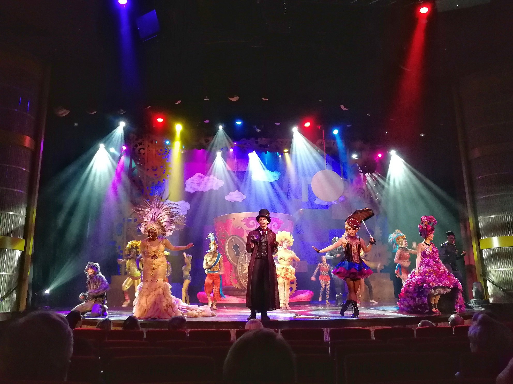 Yksi ohjelmanumero on mielestäni yli muiden ja se on Silent Disco, jossa jorataan kuulokkeista tulevan musiikin tahtiin. Musiikkikanavia on kolme ja muut tanssijat näkevät valitsemasi musiikkikanavan kuulokkeista paistavasta väristä. Omalla risteilyllämme sitä hoilattiin ja jorattiin sydämen kyllyydestä ja kaikkien hauskin näky oli oikeastaan kiitospäivän iltana, jolloin Silent Disco järjestettiin upeassa Grand Foyer aulassa. Ruokailu pääravintolassa oli vielä jälkiruokaa vailla, joten matkustajat hakivat aulasta itselleen kuulokkeet. Siellä pääravintolassa sitä sitten useampi tuntui heiluttelevan päätään musiikin tahtiin ja intoutuipa jokunen tanssahtamaankin pöydän ääressä. Eikä muuten ketään tuntunut haittaavan moinen.