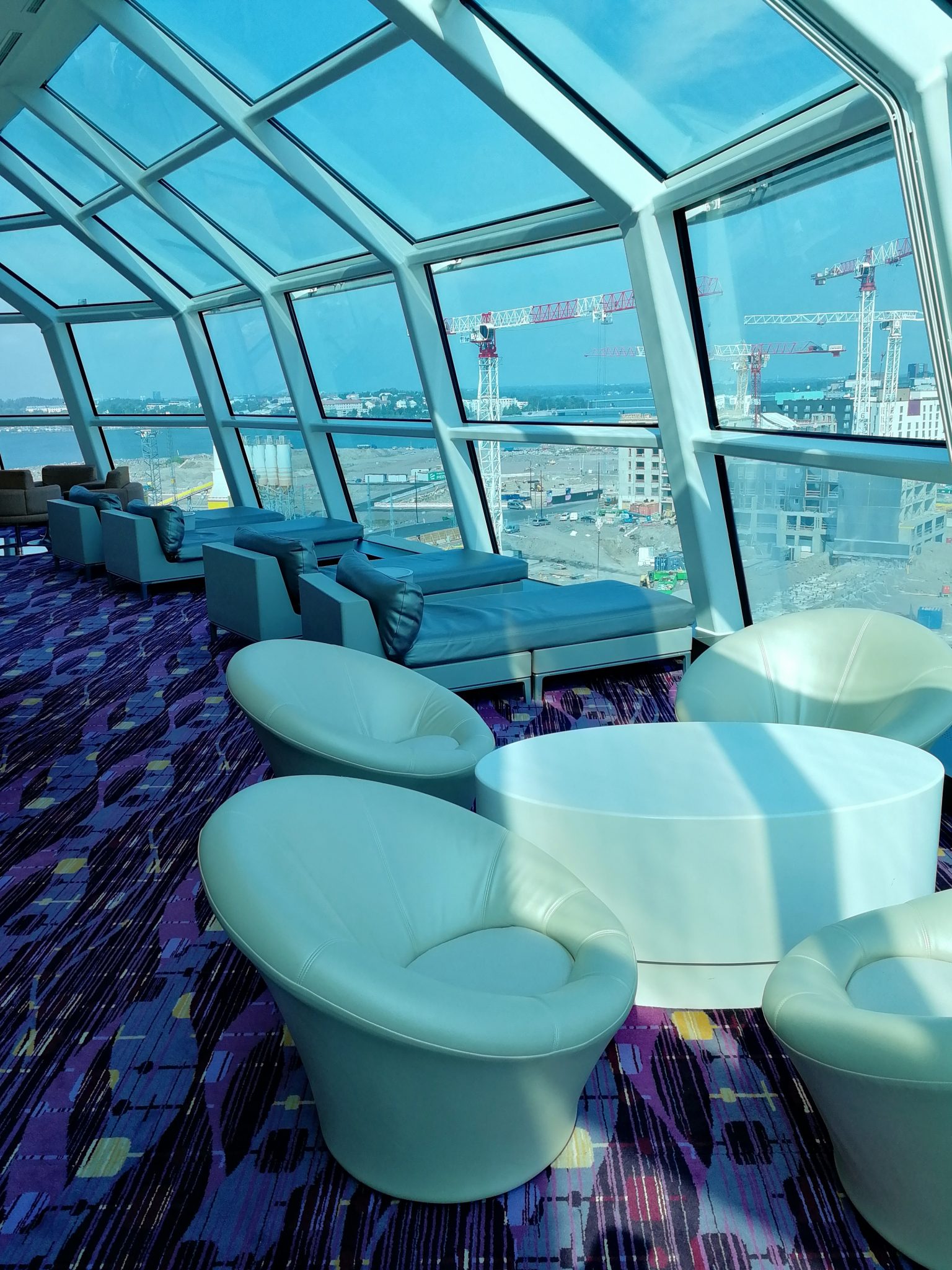 317 metriin mahtuu paljon tiloja ja wau, millaisia ne onkaan. Julkiset tilat miellyttävät silmää ja laiva on kuin rakennettu sellaiselle matkustajalle, joka hakee rauhallista yhdessäoloa. Ehdottomia vetonauloja mielestäni on aluksen yläkannella sijaitseva ihka oikea nurmikenttä (The Lawn Club) ja keulassa sijaitseva näköalabaari Sky Observation Lounge. Ei myöskään passaa unohtaa aluksen keskusaulaa (Grand Foyer), joka ulottuu kannelta 3 aina kannelle 15 saakka ja keskellä kansia tuossa aulassa kasvaa yläilmoissa aito lehtipuu.