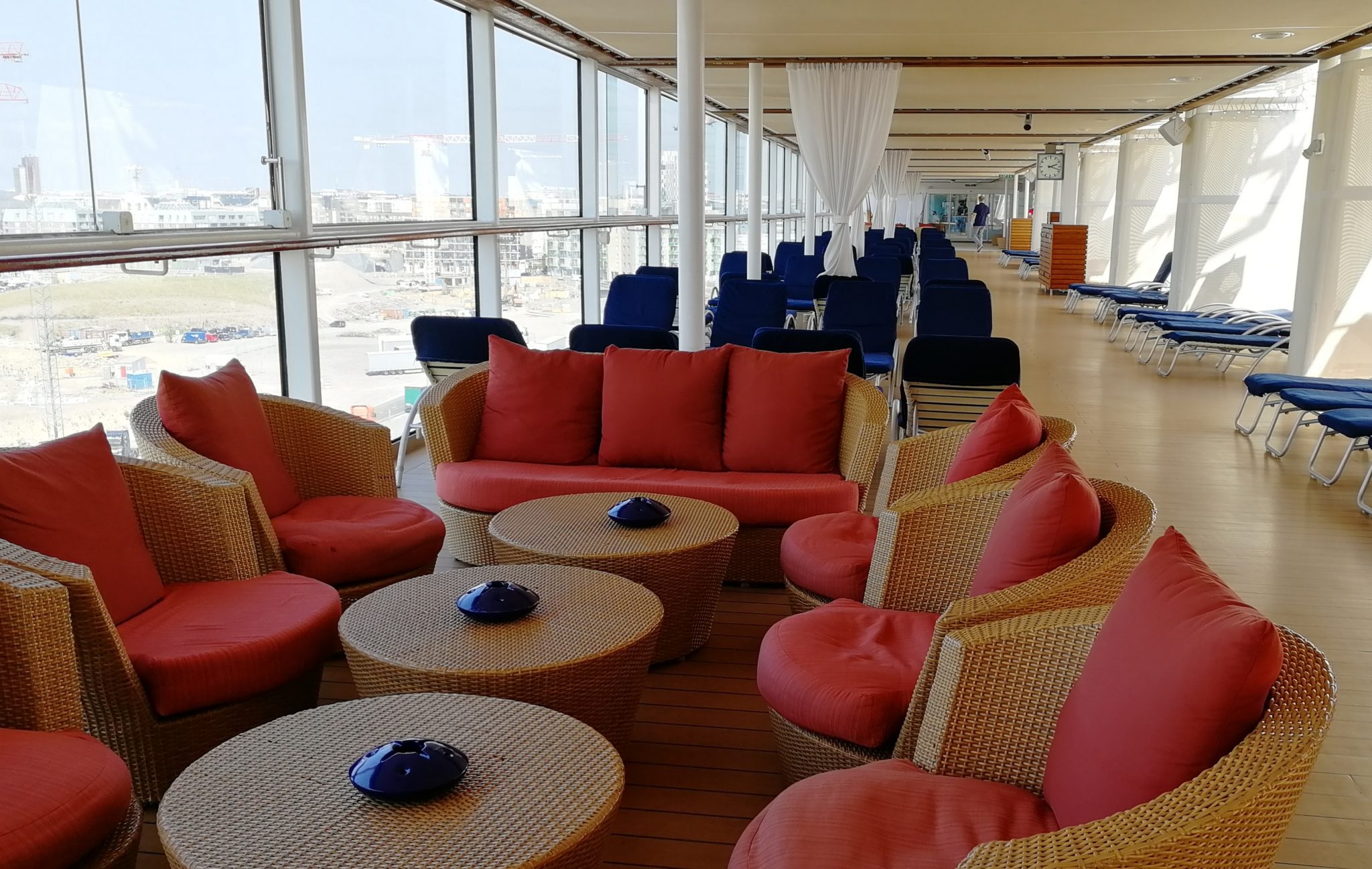 Uima-allaskannen oleskelutiloja. Näyttäisi siltä, että kuvan etuosassa oleva istuinryhmä on varattu tupakoitsijoille.