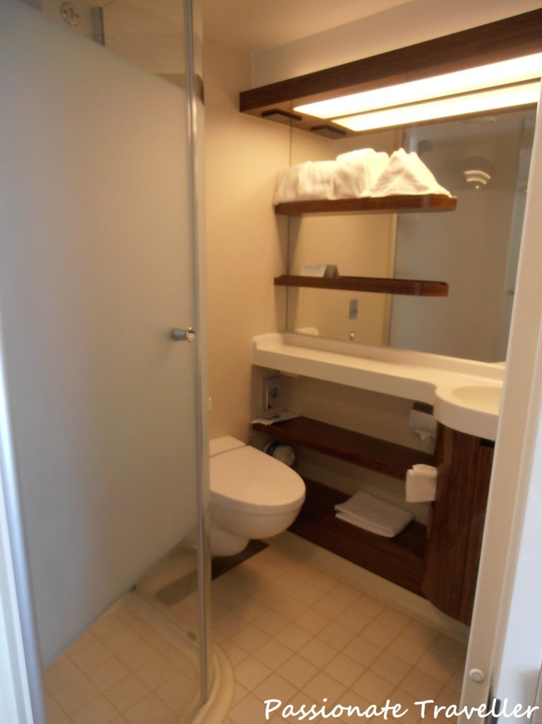 Liukovellinen vaatekaappi on juuri tuon sohvan läheisyyden takia ehkä hieman hankala käyttää, mutta kyllä me sen kanssa ainakin pärjäsimme. Lisää kaappitilaa löytyy kampauspöydältä ja esimerkiksi kampauspöydän avattavan istuinrahin sisälle saa tavaraa. Isot matkalaukut puolestaan sopivat hyvin parisängyn alle. Hytin varustukseen kuuluu television lisäksi mm. hiustenkuivaaja ja pienoinen kahvinkeitin.