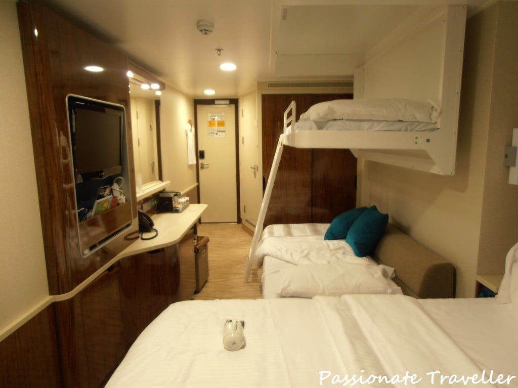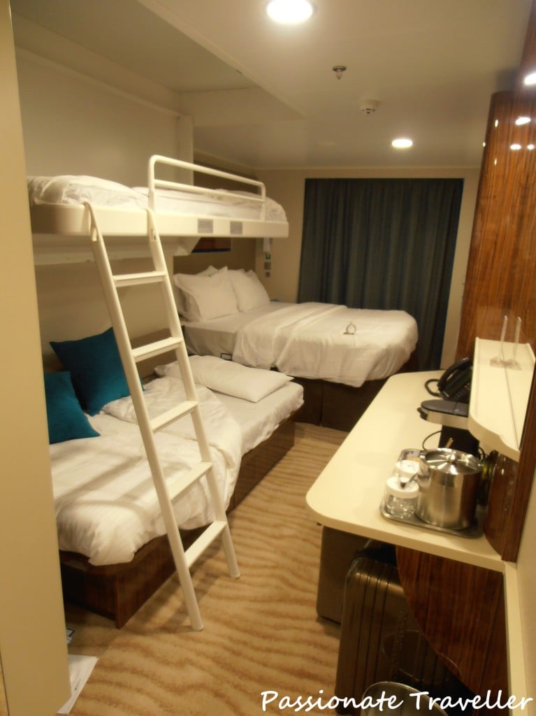 Parvekkeen kanssa noin 21 m²:n kokoinen Family Balcony on oikein oiva hytti lapsiperheille. Kyseiset hytit ovat sijoitettu siten, että ne sijaitsevat lähempänä lasten leikkihuonetta mutta hytti on mahdollisuus valita myös tarpeeksi kaukaa ettei ”meluhaittoja” ole. Tilaa lattialle luo katosta laskettava yläsänky, minkä takia vuodesohva on tarkoitettu yhdelle henkilölle eikä siten avaudu lattialle tukkeeksi. Hyttiä on kahta versiota, sellaista jossa sänky on parvekkeen puolella ja sellaista, jossa sohva on parvekkeen puolella. Itse suosittelen varaamistilanteessa valitsemaan sellaisen hytin jossa sänky on parvekkeen puolella, sillä liukovellinen vaatekaapisto sijaitsee lähellä sohvaa (taikka sänkyä jos päätyy varaamaan sen toisen, ei suosittelemani hyttivaihtoehdon). Sänkyjen laatuun ei ollut reissullamme mitään huomautettavaa.