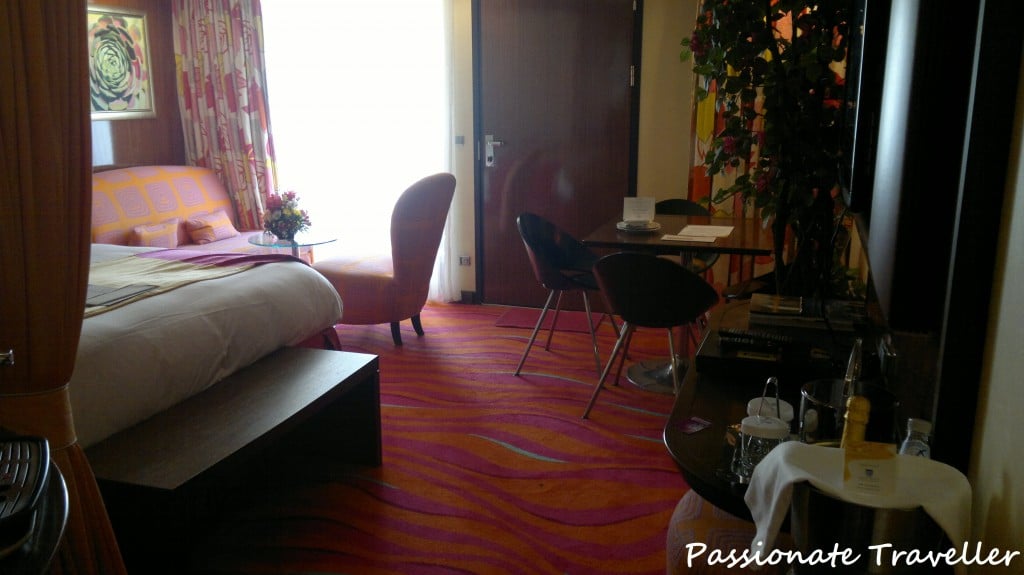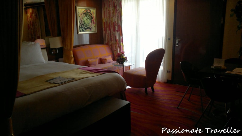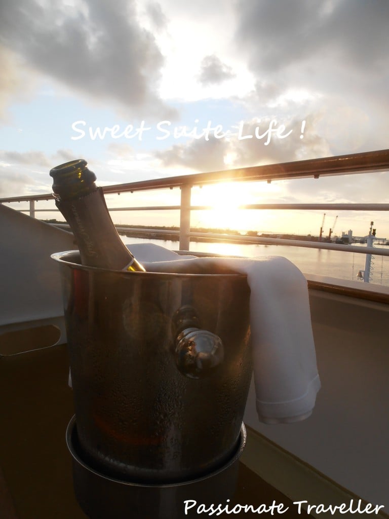 Aluksen keulassa sijaitseva Penthouse with Large Balcony #9002 on kooltaan ainoastaan hieman yli 27 m², mutta neliöt ovat mielestäni melko onnistuneesti käytetty. Sviitissä on muhkean sängyn lisäksi pienoinen sohva, tuoli sekä neljän hengen ruokailuryhmä vaikka hyttiin majoittuukin korkeintaan kolme henkilöä. Kylpyhuone on jaoteltu kolmeen pieneen osaan siten, että käsienpesualtaalta on molemmin puolin erotettu lasiovin wc-pönttö sekä kylpyamme/suihku. Sviitin hintaan kuuluu pullollinen vettä ja kuohuviiniä lähtöpäivänä sekä oma butler, joka hoitaa mm. ruokatilaukset ja tuo snackseja (hors d’oeuvres) joka ilta. Lisäksi hintaan kuuluu conciergen palvelut, aamiaiset ja lounaat omassa ravintolassa, priority liikkumiset laivalle/ulos, kapteenin coctail-kutsut sekä muitakin kutsuja. Lisää sviittimatkustamisen eduista ja vertailua hieman voit lukea blogipostauksestani Karibian risteilyistä: Sviitti vs. perushytti, budjetista asiaa.