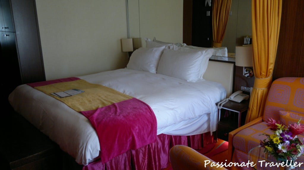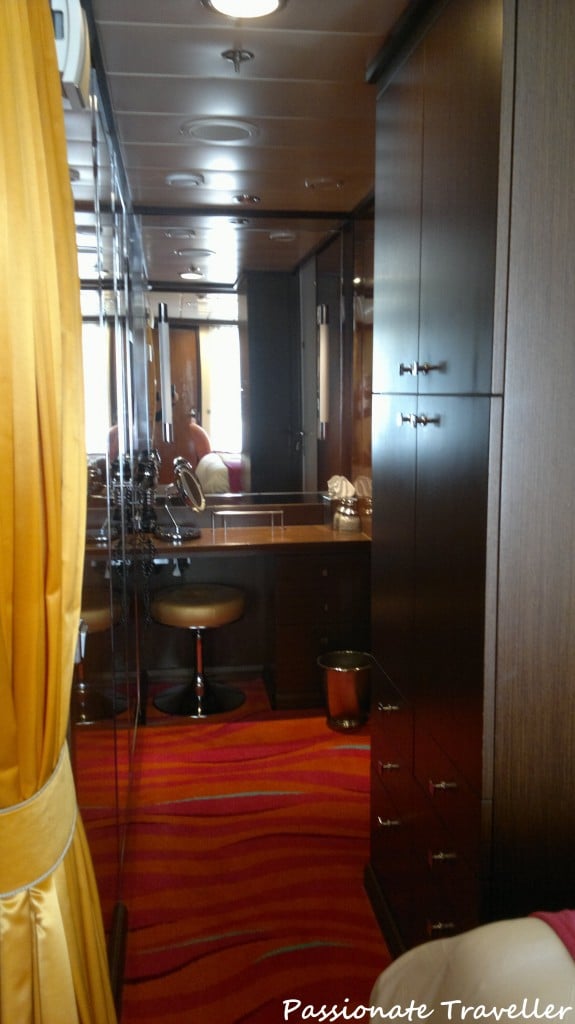 Pukeutumis-/kaunistautumisalueella on mukavasti säilytystilaa ja kokovartalopeili vaatekaapissa, joka avautuu sekä eteisen että pukeutumisalueen puolelle (kaapit kuvassa vasemmalla, kokovartalopeilit paistaa kuvassa pienesti). Hiustenkuivaajan lisäksi meikkipöydällä on erillinen meikkipeili, kasvopapereita, pumpulituppoja sekä vanupuikkoja. Kylpytakit löytyvät vaatekaapista, valitettavasti en muista oliko kylpytossuja tarjolla vuonna 2012.