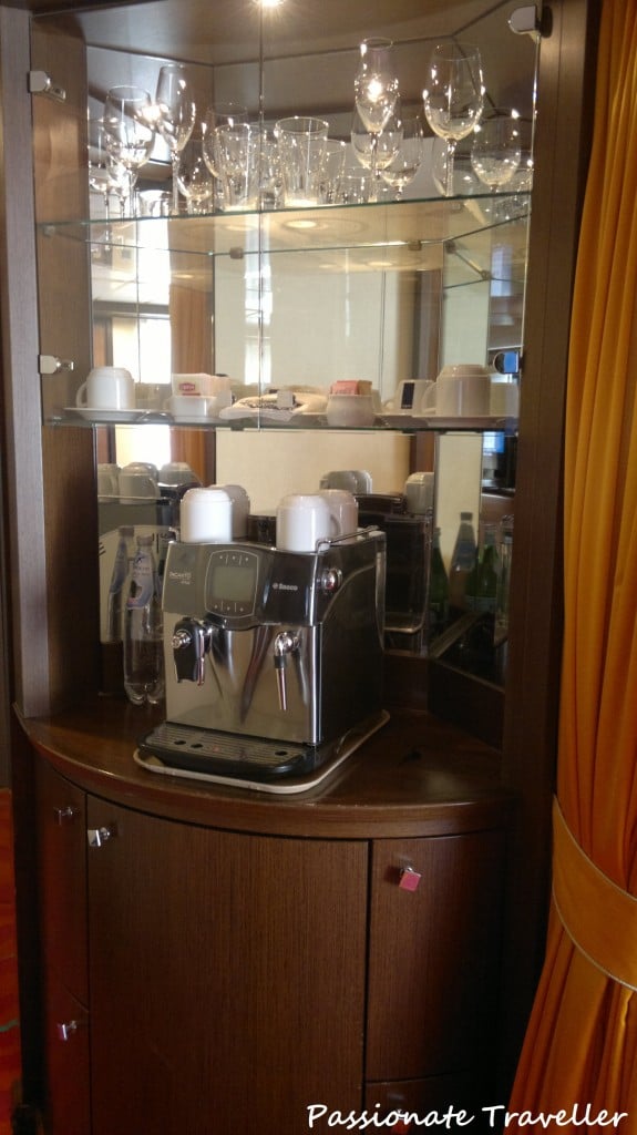 Minibaarin/jääkaapin sisältö ei kuulu matkan hintaan, mutta kahvi ja tee sen sijaan kuuluvat. Astetta paremman kahvinkeittimen lisäksi oleskelualueelta löytyy Stereo/CD-soitin (mahdollisuus lainata elokuvia/musiikkia), Taulu-TV sekä maksullinen langallinen Internet-yhteys.