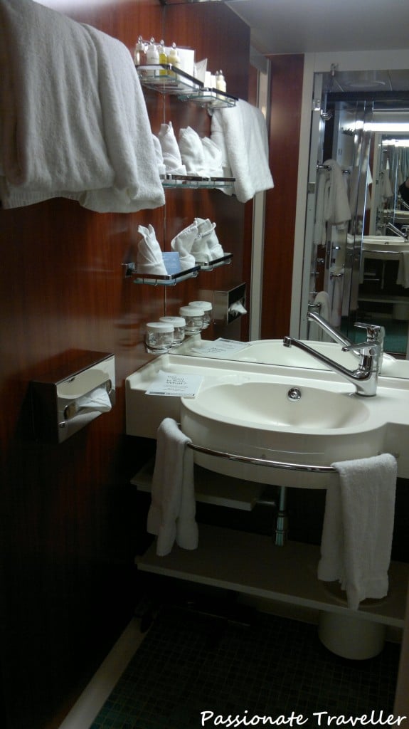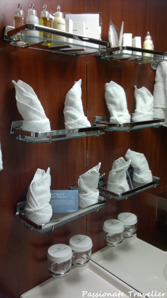 Kylpyhuoneen puolella ei ole pulaa pyyhkeistä. Laivayhtiön sviittimatkustajille tarjoamia Elemis-tuotteita on asiallinen määrä, mutta siitä minulla ei ole muistikuvaa miten niitä lisättiin meidän risteilyn aikana.