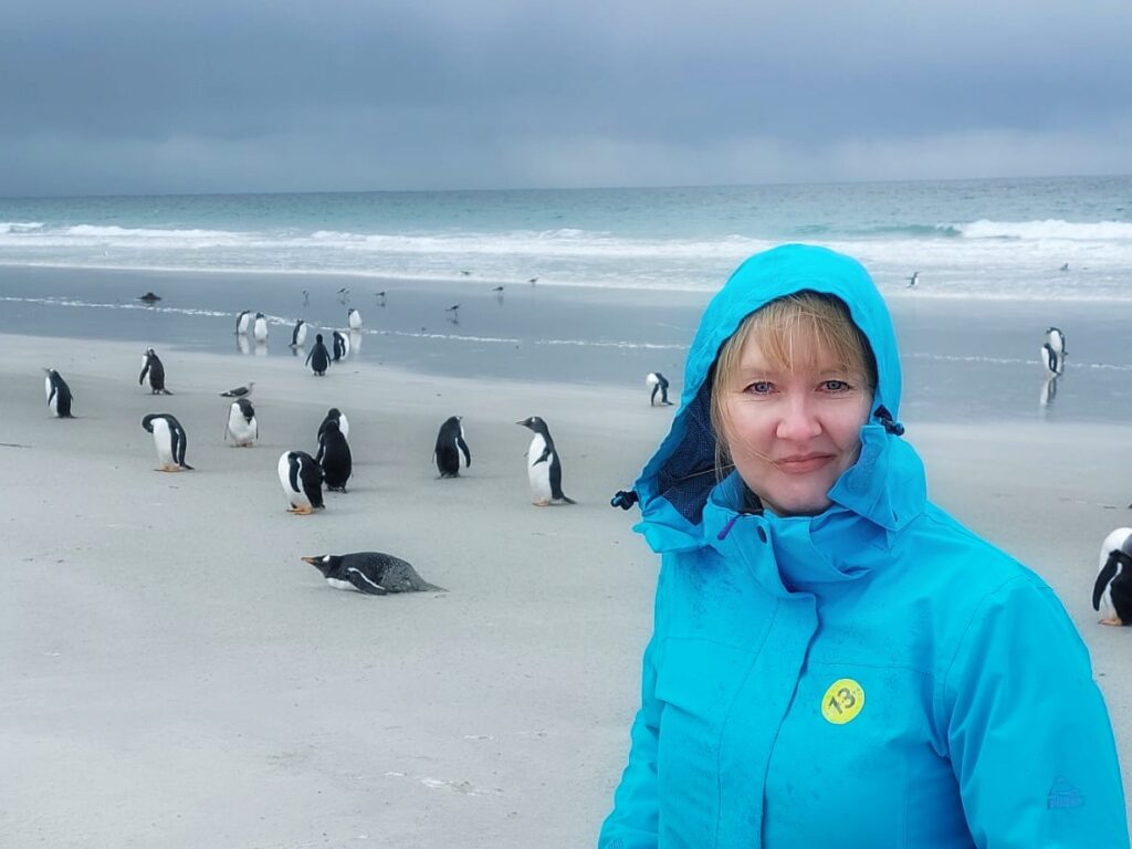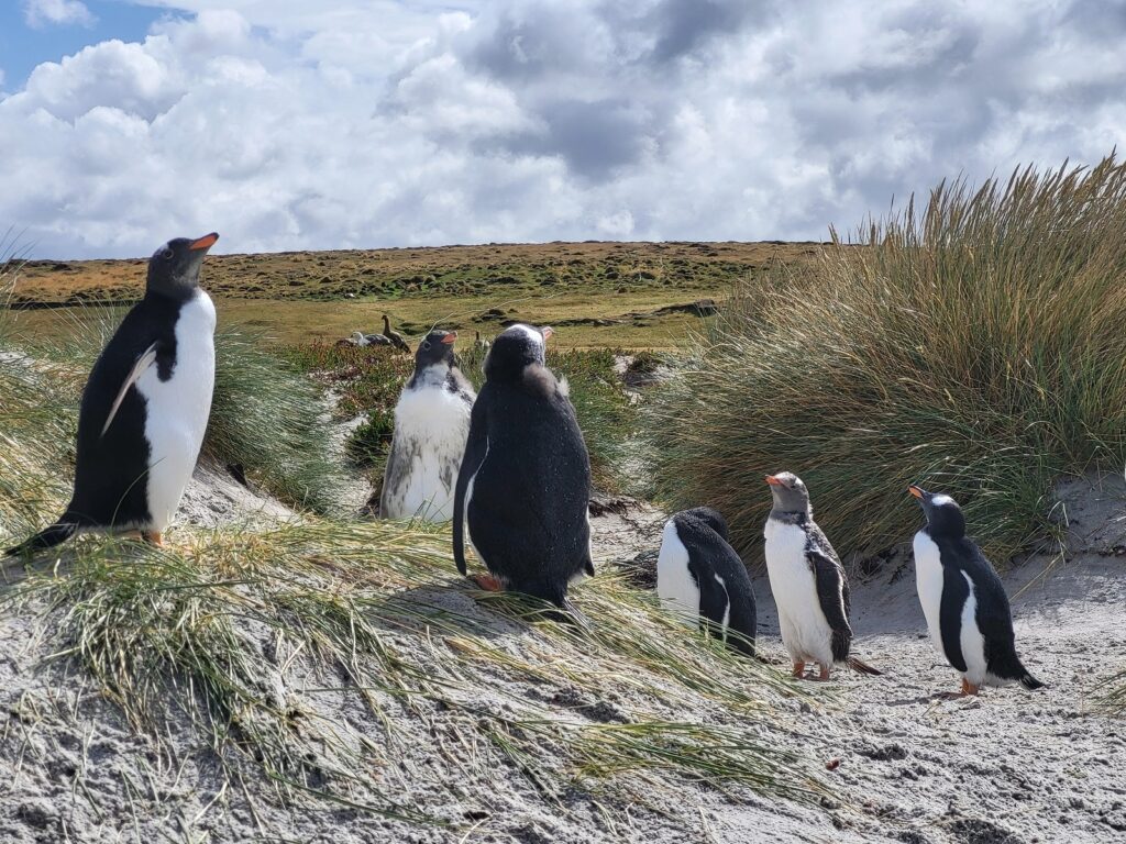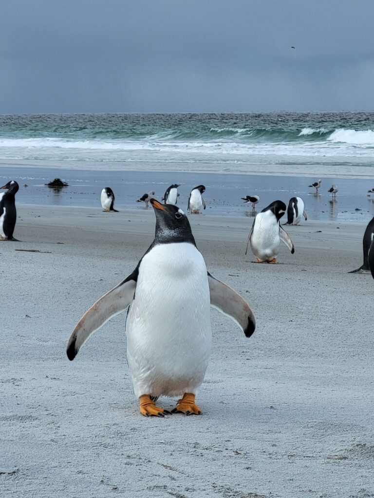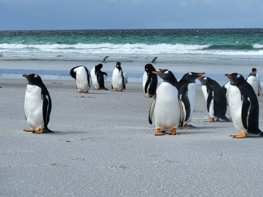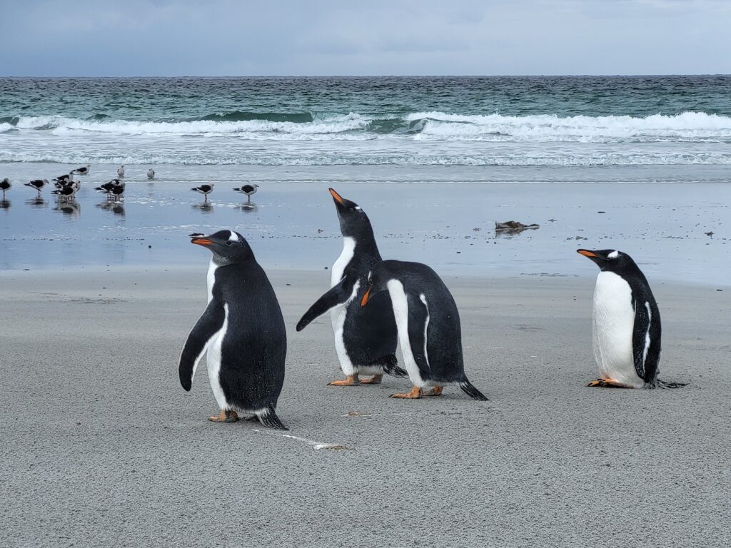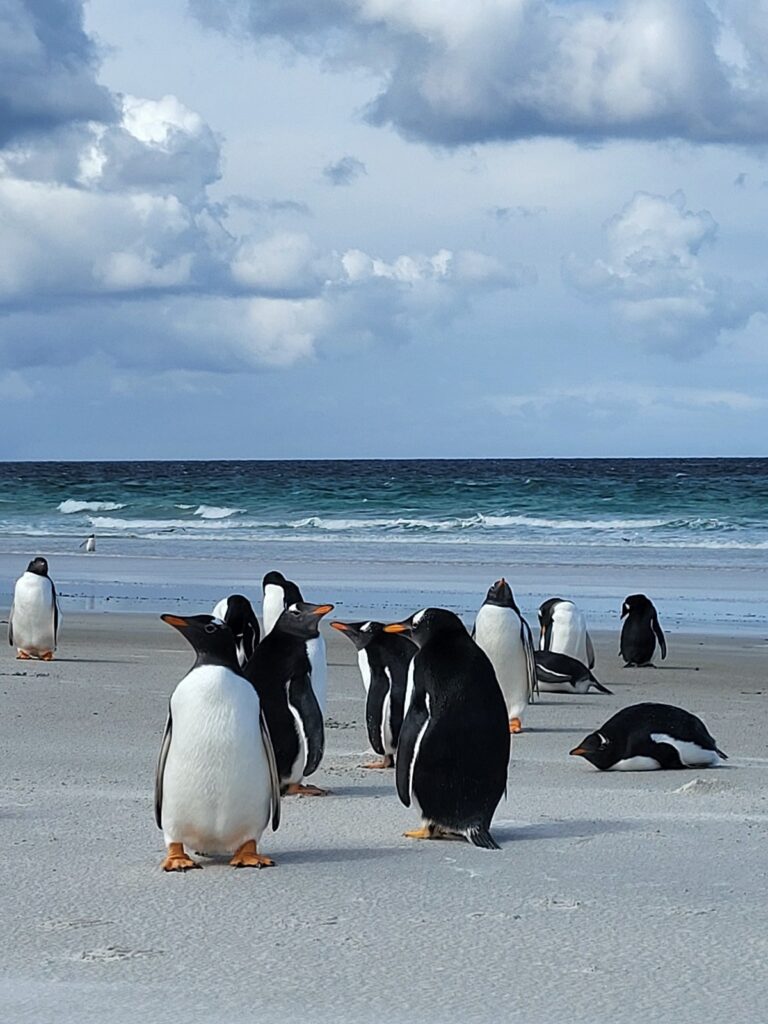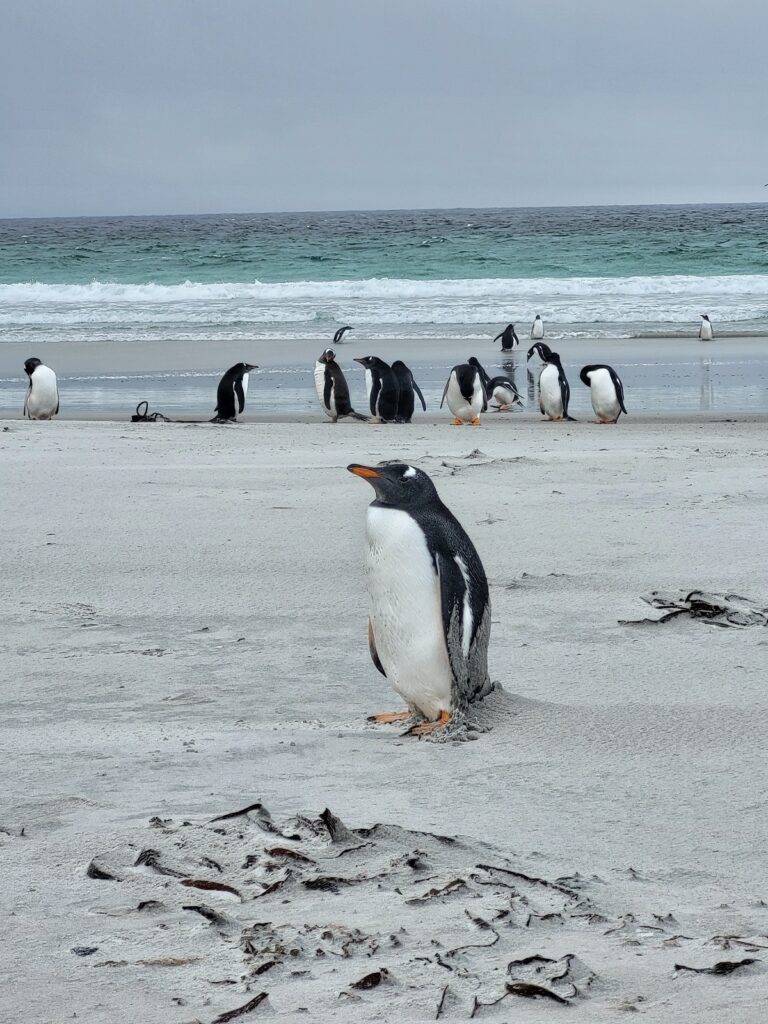 Pingviinit, voi että me nautimme niiden näkemisestä ja olihan ne söpöjä. Falklandinsaarilla me teimme retken tuuliselle Bertha’s Beach -rannalle, jossa elelee iso valkokulmapingviinien kolonna. Kyseinen ranta kuuluu RAMSAR-luetteloon ja olisin mielelläni viettänyt enemmänkin aikaa alueella tutustuen sen luontoon. Tunti paikan päällä vierähti nopeaan.