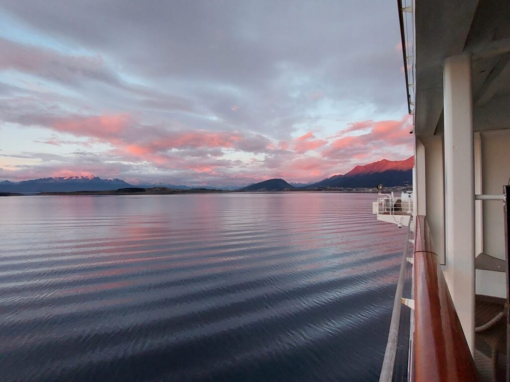 Lähtö Ushuaiasta oli upea. Seilasimme vuorten keskellä ja vastaan ui milloin valasparvia, pingviineitä kuin delfiinejäkin. Aluksen keulassa sijaitsevassa näköalabaarissa (Living Room) me vietimmekin aikaa kuunnellen livemusiikkia ja maisemia sekä valaita ihastellen.