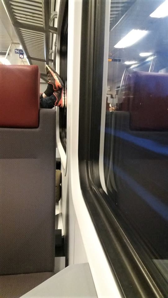 Kuvan henkilö ei liity tapaukseen. Satuin huomaamaan moisen matkustustavan eräänä aamuna silloin, kun kaikki junat oli vielä VR:n hallussa. Nopeasti tuli vartijat noukkimaan poikkeavasti istuvat miekkoset pois, kiitos läsnä olleen junahenkilökunnan. Oi niitä aikoja.