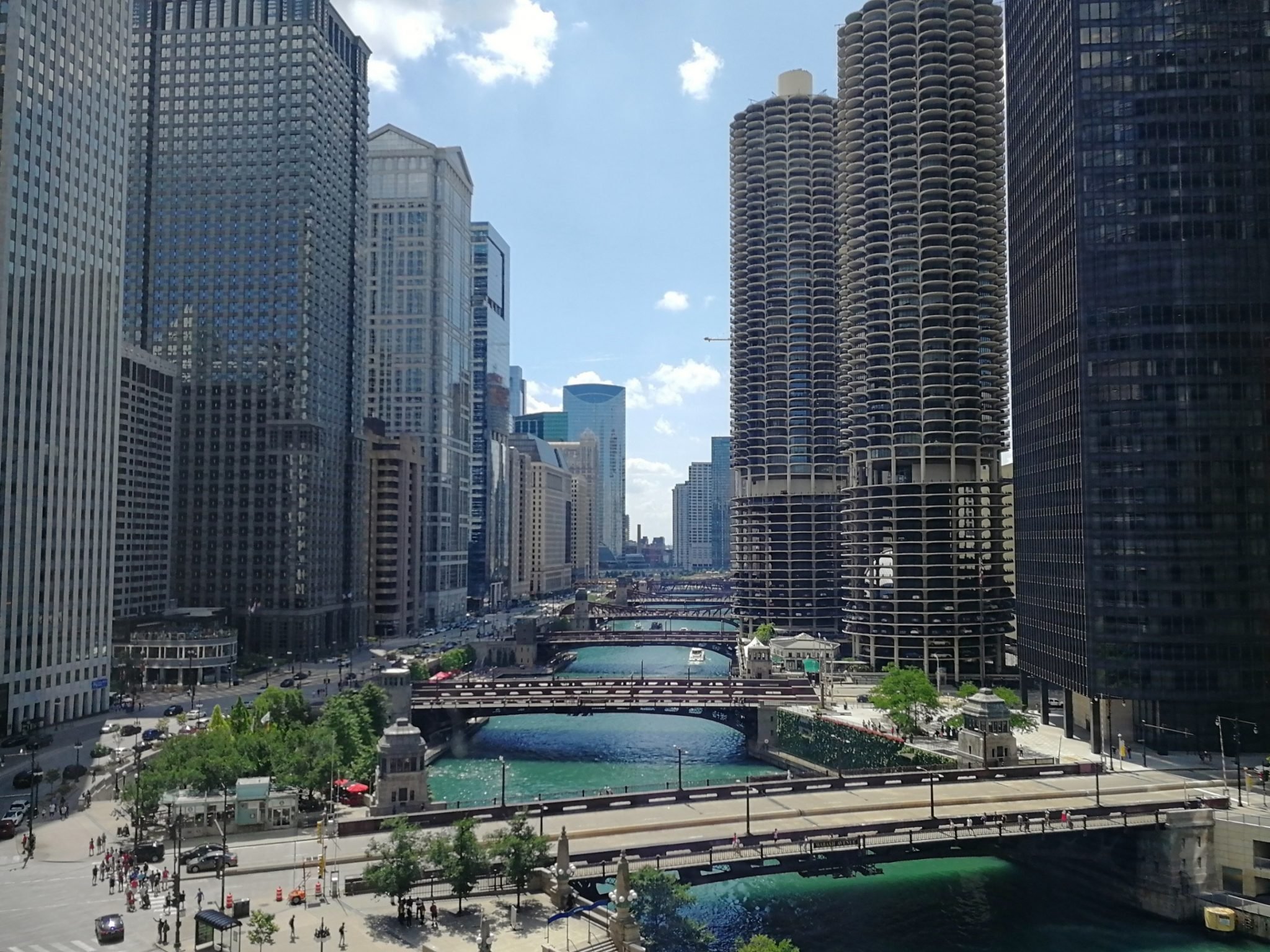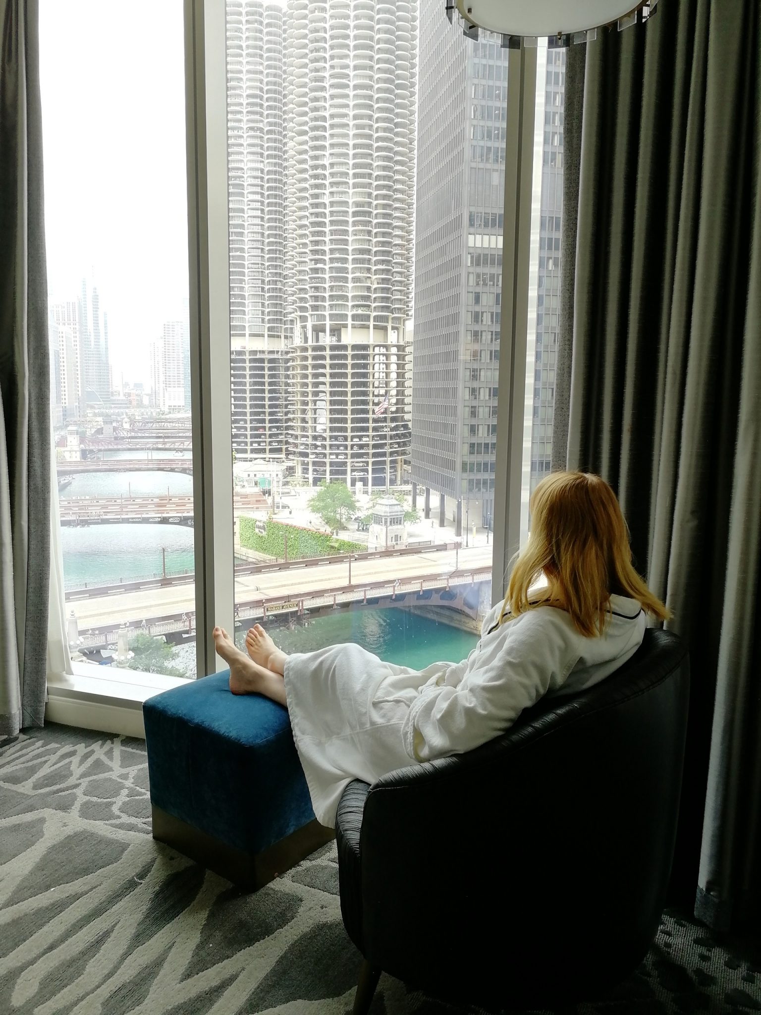 Mittavan muutosprojektin myötä, jossa historiallisen rakennuksen yhteyteen rakennettiin lasiseinäinen lisäsiipi, avautui vuonna 2016 tasokas luksushotelli LondonHouse Chicago. Me majoituimme tuossa hotellin uudessa lisäsiivessä, jonka lattiasta kattoon olevista ikkunoista oli suora näköyhteys joelle.