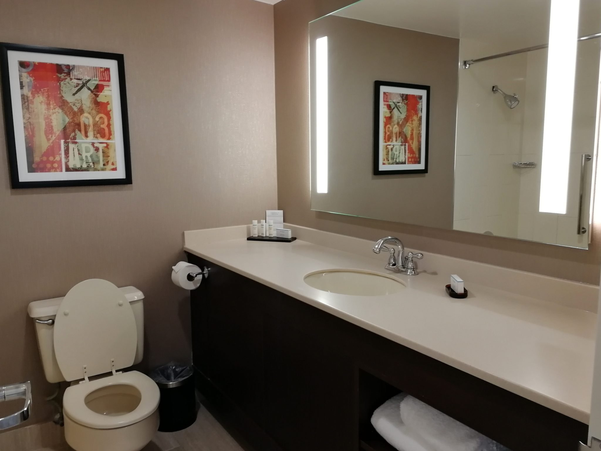 Yövyin mieheni kanssa vuorokauden ajan hotellin perushuoneessa (King Bed with sofa bed) ja kokoa sillä oli noin 27 m². Tilava huone oli siivottu hyvin ja mukavan kokoinen kulmasohva mahdollisti 42-tuumaisen television katselun molemmille huoneen asukkaille muuallakin kuin sängyssä. Huoneessa oli tyhjä jääkaappi, silityslauta ja -rauta, herätyskello ja kahvinkeitin, mutta tallelokero puuttui. Suihkukaapillinen kylpyhuone oli huomattavan tilava ja sieltä löytyi erikseen kampauspöytä. Näkymät huoneestamme oli tielle ja sen takana olevalle kiitoradalle päin, eikä yöllä lentokoneista ollut haittaa, mutta jatkuva liikenne ja varsinkin rekat aiheuttivat äänihaittaa ympäri vuorokauden. Ääniherkille huoneesta löytyi korvatulpat.