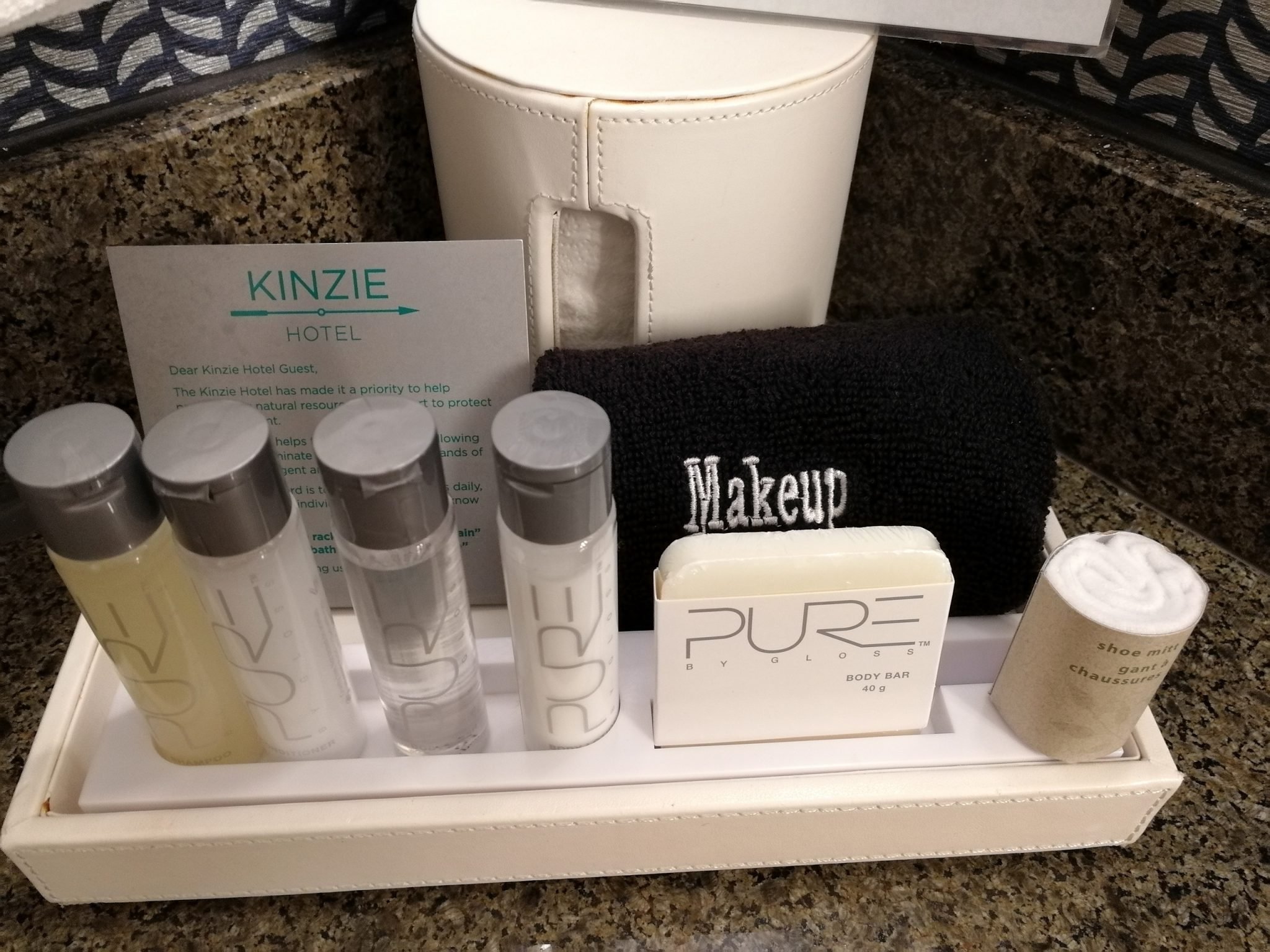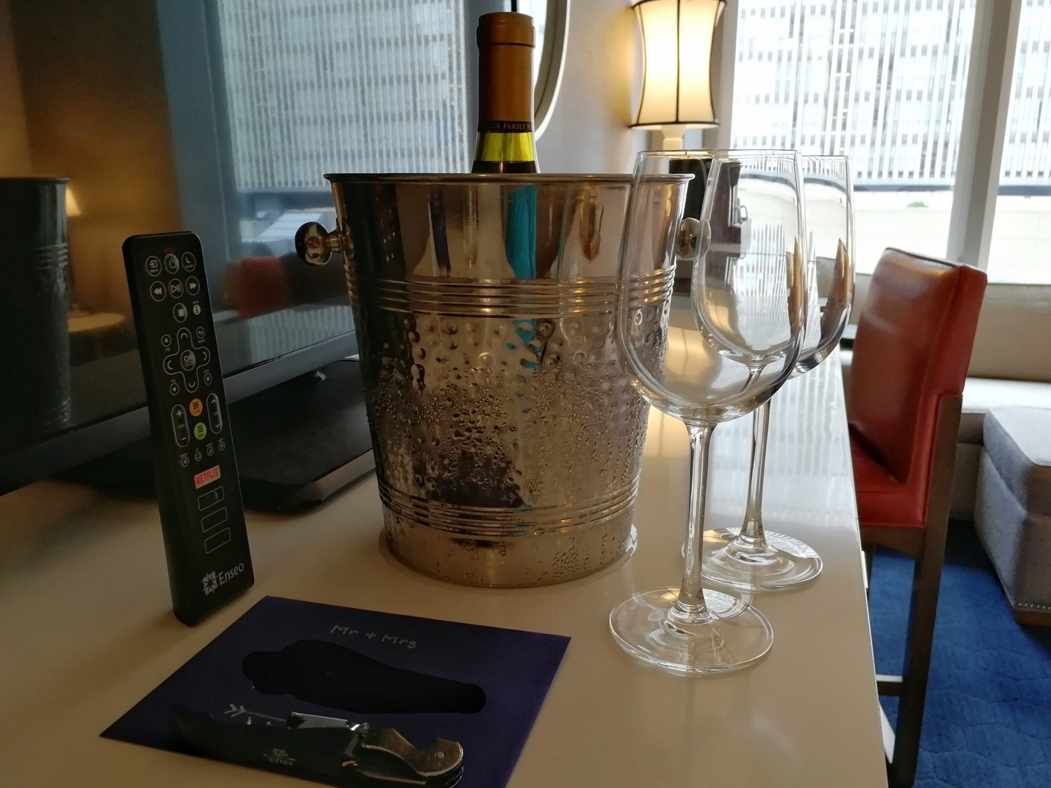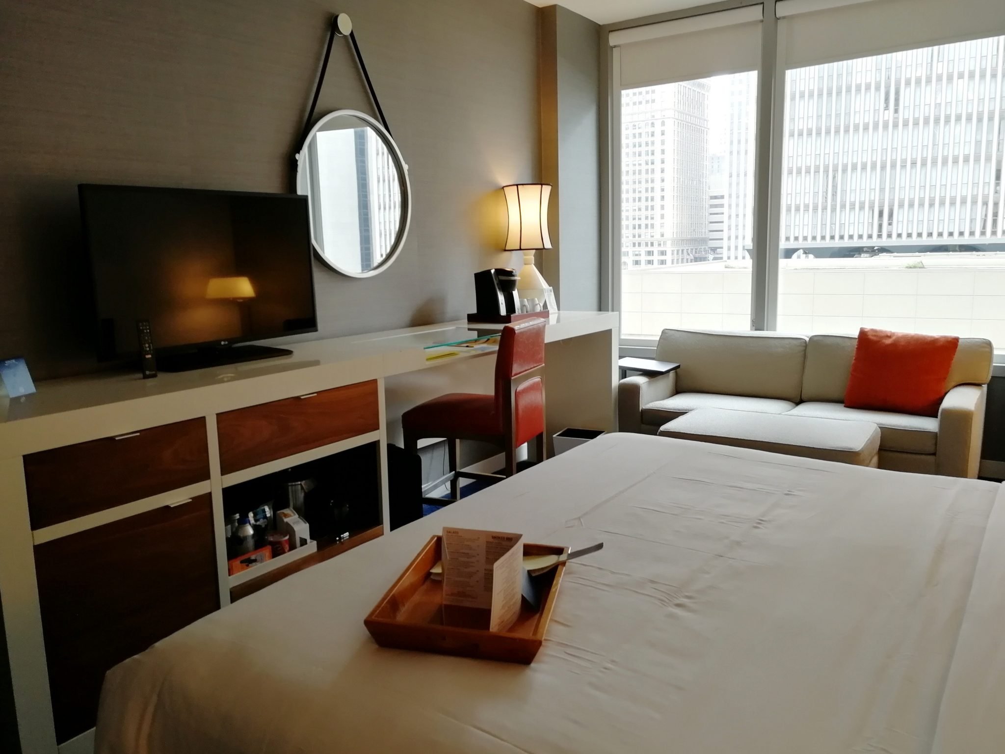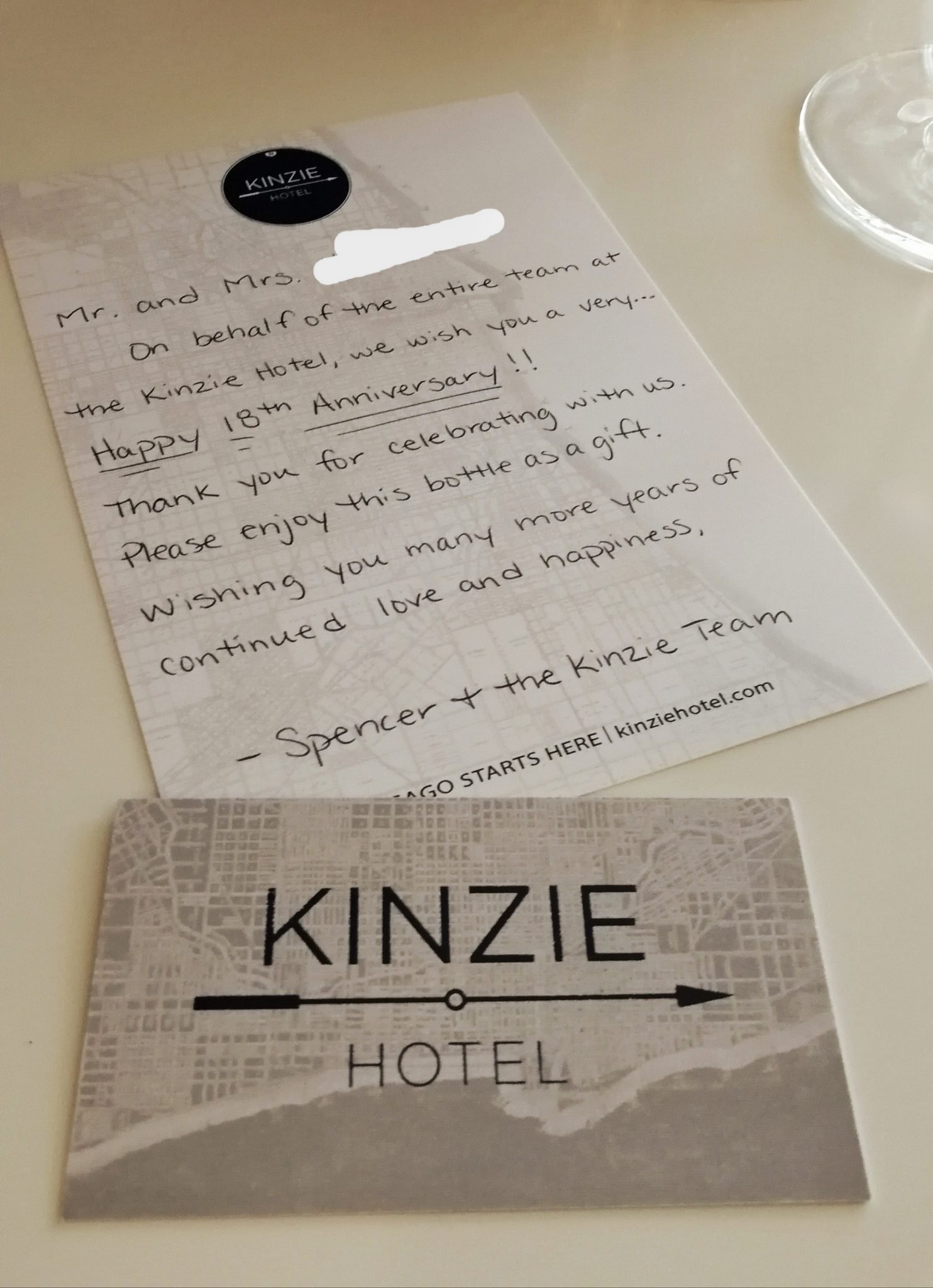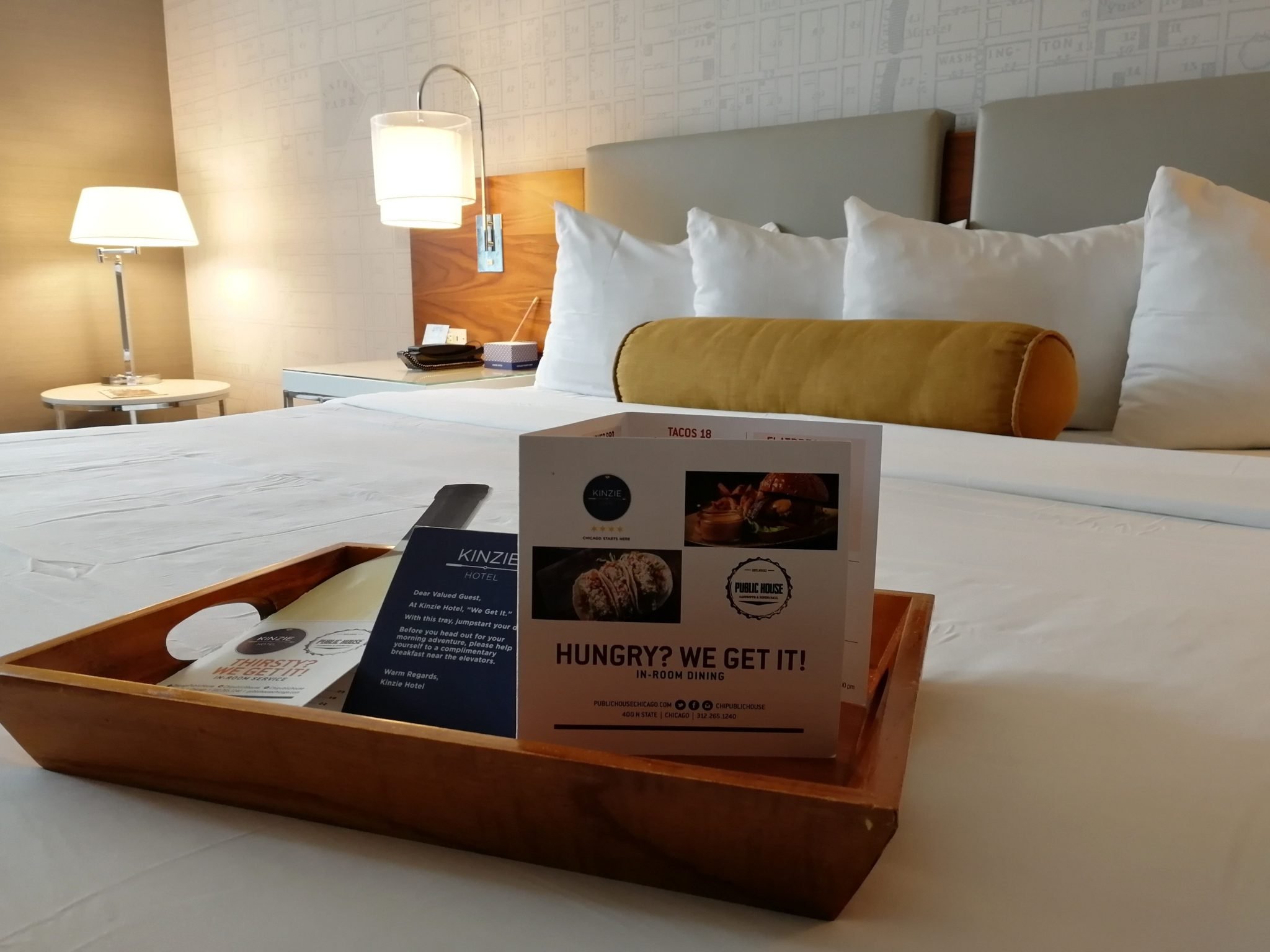 Edelliseen hotelliin verrattuna joen toisella puolella, muutaman korttelin päässä joen rannasta sijaitseva Kinzie Hotel on pieni, hyväntuulinen ja kodikas Boutique-hotelli. Rakennus ei ole kovin korkea ole ja näkymät ikkunasta siten jotain ihan muuta kuin LondonHousessa, mutta tämä hotelli pärjää hulppeille näköaloille palveluillaan. Huonehintaan kuuluu aina maksuton aamiainen sekä iltavastaanotto, jolloin tarjolla on ilmaisia juomia (viinit ja oluet mukaan lukien) sekä pientä purtavaa. Tuon lisäksi naapuriravintolaan saa 10 % alennuskupongin ja meidän aikana hotelli tarjosi asiakkailleen myös ilmaiseksi LiveNationin keikkalippuja lähellä sijaitsevalle klubille.