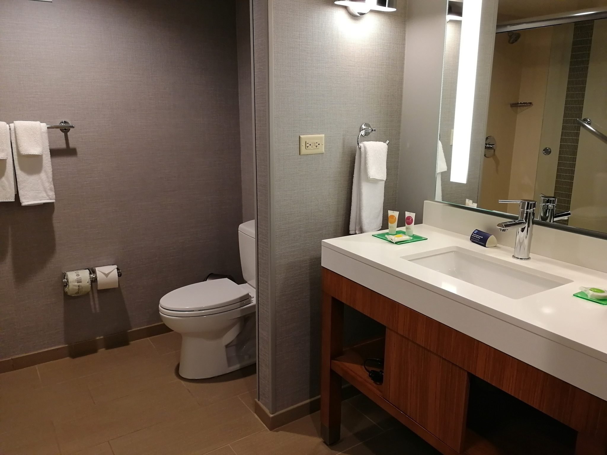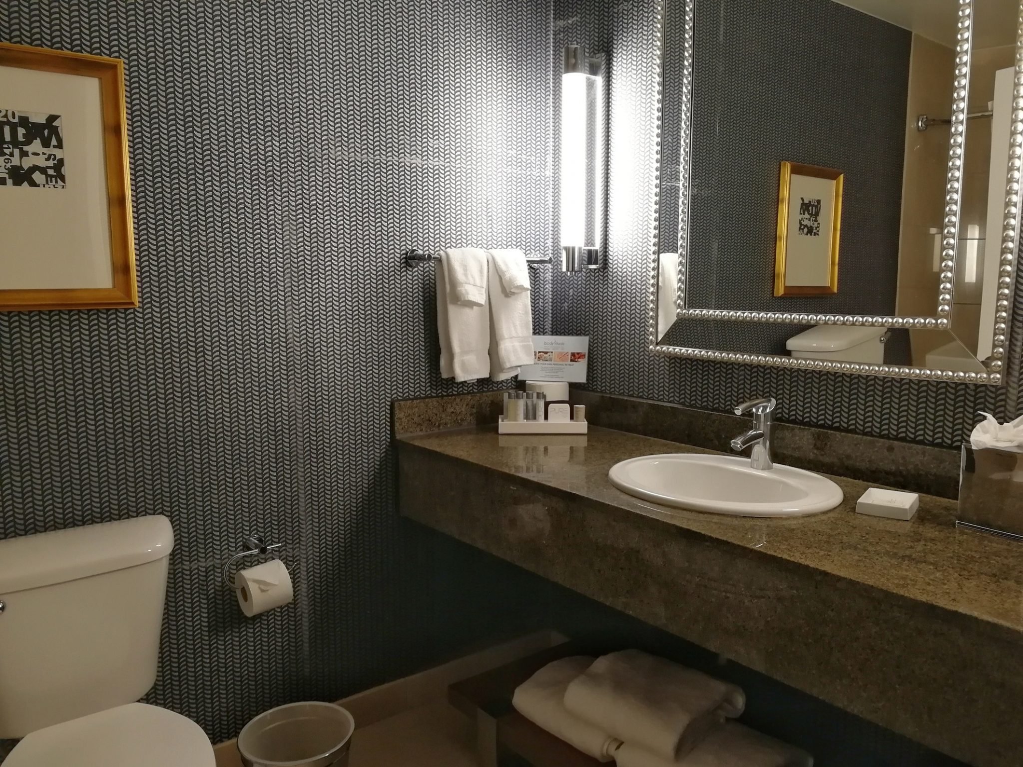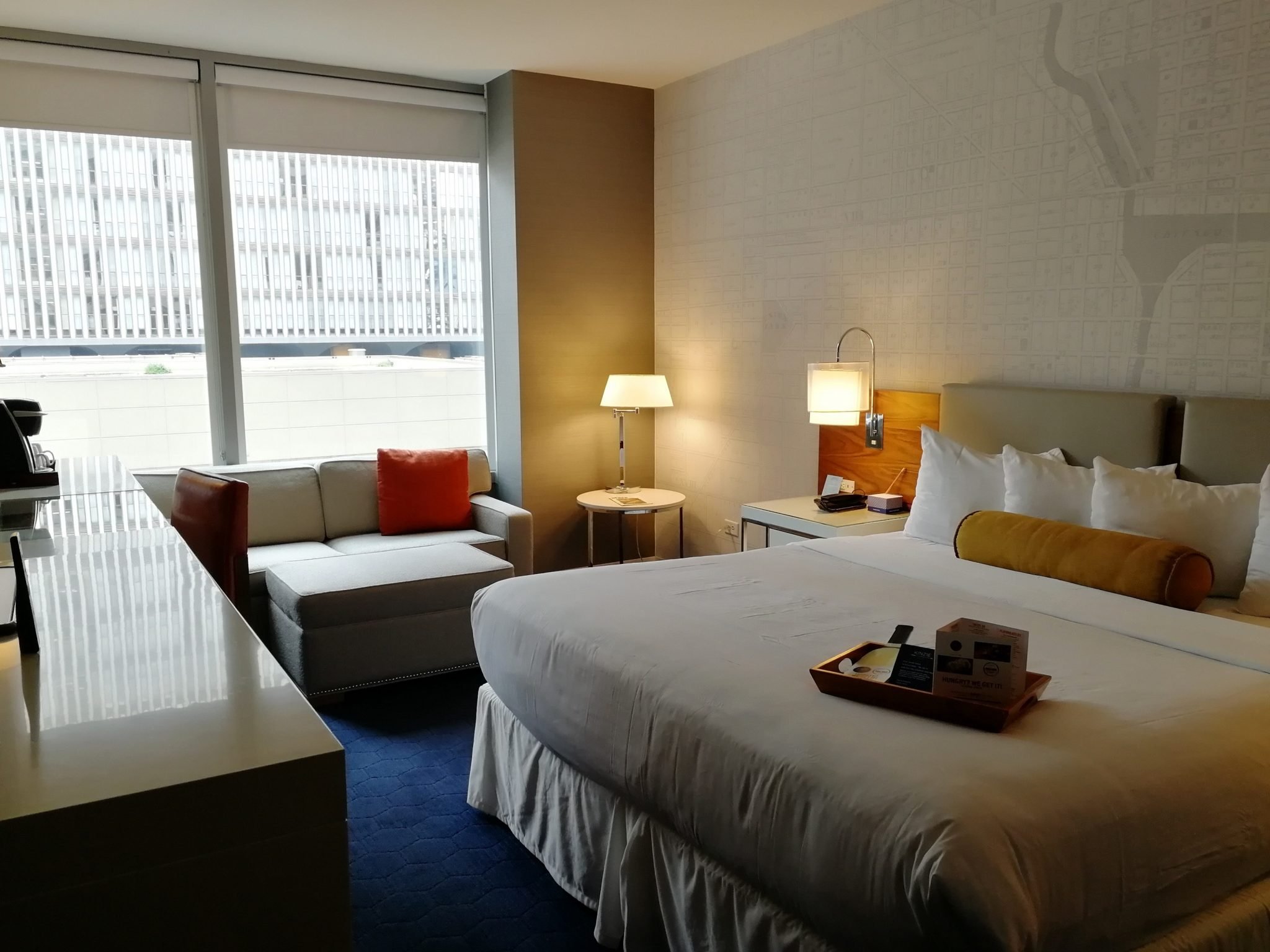 Hotelli on käynyt läpi laajan uudistusprojektin huoneita myöten ja remontti valmistui huhtikuussa 2019. Huoneet ovat kauniisti sisustettuja (värimaailma omaa silmääni miellyttävä) ja suuri atrium on saatu viihtyisäksi mm. sohvaryhmillä ja takoilla. Hotellissa on mm. uima-allas ja kuntosali, joita emme majoittumisemme aikana käyttäneet ollenkaan. Vastaanoton vieressä on pieni itsepalvelukauppa, jonka tuotteet maksetaan vastaanottoon. Kyseisestä kaupasta löytyy myös mikroaterioita, joita on hyvä lämmitellä oman huoneen mikrossa. Palvelu hotellilla (front desk), atriumin baarissa ja aamupalalla oli ystävällistä, mutta vajaan vuorokauden aikana emme sen enempää ehtineet asiakaspalvelua testata.