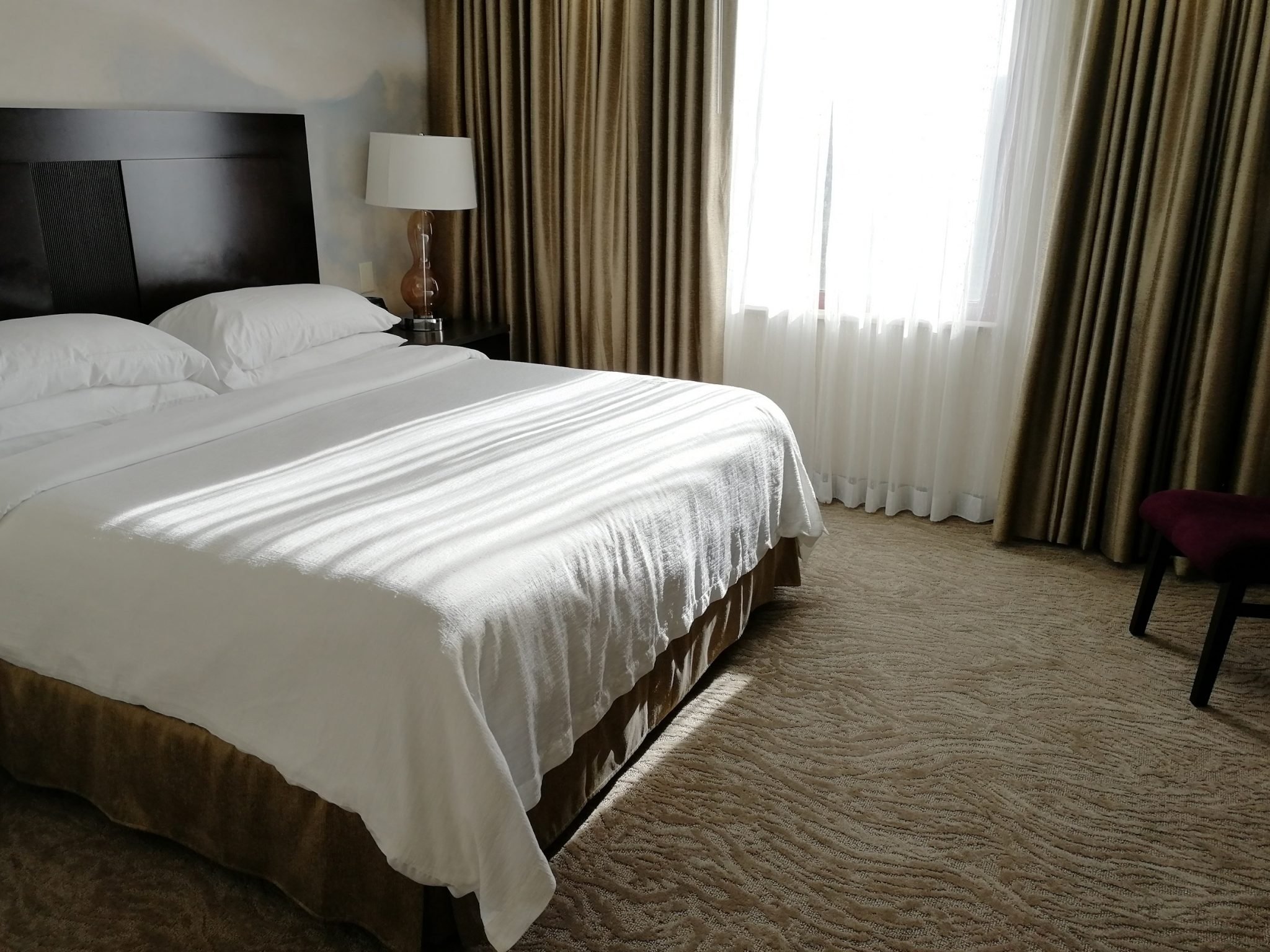 Me majoituimme 30 m²:n kokoisessa Deluxe City View King-huoneessa, joka oli siivottu hyvin. Huoneesta löytyi kaikki mukavuudet kuten iPod telakointiasema, kahvinkeitin, tyhjä jääkaappi, 42-tuumainen televisio, kylpytakit, silityslauta ja -rauta, pieni vaatehuone ja tallelokero. Kylpyhuoneessa oli matala kylpyamme ja ilahduin erityisesti meikinpoistoon tarkoitetusta pyyhkeestä. Yllätykseksemme hotelli toimitti myös pullollisen valkoviiniä huoneeseemme henkilökohtaisen onnittelukirjeen kera hääpäivämme kunniaksi.