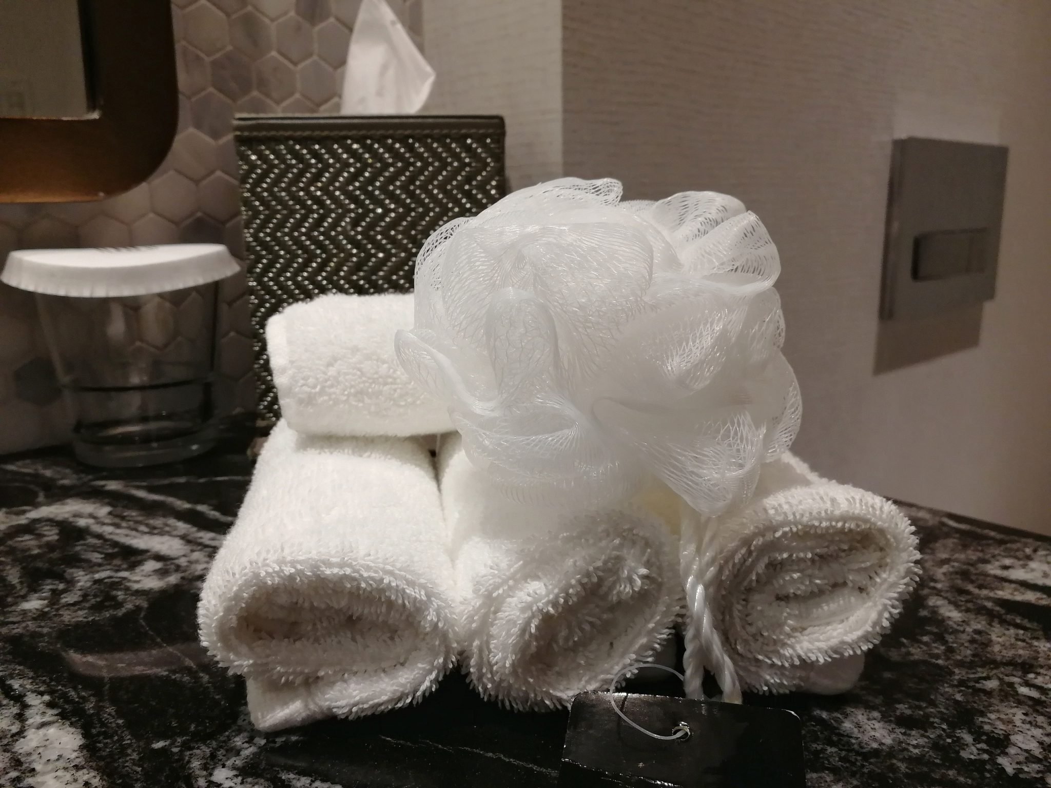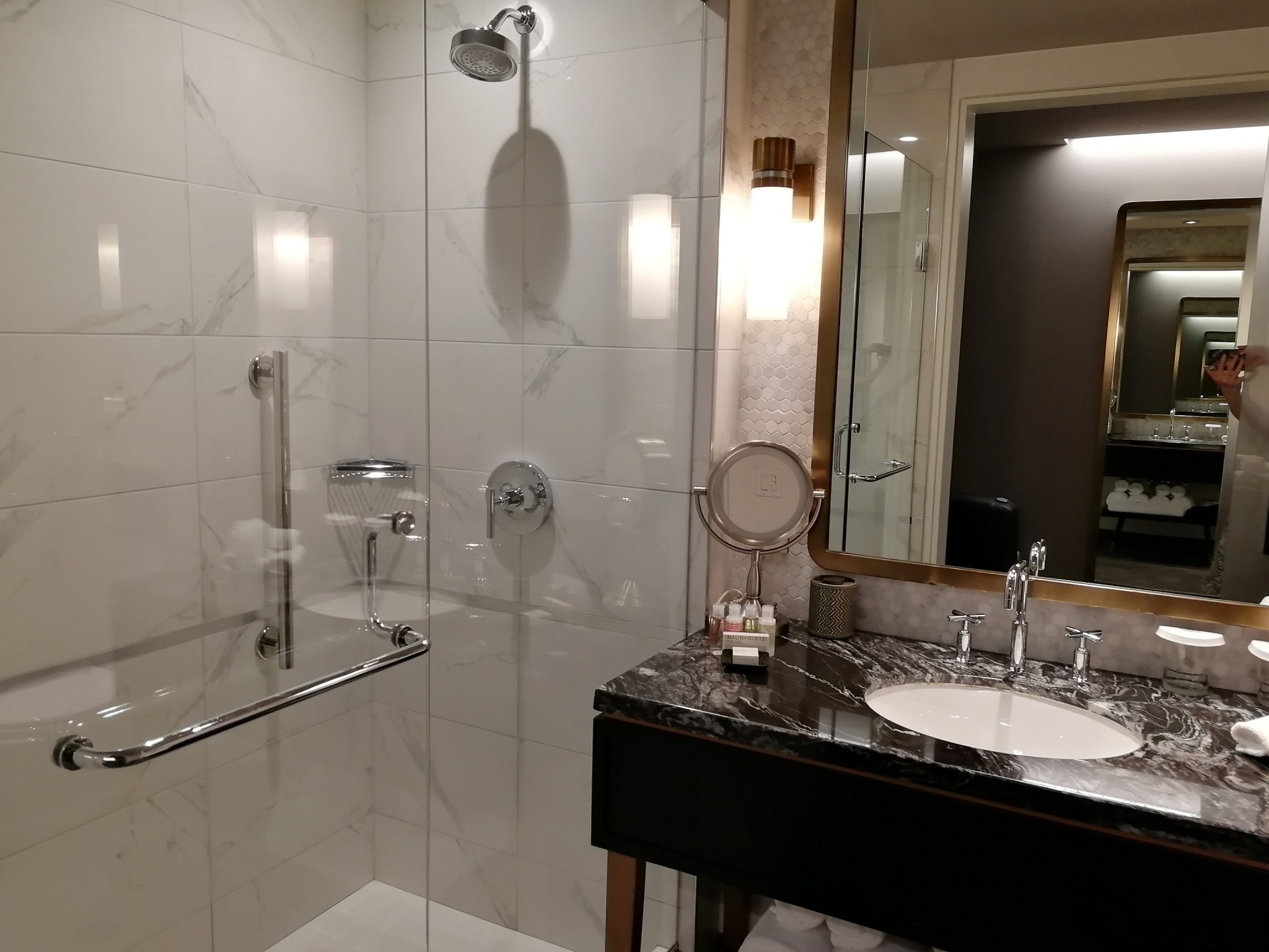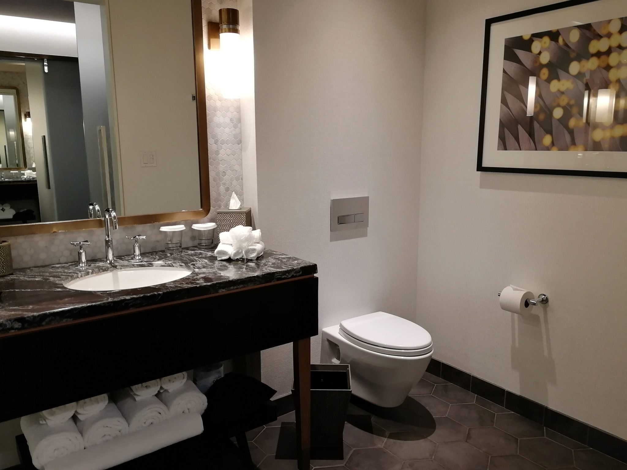 Huoneessamme, 37 m²:n kokoisessa Vista Suitessa oli erillinen makuuhuone ja oleskelutila sekä tasokas, luksusta huokuva kylpyhuone isolla suihkukaapilla. Siivous oli hoidettu hyvin täälläkin ja 55-tuumaiset televisiot löytyi sekä olohuoneen puolelta että makuuhuoneesta. Huoneessa oli mm. herätyskello, tyhjä jääkaappi, Nespresso-kahvinkeitin, silitysrauta ja -lauta, kaksi erilaista kylpytakkia (his and hers) ja -tossut. Kaikki huoneessa huokui luksusta ja esimerkiksi tallelokero oli vetolaatikkomallinen. Vaatteita ja tavaroita pystyi säilyttämään vaatekaapin lisäksi sängyn alapohjassa olevissa laatikoissa sekä yhden yöpöydän laatikoissa, mutta kyseinen ratkaisu oli mielestäni hieman epämiellyttävä. Selkävaivaisille huoneen tallelokero- ja laatikostoratkaisut eivät ole niistä parhaimpia, sillä kumartelemaan joutuu. Vielä erikseen pitää kuitenkin kehua kylpyhuoneen tasokkaita peseytymistuotteita. Tuoksunautintoja tarjoavat Malin and Goetz-tuotteet miellyttivät ja toivat ripauksen luksusta peseytymishetkeen.