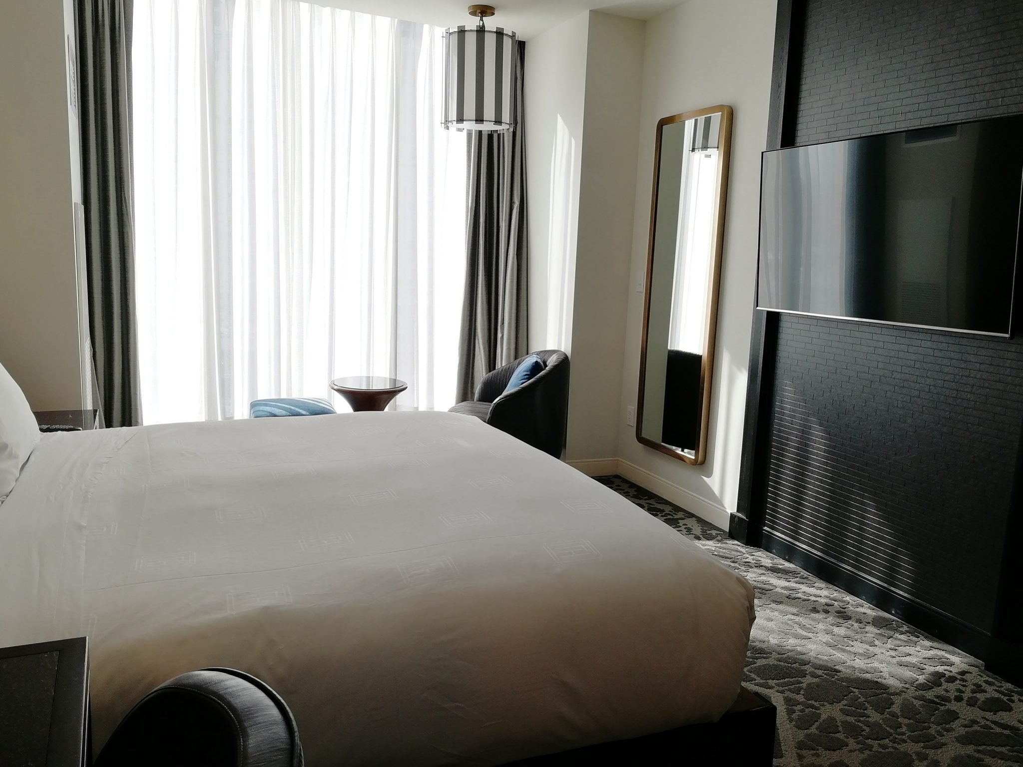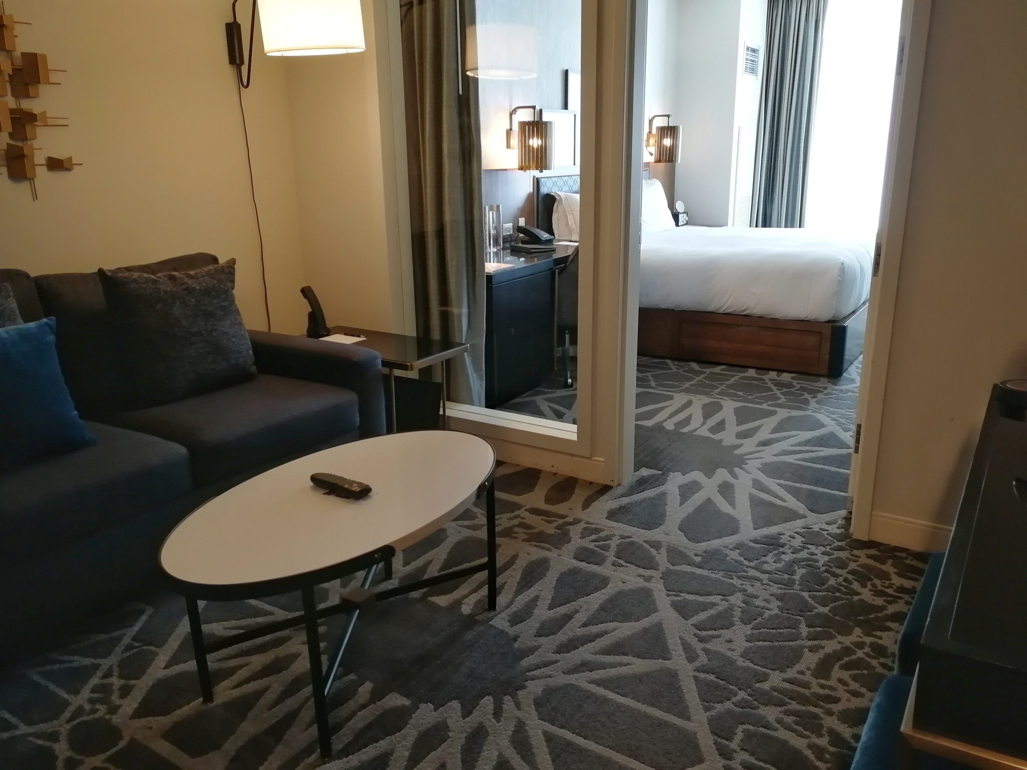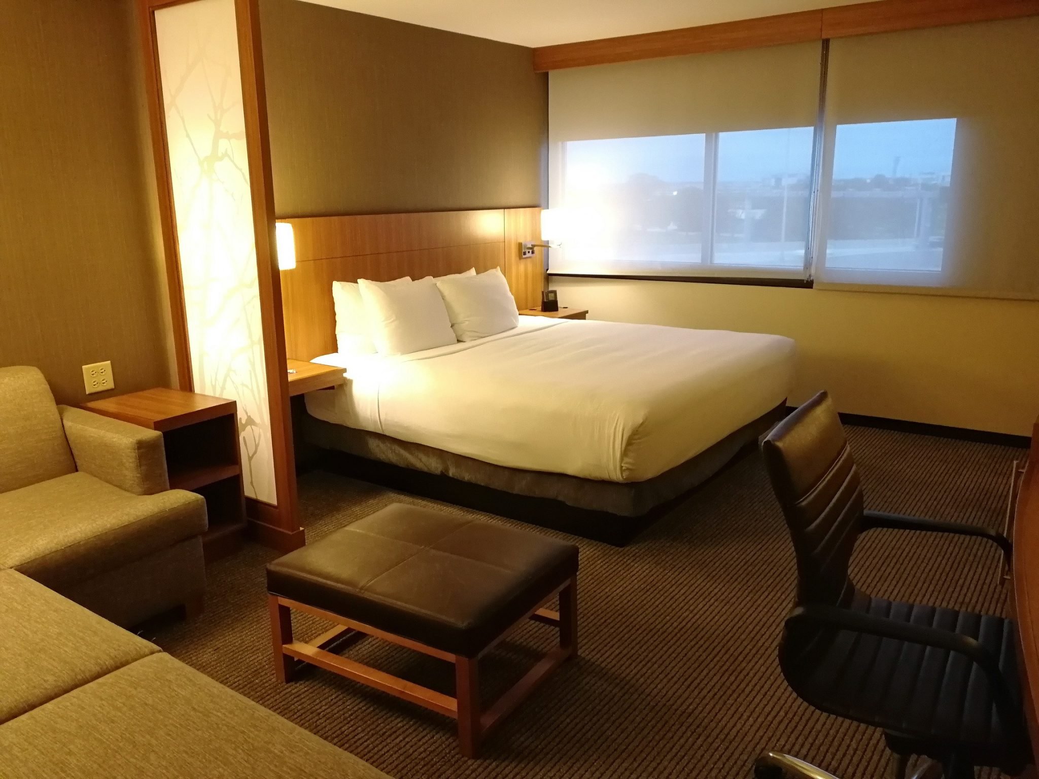 Lähes 60 m²:n kokoinen yhden makuuhuoneen huoneemme yhdellä King-kokoisella parisängyllä oli kaikkein edullisin koko hotellissa. Huoneemme sijaitsi hotellin kulmassa ja täten sen ikkunat olivat sekä olohuoneesta että makuuhuoneesta ulospäin, kun tavallisimmin huoneissa olevista olohuoneista oli sisäänkäynnin lisäksi ikkuna atriumin puolelle. Huoneessamme oli kaksi 49-tuumaista televisiota, herätyskello, mikroaaltouuni, tyhjä jääkaappi, kahvinkeitin, silityslauta- ja rauta sekä mukavan kokoinen tallelokero pienessä vaatehuoneessa. Kylpyhuoneessa oli matala kylpyamme ja pesytymistuotteet olivat Neutrogenan. Siivous oli hoidettu hyvin.
