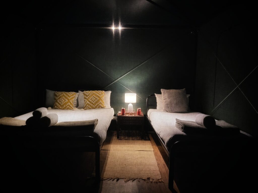 Yövyin mieheni kanssa kahdestaan kolmen hengen teltassa ns. rannan eturivissä, josta oli näkymät Sydneyn siluettiin. Teltassa oli parivuode ja yhden hengen vuode petivaatteineen, lisäpeitot, yöpöytä lamppuineen ja muutama sähköpistoke. Lisäksi teltasta löytyi pyyhkeet peseytymistä varten. Matkalaukut odottivat teltassa.