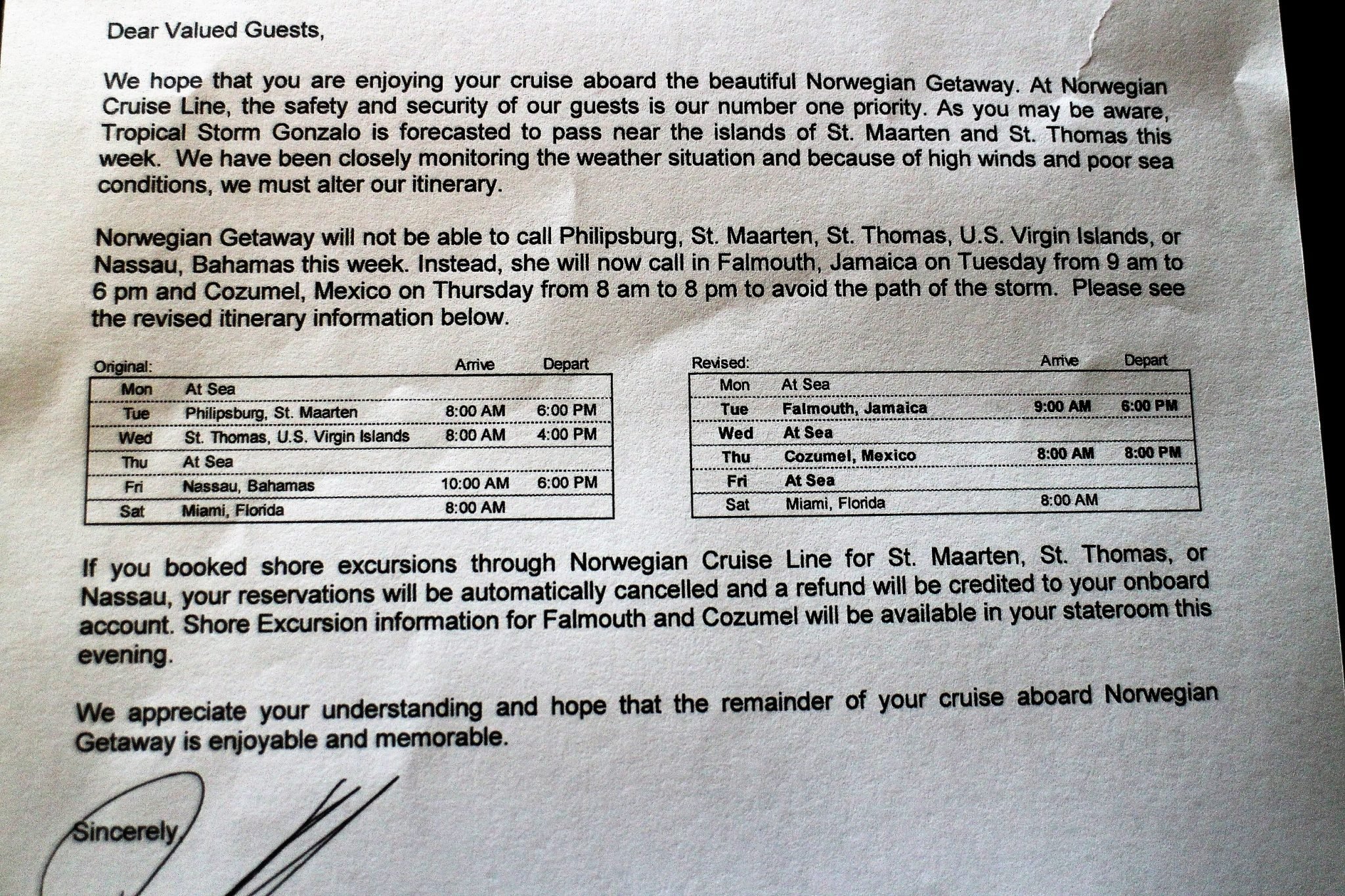 Laivayhtiölle reittimuutos teetti lisää töitä, sillä vaihtuneiden kohteiden myötä retket menivät uusiksi. Me sviittimatkustajat saimme uudet retkiluettelot käsiimme The Haven -alueella aikaisemmin kuin laivan muut matkustajat, jolloin laivayhtiö varmisti juuri haluttujen retkien saatavuuden meille. Samassa veneessä me kaikki matkustajat kuitenkin olimme, joten reittivahdoksesta tyytymättömät asiakkaat piti pitää tyytyväisinä ympäri laivaa. Se tarkoitti iloista mieltä, erityisen paljon näkyviä ”liibalaaba” -esimiehiä, juomaa ja valikoituja kuulutuksia. Siitä emme kuulleet, mitä muualla tapahtui ja meno jatkui sellaisena, kuin olisimme olleet normaalilla risteilyllä.