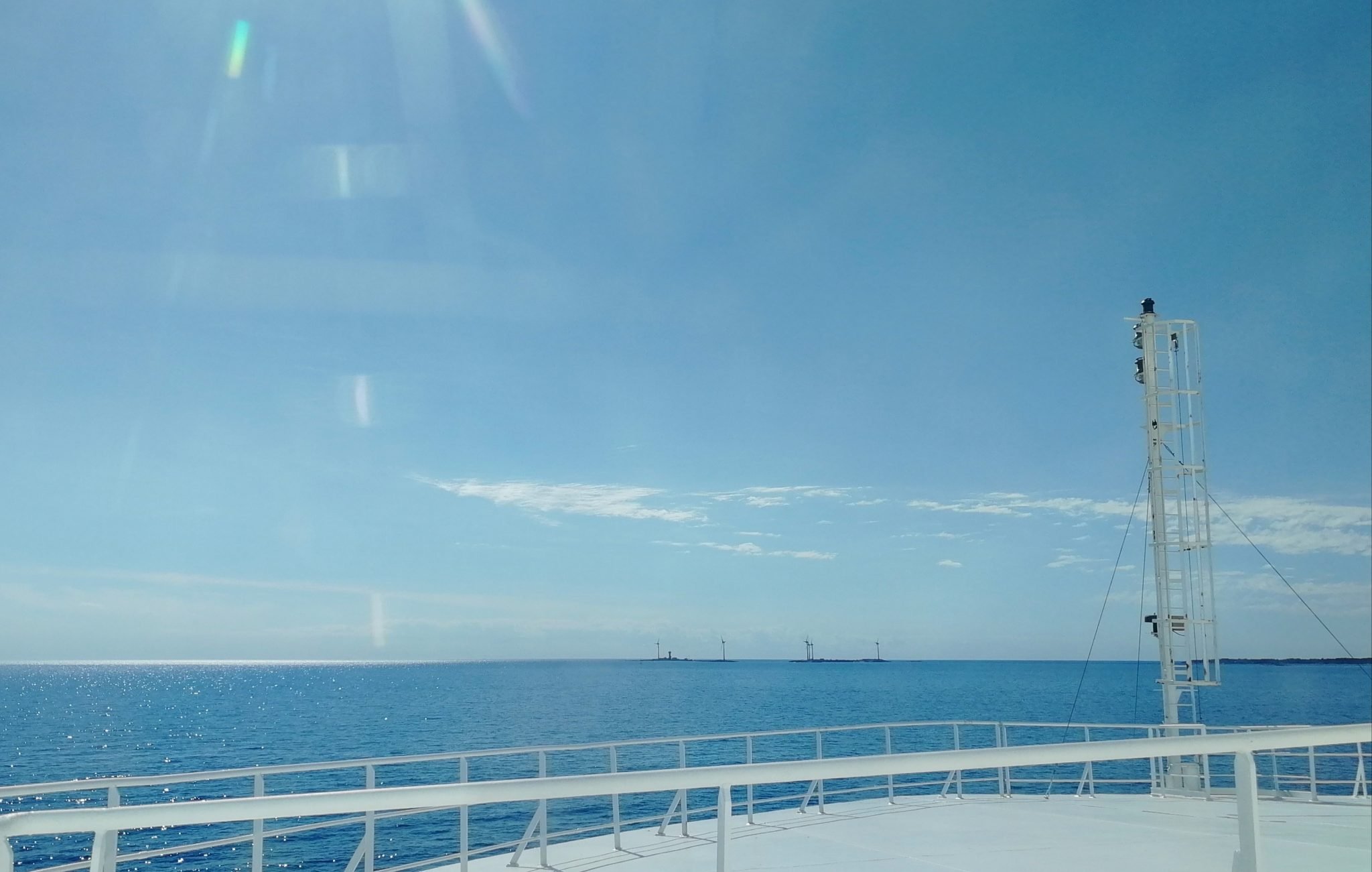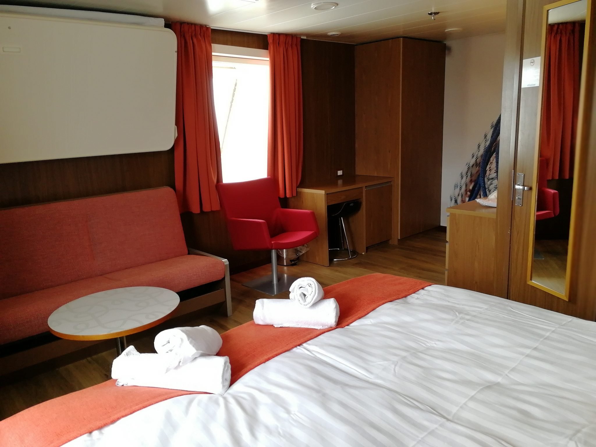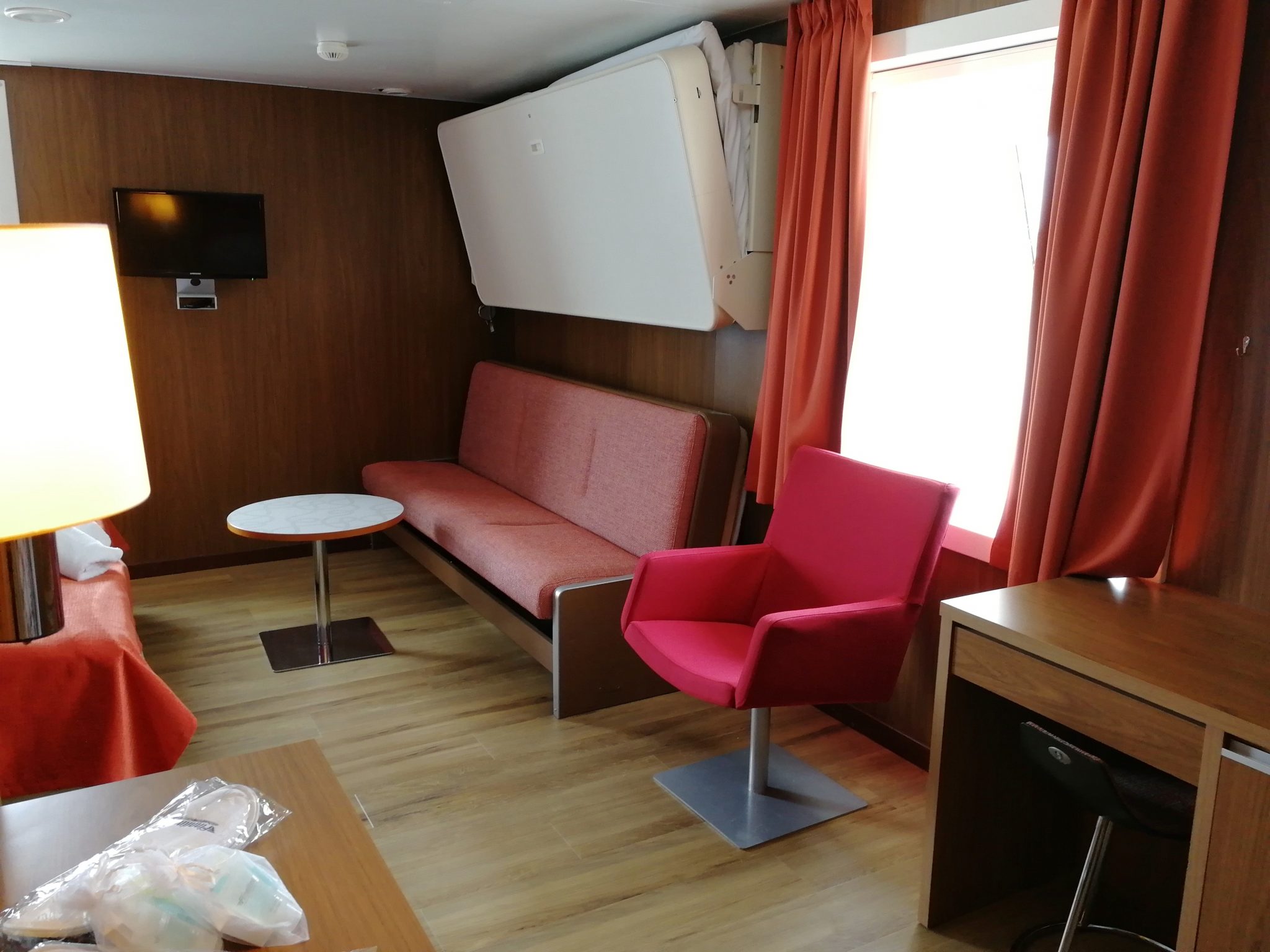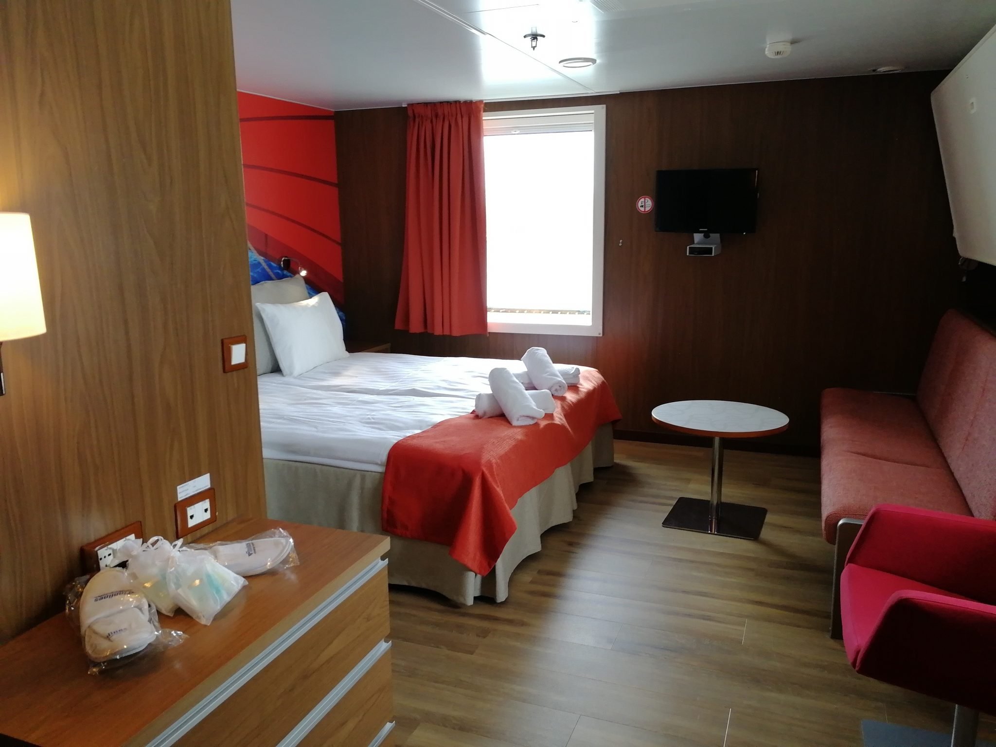 Hytin koko ja varustus oli hyvä. Sijainti kulmassa oli aivan huippu, sillä vaihtelimme lapsen kanssa paikkojamme ikkunoiden luona maisemien mukaan, keulan ikkunalaudalle mahtui todella helposti ja lapsikin sai aseteltua itsensä sivussa olevalle ikkunalaudalle. Pieni kylmänhiki minulle nousi ymmärtäessäni olevani samassa kerroksessa lemmikkien kanssa (haukuntaa lähikäytävällä), mutta yöksi laivalla laitettiin palo-ovet kiinni eikä lemmikkikäytävältä kuulunut pihaustakaan. Oma osansa hiljaisuudelle antoi tietysti yö ja se, että koiratkin nukkuvat, mutta tuolla pienellä eleellä (ovien sulkemisella) oli varmistettu rauha.