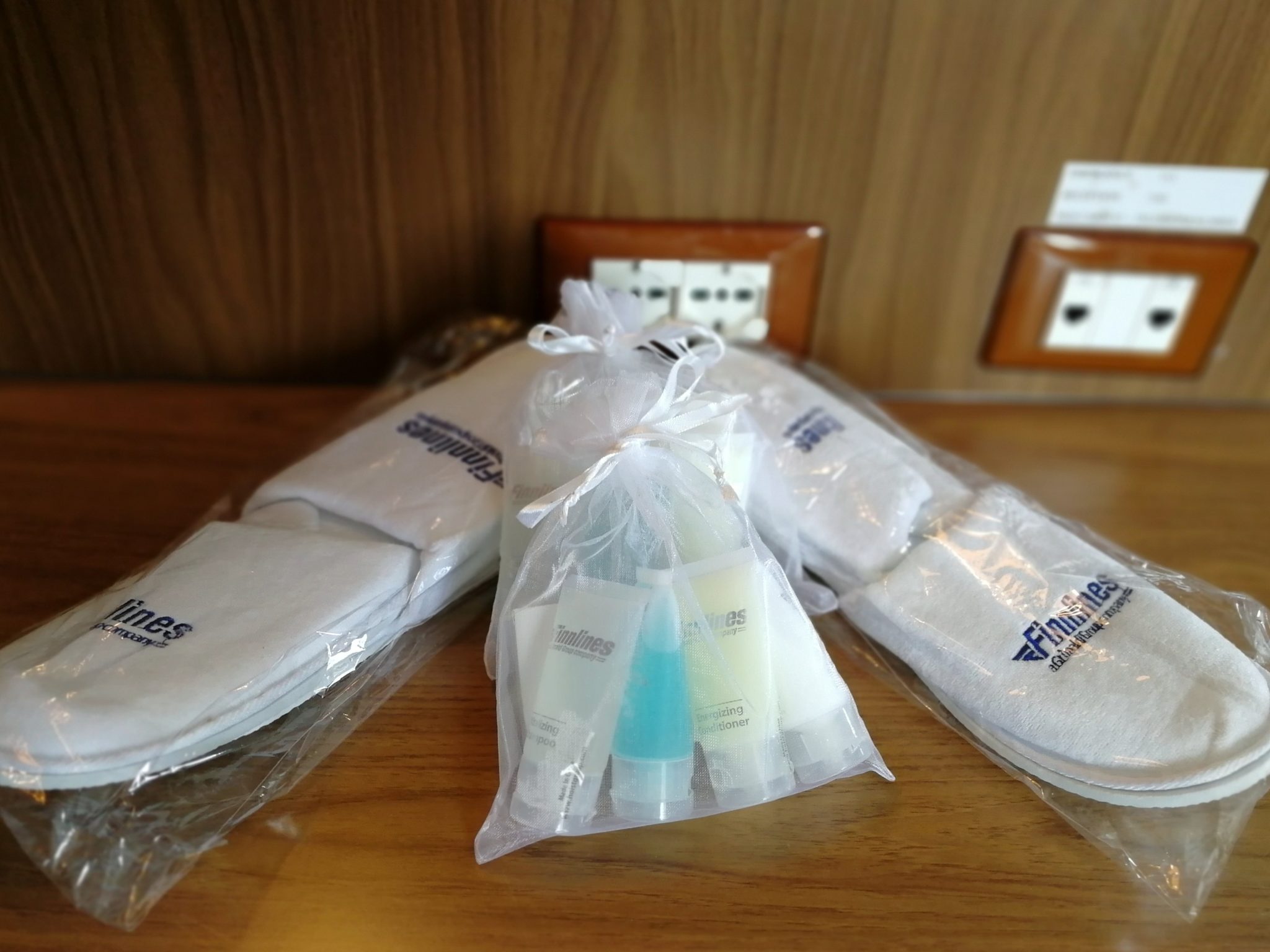Niin, mites me meidän hytti? Kokolattiamatto loisti poissaolollaan ja hyvä niin. Hytissä oli parivuode, yhden hengen vuodesohva ja ylävuode, satelliitti-tv, suihku/wc, hiustenkuivain, housuprässi, jääkaappi, tangollinen vaatekaappi tallelokeron kera, erillinen vaatelaatikosto, kirjoituspöytä, pikkupöytä ja muutama tuoli. Omassa hytissämme olleet kylpytossut sekä hygieniatuotepussukat tuli ylimääräisenä yllätyksenä, sillä ainakaan Finnswanin hyttejä koskevalla infosivulla niistä ei ole mainintaa. Kyseiset tuotteet löytyvät Helsinki-Travemünde -välillä Junior Pet Suite -hyttiluokasta ylöspäin.