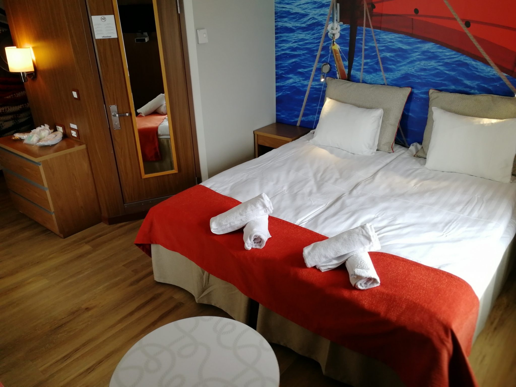 Finnlinesin Star-luokan aluksien parempia hyttejä on uusittu hieman tekstiileiltään ja hyttien tietyt seinätkin ovat saaneet merellisen printin. Niin myös meidänkin hytti, mikä teki hytistä hieman tumman, vaikkakin printti sopi rahtilaivatunnelmaan. Hyttimme sisustus oli sekoitus vanhaa ja uutta sekä hytti oli kaikin puolin siisti, mutta ikä/aikakausi näkyi kalusteissa ja esimerkiksi tangollisesta vaatekaapista puuttui vetimet ainakin vielä kesäkuussa. Jääkaappia ei tullut käytettyä, joskaan meidän reissulla se ei myöskään ollut päällä. Kylpyhuone oli hyväkuntoinen, siisti ja ekstrapiste napsahti suihkukaapille. Parisängyssä sai makeat yöunet, eikä selkää tai niskaa jomotellut aamulla. Lyhyellä reissulla emme ehtineet hytistä paljon nauttimaan, mutta jo nuo pienet hetket olivat oikein miellyttäviä hytissä ja teinikin muistelee merimatkaa vieläkin lämmöllä. Miksi?