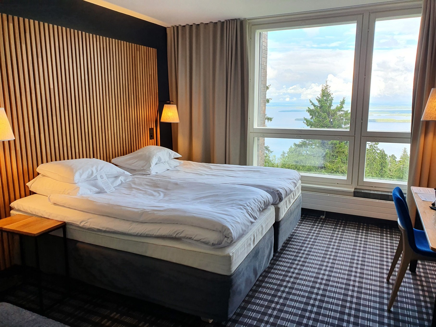 Break Sokos Hotel Kolin sijainti on kaikin puolin paras ever, sillä hotelli sijaitsee Kolin kansallispuistossa vaellusreittien vieressä. Näkymät hotellilta ovat mm. Pielisen suuntaan ja me valitsimmekin Superior Twin huoneen, josta oli varmat näkyvät Pieliselle. Voisi oikeastaan sanoa, että kaikki huoneessa vietetty aika meni suuren maisemaikkunan äärellä vaihtelevia näkymiä ihaillen ja huonevalintamme kruunasi kerrassaan nautinnollisen miniloman. Tulen tekemään erillisen postauksen tuosta Kolin visiitistä myöhemin.