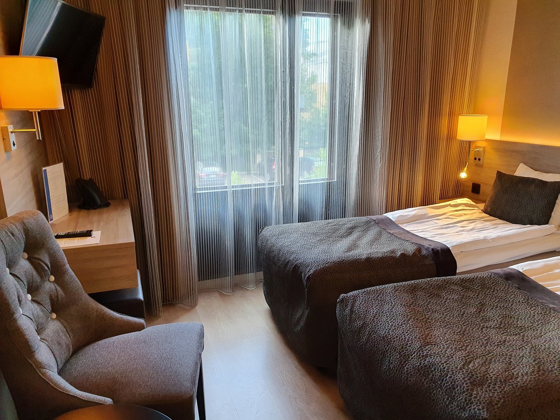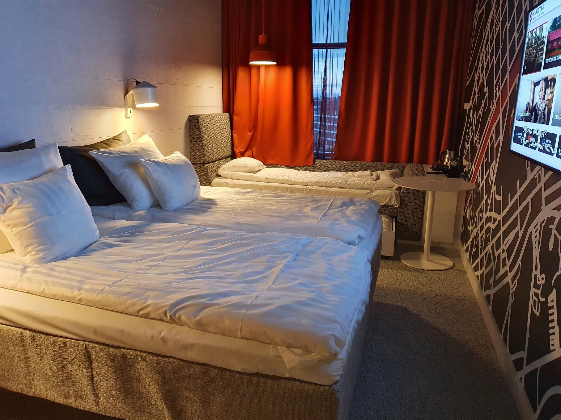 Huone (Standard Twin, mahdollisuus kahteen lisävuoteeseen) oli omaan makuuni ehkä hieman liian tumma ja värikäs, mutta kaikin puolin näppärä ja mikä parasta, yhteen huoneeseen mahtui koko perhe. Hotellin parkkihalli oli jo täynnä emmekä saaneet autoa enää sinne, mutta hotellin taakse sai auton parkkiin edullisimmalla vaihtoehdolla 10 eurolla 24 tunniksi. Hotellin aamupala oli oikein kattava ja ruuhkasta huolimatta tilaa löytyi varsinkin ravintolan kakkoskerroksesta. Ravintolan miljöö miellytti omaa silmää kovasti ja olisihan sitä mielellään aterioinut siellä muutoinkin. Hinta yölle 137 euroa.