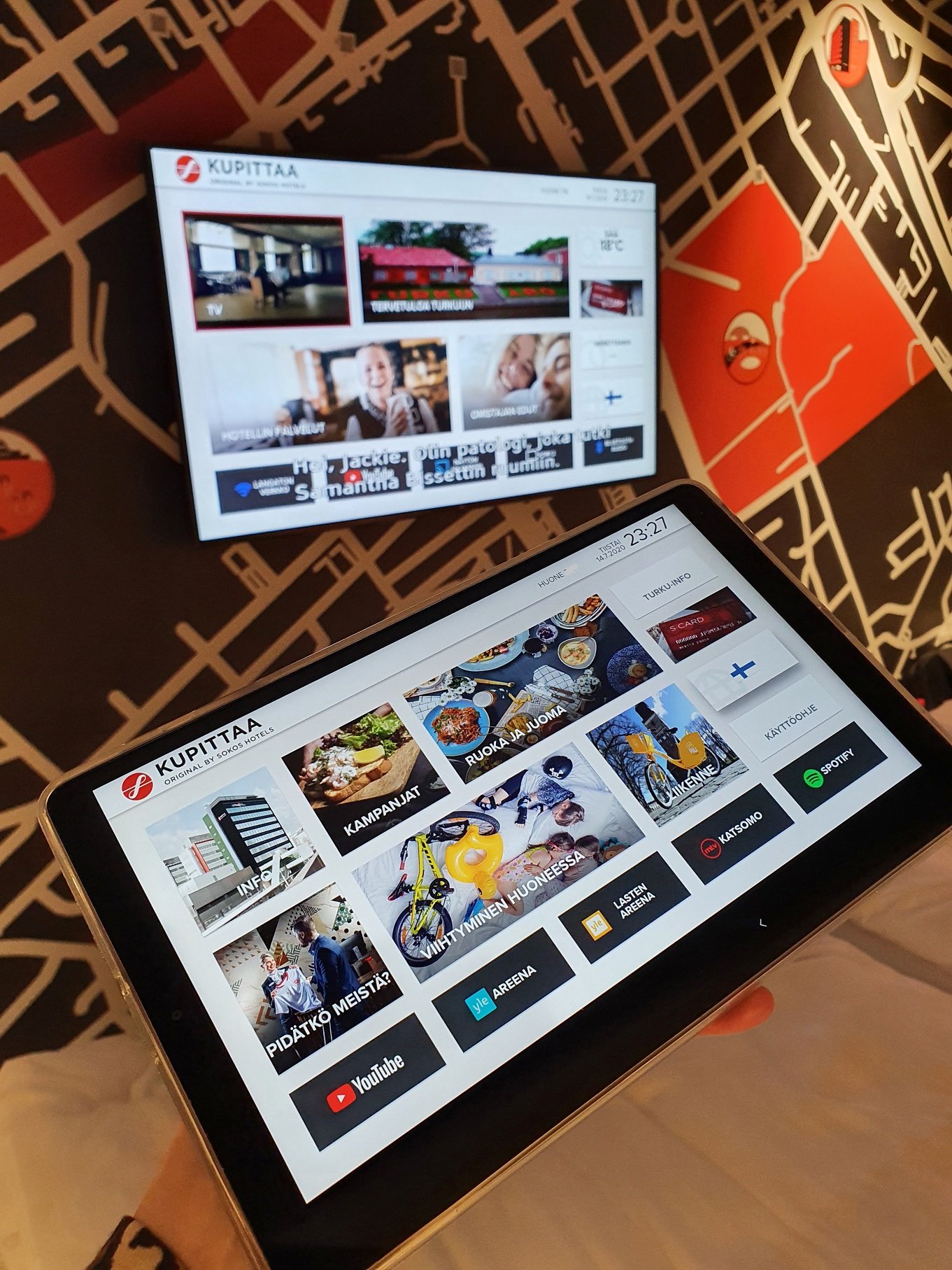 Huoneen seinällä ollut kartta ja siihen liimatut QR-koodit olivat muuten aikas näppärä juttu huoneessa. Siitä vaan skannaamaan koodi ja katselemaan, millainen vinkki Turkkuseen on tarjolla koodin takana.