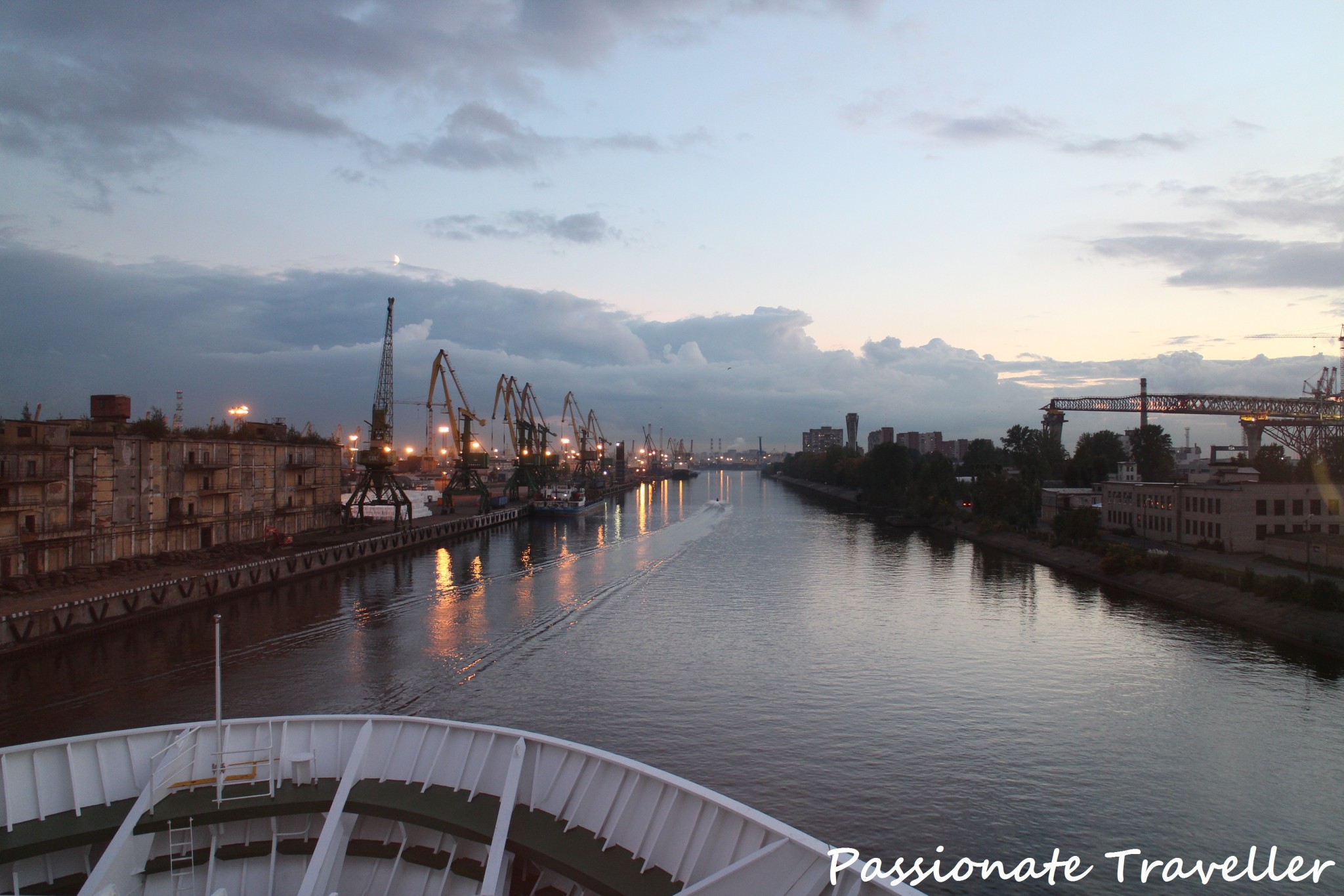Harvoin minä kohdesataman lähtö- ja saapumismaisemia kehun, mutta nyt kyllä osui ja upposi tähän naiseen. Laivan lipumisessa hiljaa karun teollisuusalueen läpi oli jotain hyvin majesteettista. Nähtävää oli pitkäksi aikaa, joten suosittelen tulevia Pietarin risteilymatkustajia hakeutumaan ikkunan äärelle taikka laittamaan kunnon vaatetuksen ulkokannelle Pietarin puolella.