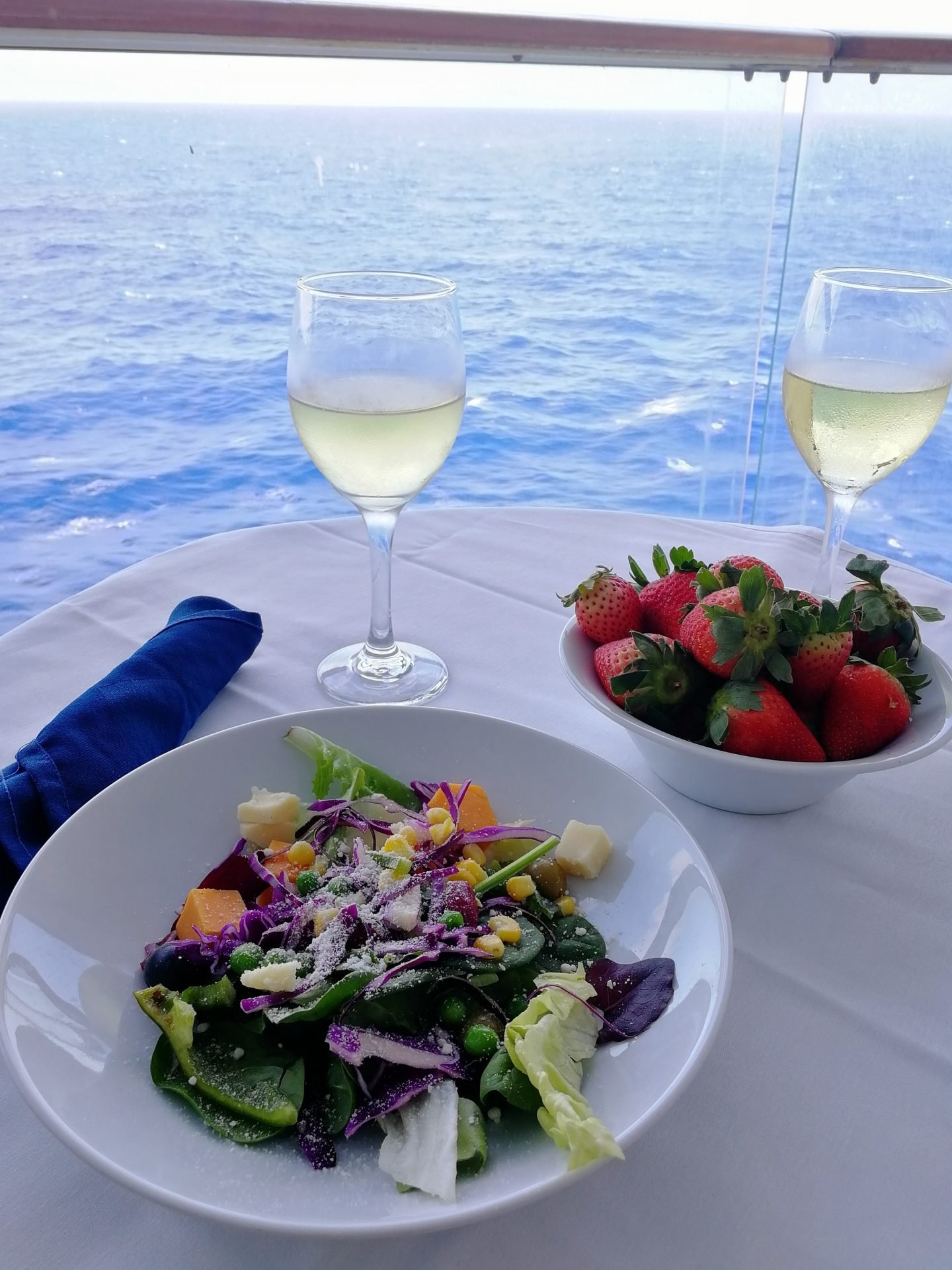 Itse koottu salaatti, mansikat, kuvasta piilotettu miehelle kuuluva pizzalautanen ja pari lasia viiniä buffetista ulos kannettuna tasan nolla euroa.