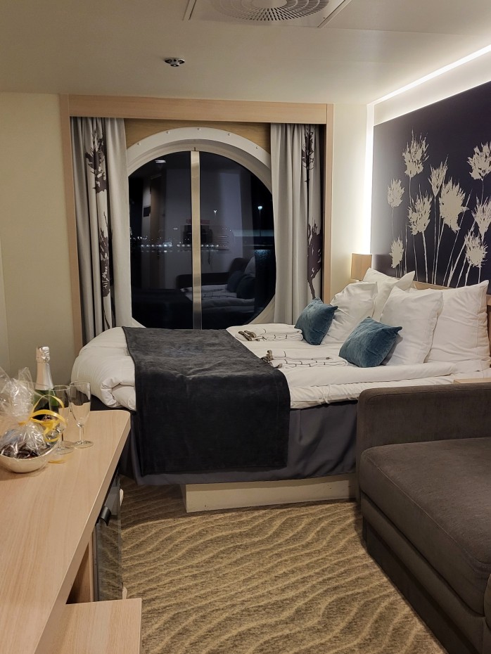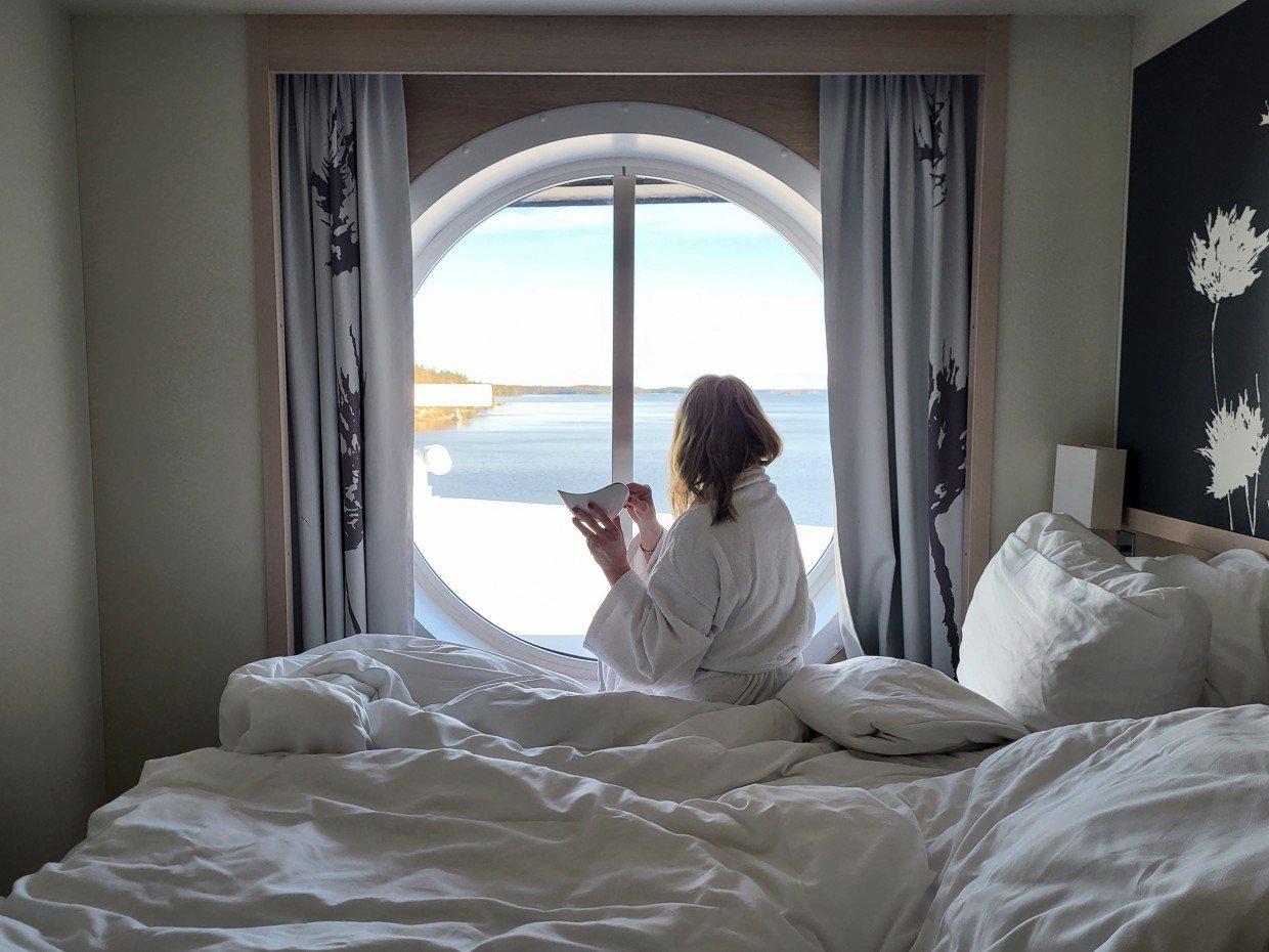 Itämeren parhaasta viihteestä se oikeastaan lähti. Meidän synttäriviikonlopulle nimittäin osui Flame Jazz-risteily ja sen ympärille me sitten väsäsimme mahtavat puitteet romanttiselle risteilylle. Kaikki sviitit oli jo varattu, joten varasimme Premium-hytin keulasta ja esitimme vielä toiveen siitä, että hytin sänky olisi ikkunan puolella. Toive meni läpi ja siitähän tämä merimaisemien ystävä tykkäs.