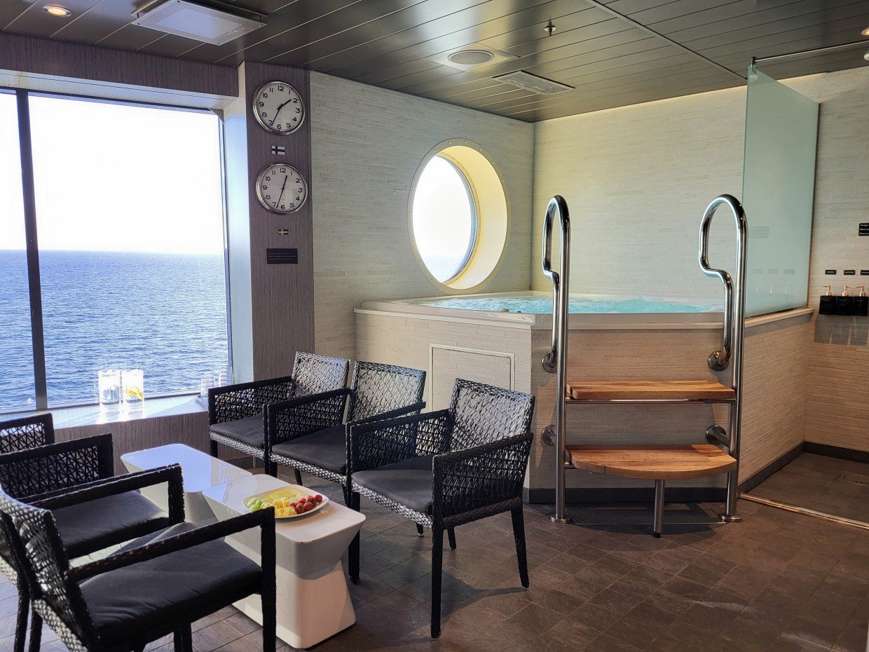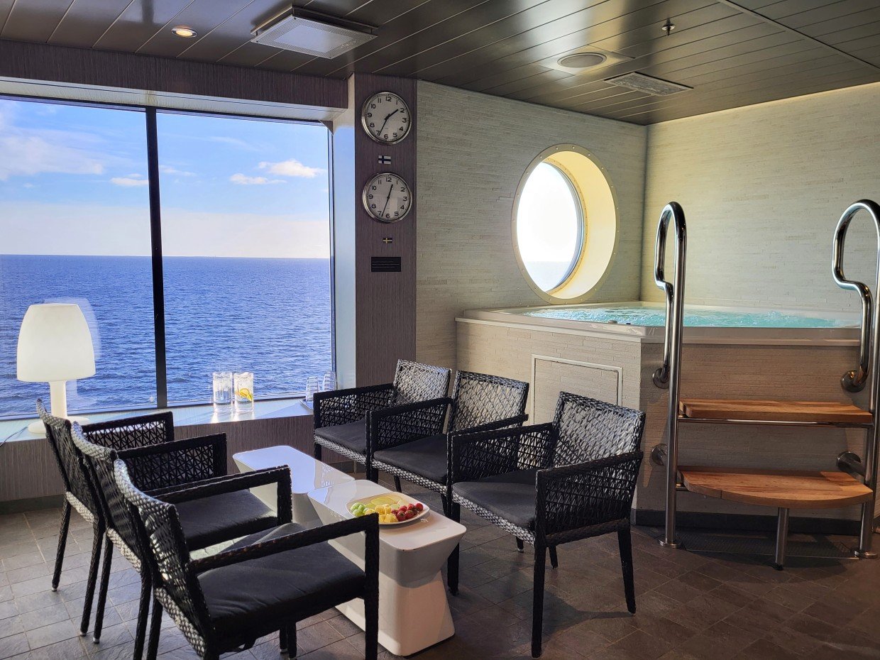 Viking Gracen Spa & Wellness -osastolla on kaksi VIP-saunatilaa, Ocean ja muutaman kympin kalliimpi Grace. VIP-saunatila Gracessa on oleskelualue, wc, poreamme merelle suuntautuvan ikkunan äärellä sekä sauna merinäköalalla ja kyseisen tilan vuokrahintaan kuuluu myös pullollinen skumppaa. VIP-saunatila Oceanissa on myös oleskelualue ja poreamme merelle suuntautuvan ikkunan äärellä, mutta saunassa ei ole ikkunaa ja wc puuttuu. Skumppakaan ei ole jäissä odottelemassa, mutta Span baarista sen voi VIP-tilaan ostaa ja sinne viedä. Molemmissa VIP-tiloissa odottaa kylpijöitä myös käsitykseni mukaan hedelmätarjotin ja vettä.