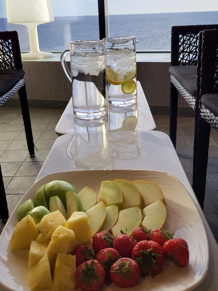 Premium-hytin hintaan kuului minibaarin antimet (mm. 0,375 l:n skumppa) sekä iltalähdöillä Premium-aamupala, joten erillistä skumppaa ei tarvinnut tilata tervetulolahjaksi ja aamupalakin tuli hyttivarauksen mukana. Jotain kivaa me kuitenkin halusimme hyttiin juhlan kunniaksi, joten tilasimme tervetulolahjaksi suklaakuorrutettuja mansikoita.