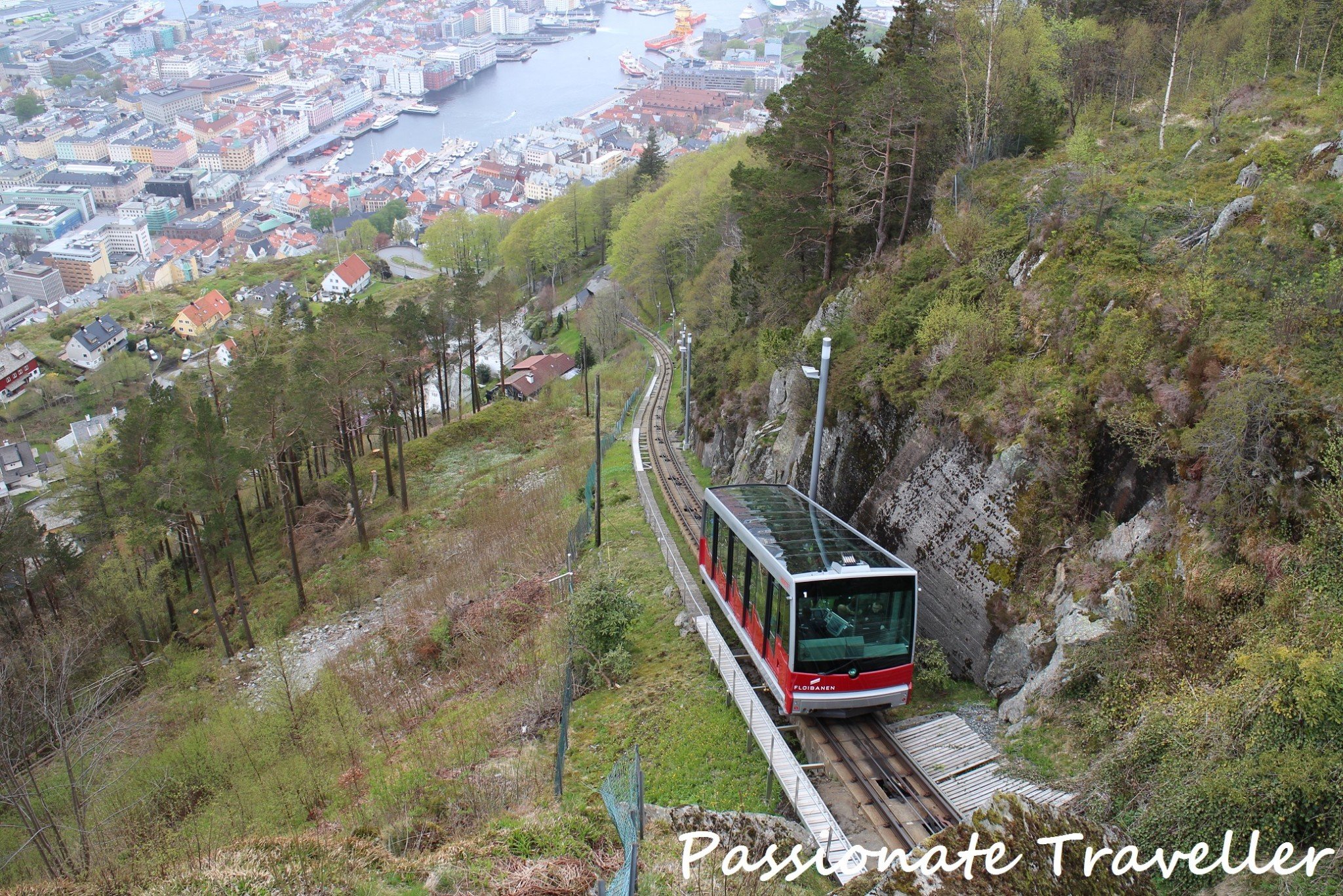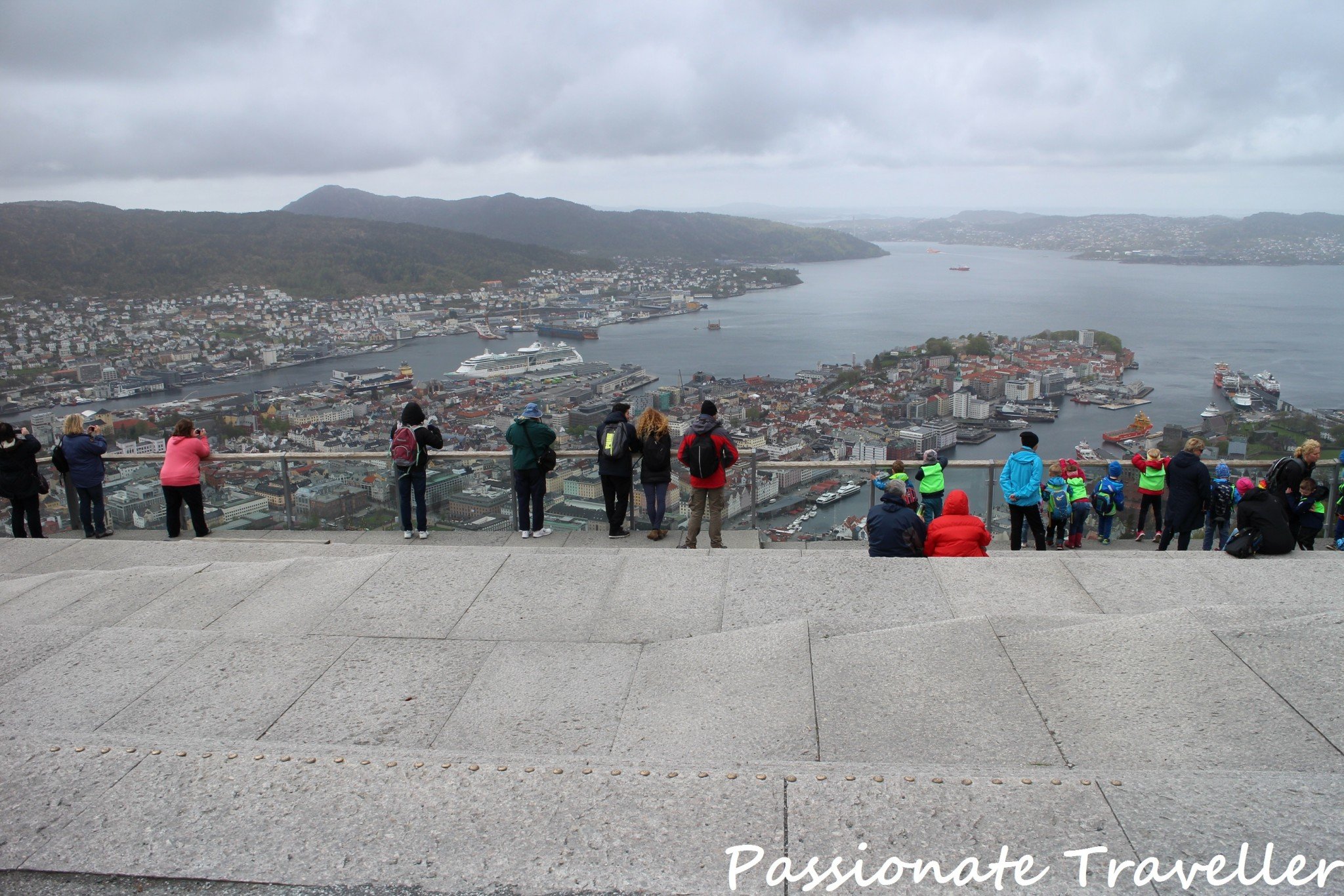 Royal Caribbeanin Hiking Mount Fløyen-retkellä bussi kuljetti meidät samaan kohtaan, johon ilmaisbussit olivat jättäneet meidät aiemmin. Kävelymme suuntautui keskustan halki Fløyen-vuoren juurelle, josta nousimme kaapelijunalla vuoren näköalapaikalle ihastelemaan Bergeniä ylhäältä käsin.