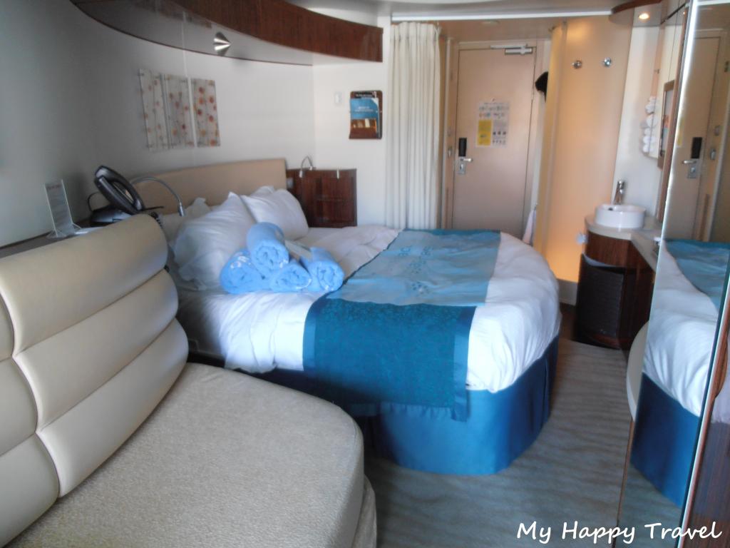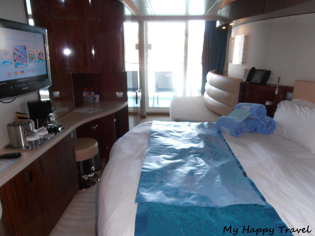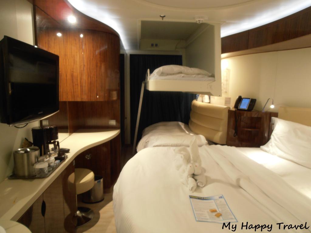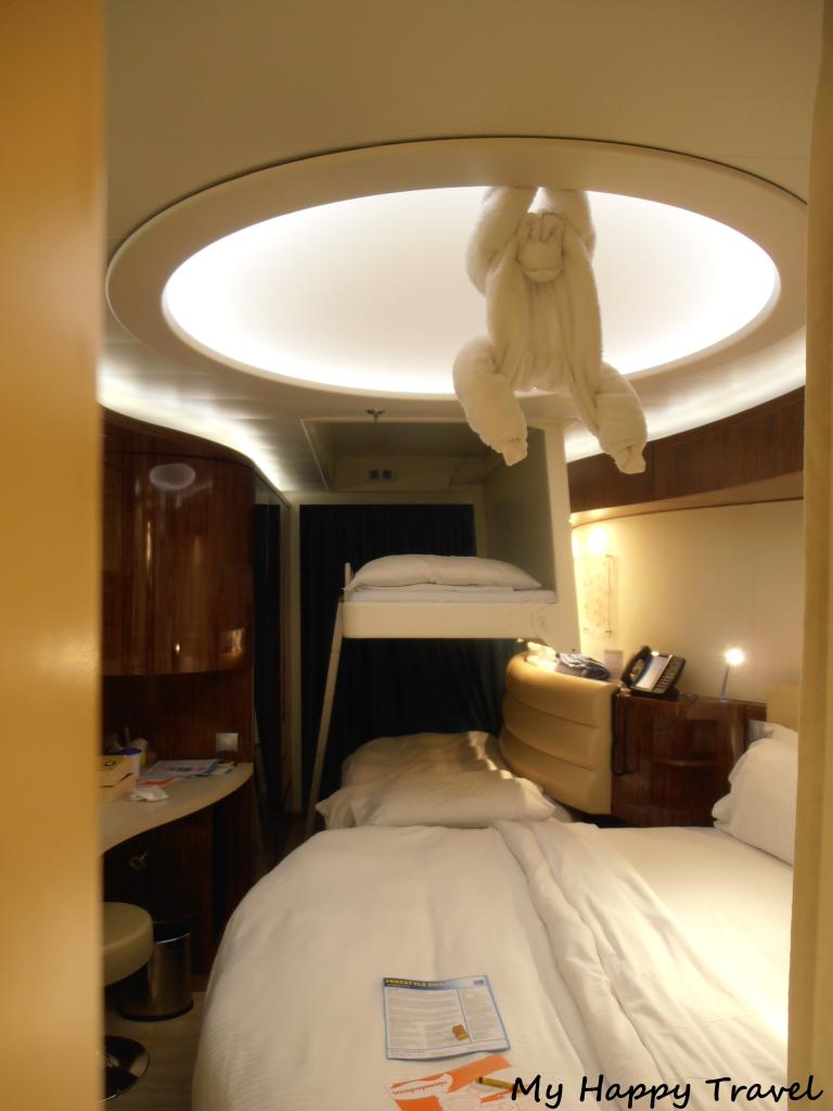 Meidän hyttinä oli neljän hengen Family Balcony #12059 kannella 12. Hytin koko parvekkeineen oli noin 20 m², mutta nuokin neliöt olisi voinut mielestäni käyttää hiukkasen viisaammin. En ollut nimittäin kovin innoissani hytin pohjaratkaisusta, joten parveke ja tavaroiden säilytysmahdollisuudet olivat ne, jotka pelastivat minut tyrmäämästä hyttiä kokonaan. Minä olen pieni nainen, mutta jopa minulla oli vaikeuksia liikkua ajoittain hytissä.