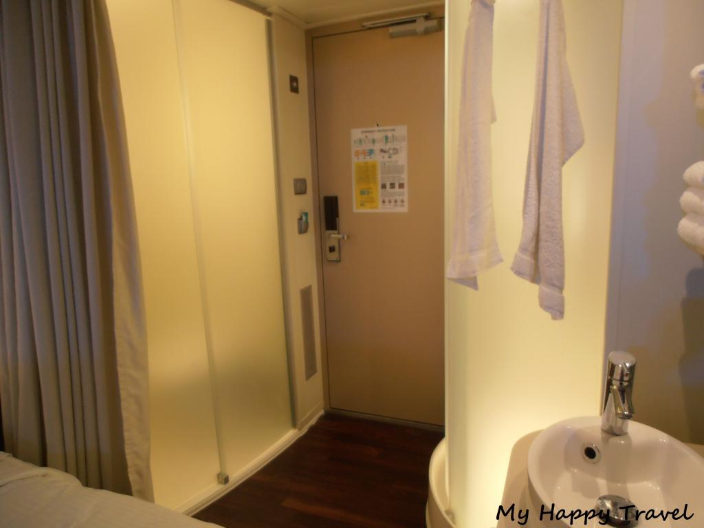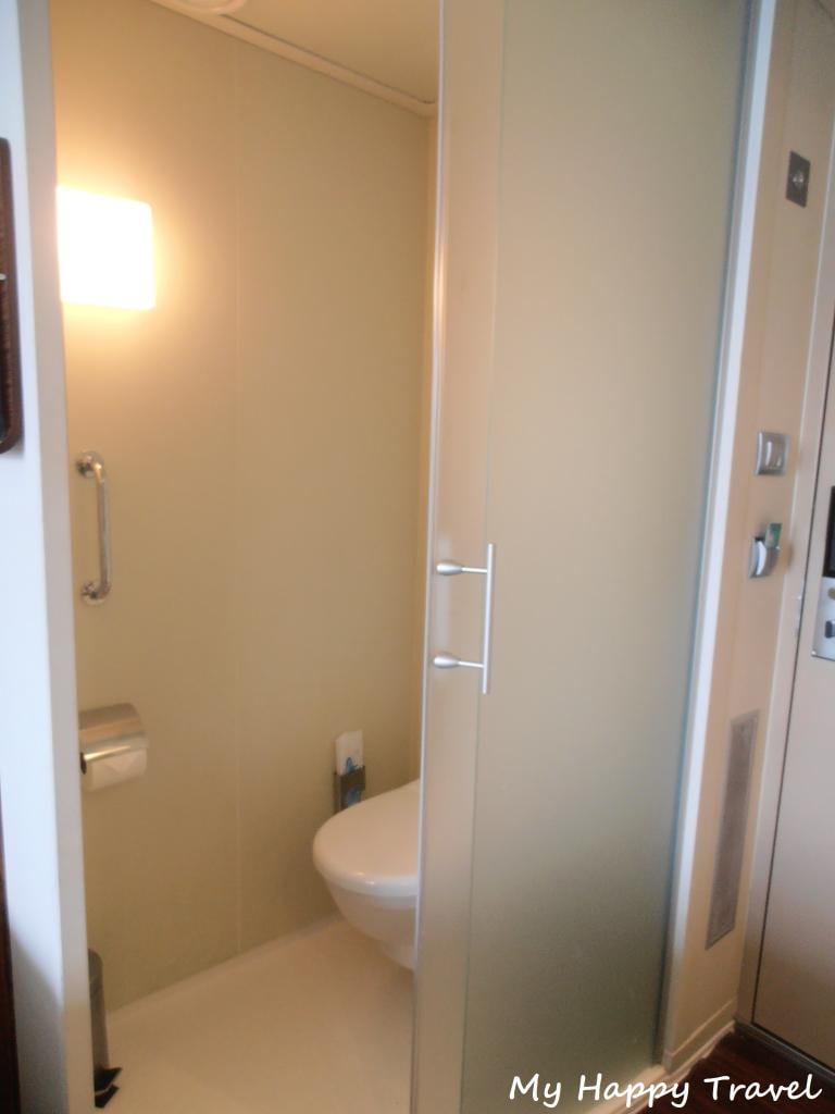 Vasemmalla vessa, oikealla suihku ja hytin puolella sängyn vieressä käsienpesuallas. Ja muuten tuo valkoisena paistava laikku vasemmanpuoleisessa ovessa on vessanpönttö… Vasemmalla näkyvän vaalean verhon sai vedettyä kuitenkin koko matkalta vessa/suihkualueen eteen, joten se toimi näkösuojana sekä vessan että hytin suuntaan.