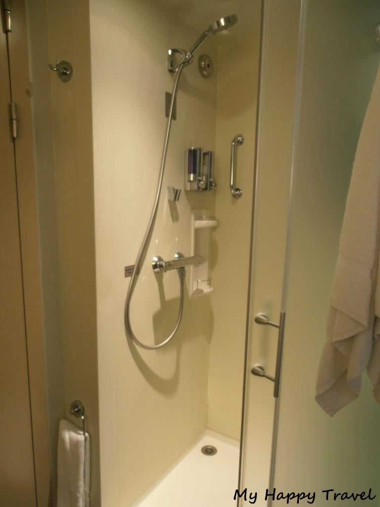Hytin kylpyhuone/vessa -ratkaisu sai minulta pari närkästynyttä sanaa yhdessä vaiheessa. Yksityisyydestä ei ollut mielestäni tietoakaan, koska valojen ollessa vessassa/suihkussa vessassaistujan/suihkuttelijan tunnisti varmasti maitolasin takaa. Minulta loppui huumorintaju tuohon ratkaisuun heti laivan ollessa vielä Barcelonan satamassa, kun meidän huonepalvelija tuli esittäytymään miehelleni. Siinä he seisoskelivat meidän hytin oven juuressa ja turinoi pitkään, kun meikäläinen istui siinä vieressä vessassa pöntöllä ja pohti aikamoisen tovin, että mahtoiko Michael ja käytävällä kävelevät matkustajat nähdä meikäläisen paljaan takapuolen…
