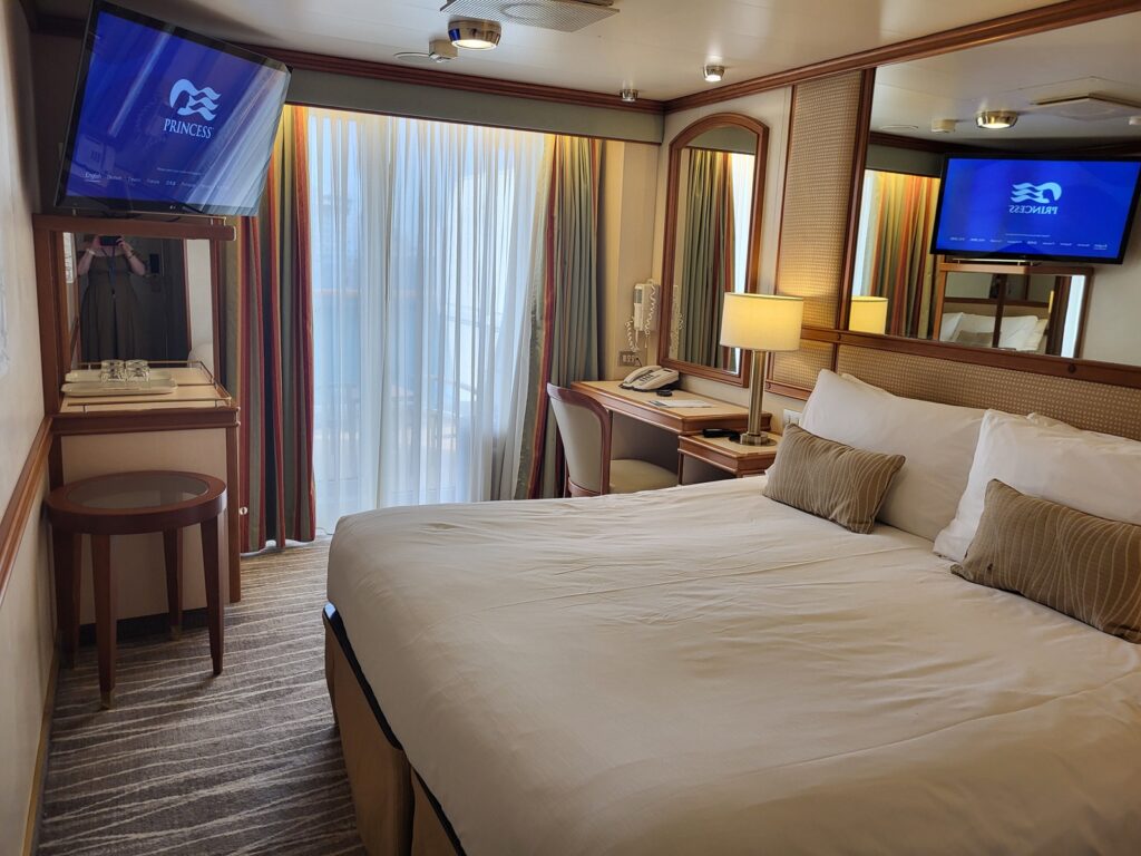 Caribbean Princessin parvekehytti oli oleskelutiloilaan pienin, missä olimme koskaan olleet karibianristeilyillä. Edes pientä sohvaa ei tähän hyttiin mahtunut, sillä hytistä oli otettu tilaa vaatehuoneen puolelle. Tässä hytissä vaatekaapin sijaan nimittäin oli walk-in wardrobe.
