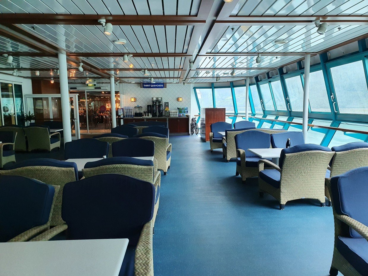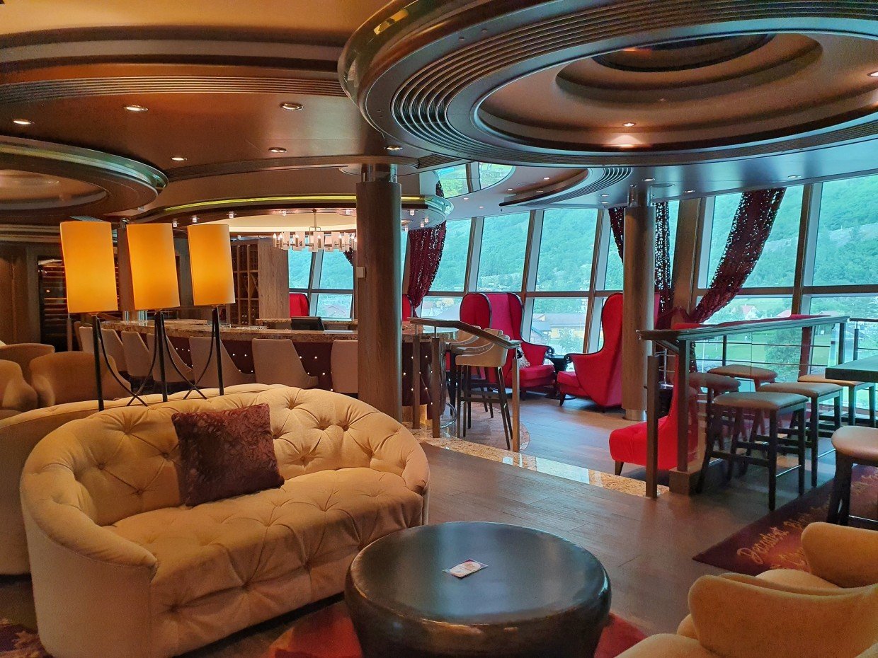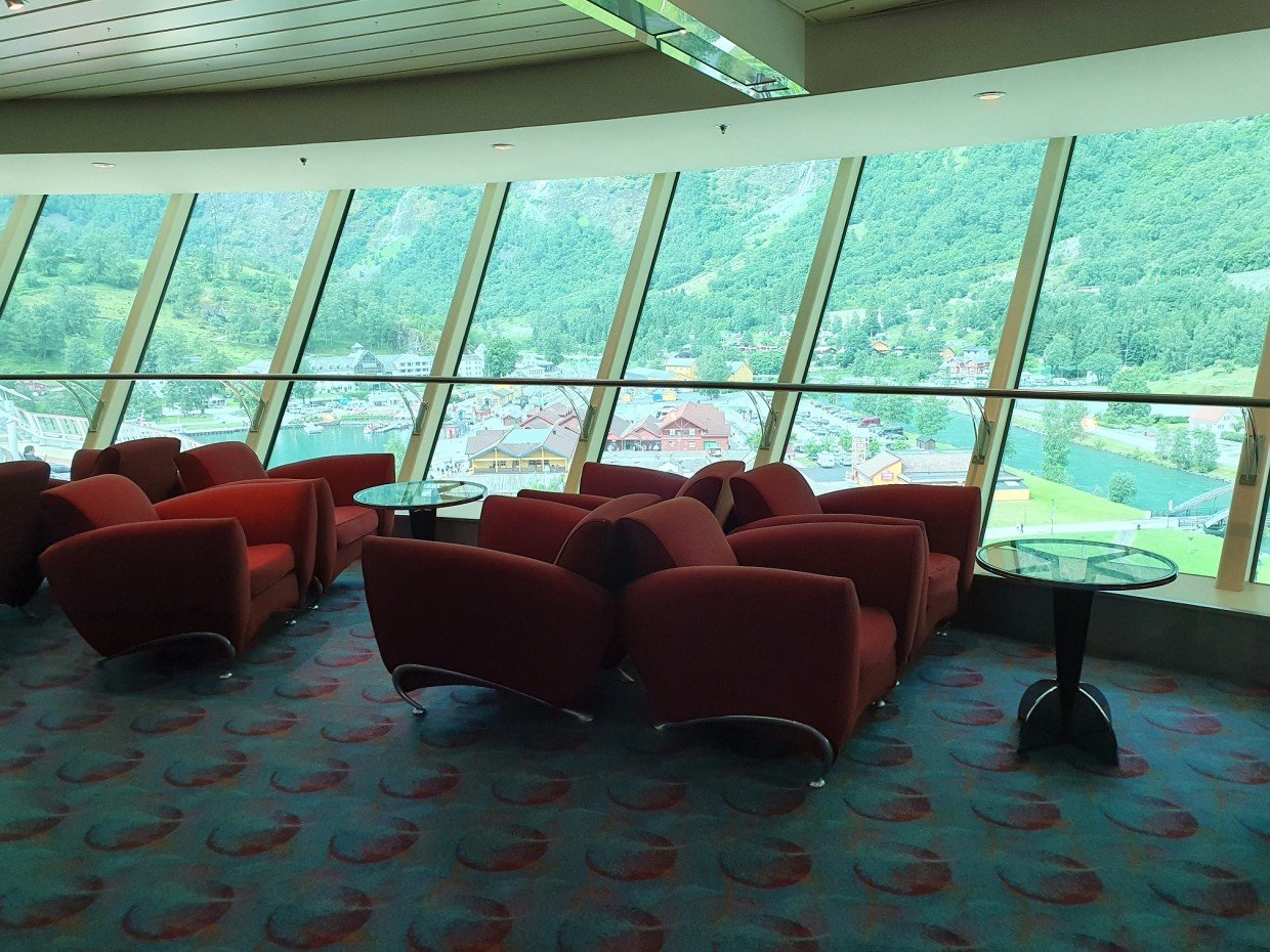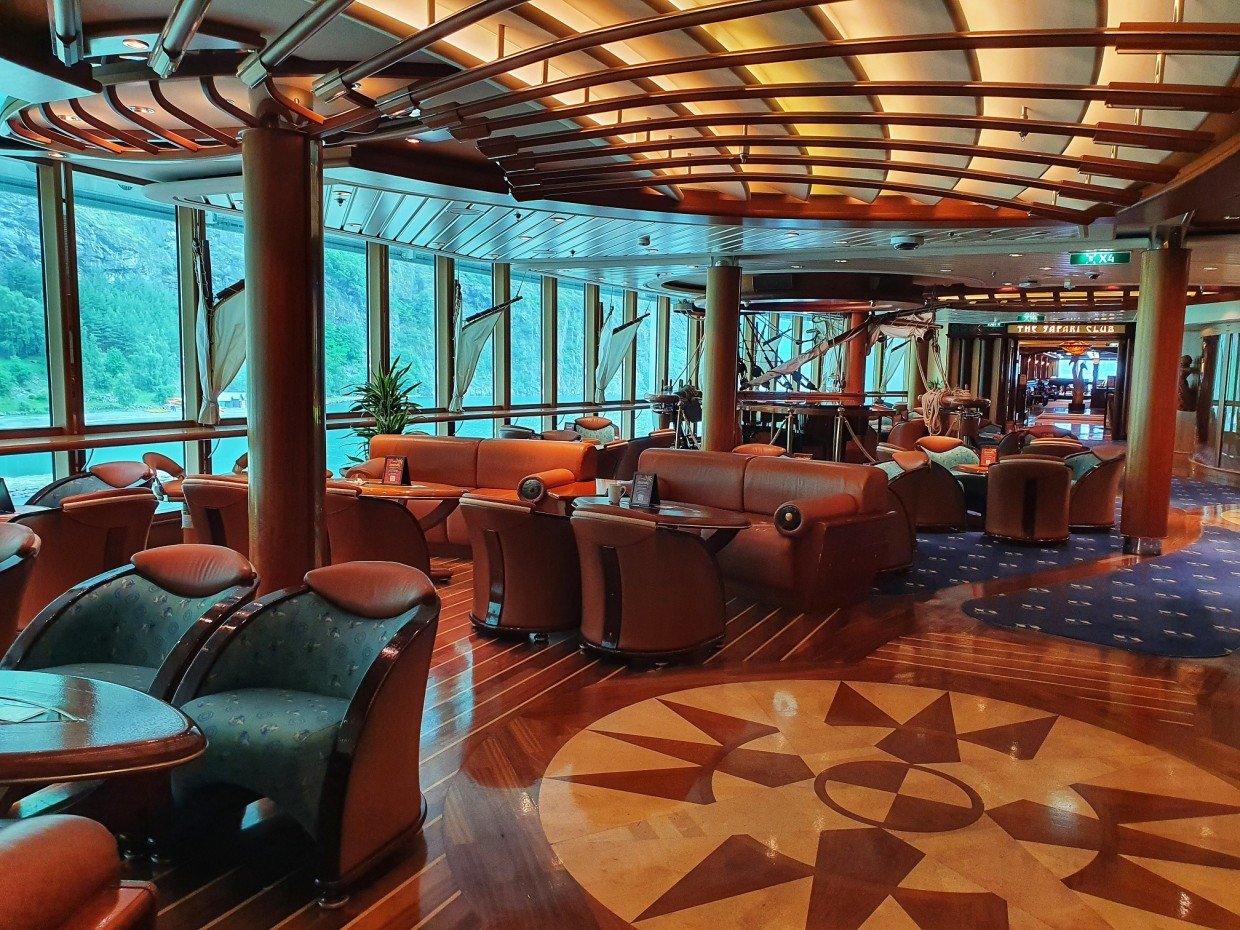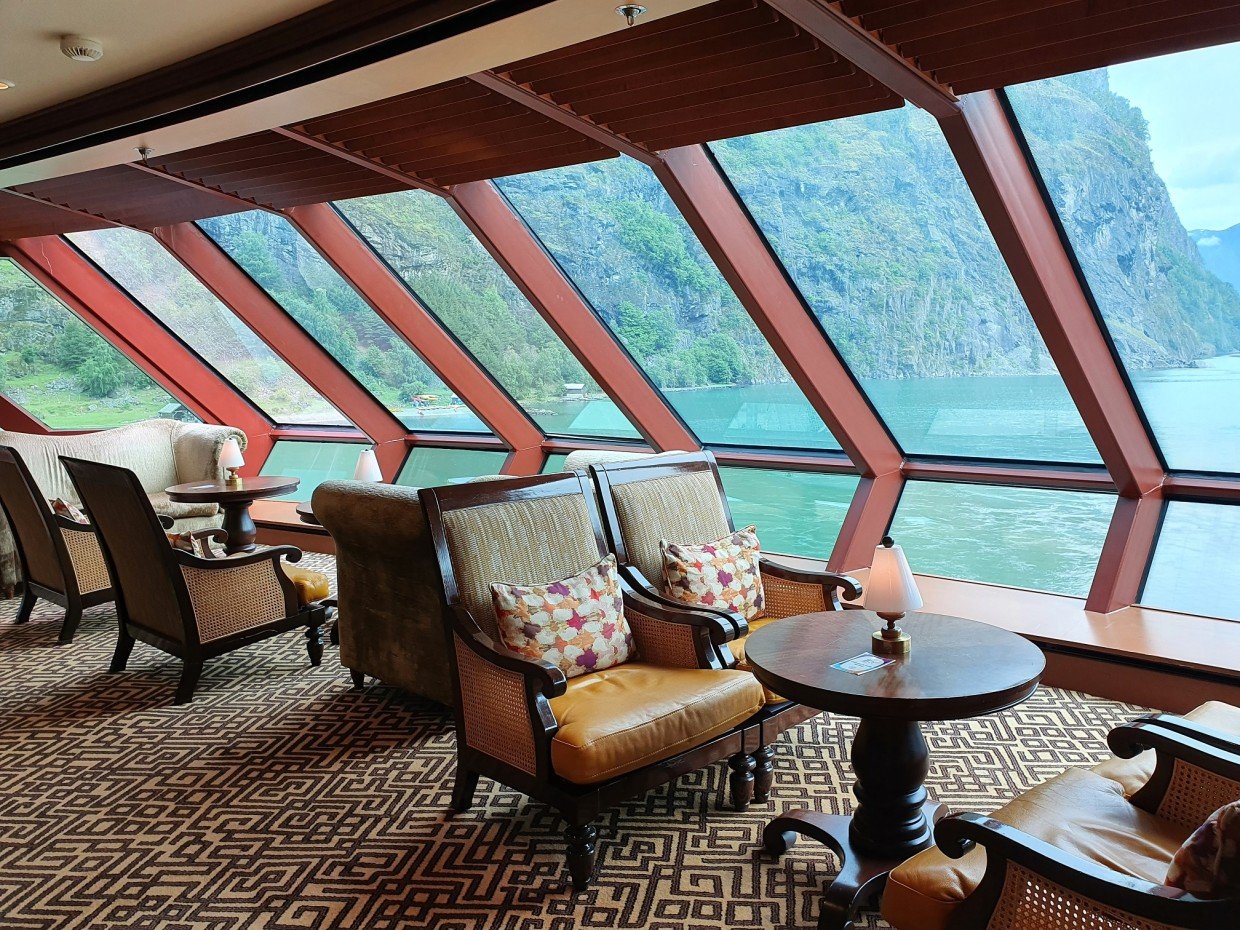 Kuten jo aiemmin kerroin, laiva edustaa vanhempaa risteilytyyliä ja se näkyy sisustuksessa. Messinkiä, tummaa puuta ja tummia/värikkäitä värejä. Tyyli on vanhahtavaa ja ikä näkyy osassa kalusteita, mutta kaikkialla on siistiä. Isot ikkunat mahdollistavat maisemien ihailun sisältä ja laiva sopikin kuin nenä päähän Norjan risteilylle. Auringon paistaessa kuitenkin lämpötila nousi omalla risteilyllämme ikkunoiden lähettyvillä isostikin, eikä ilmastointi siihen auttanut, joten ihan lämpimille Karibian vesille ko. laivaa valitsisi vaan sellaisen, jossa ei olisi samaan malliin isoja ikkunapinta-aloja.
