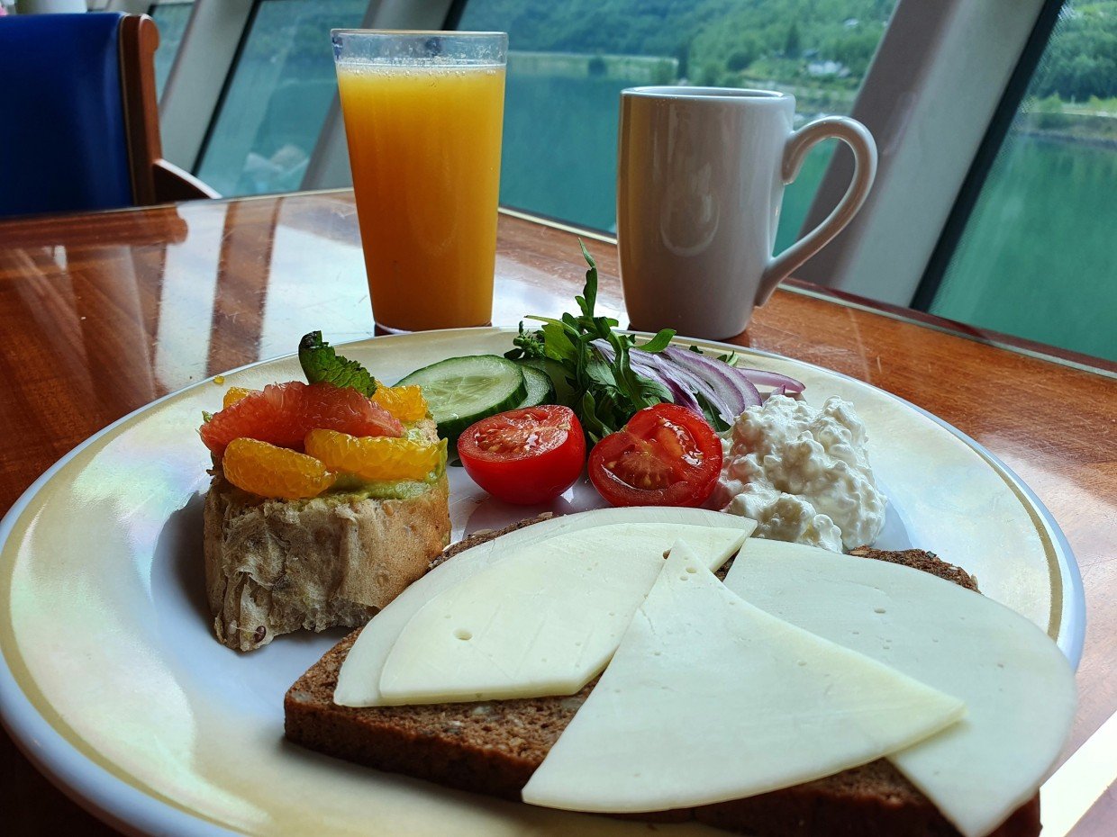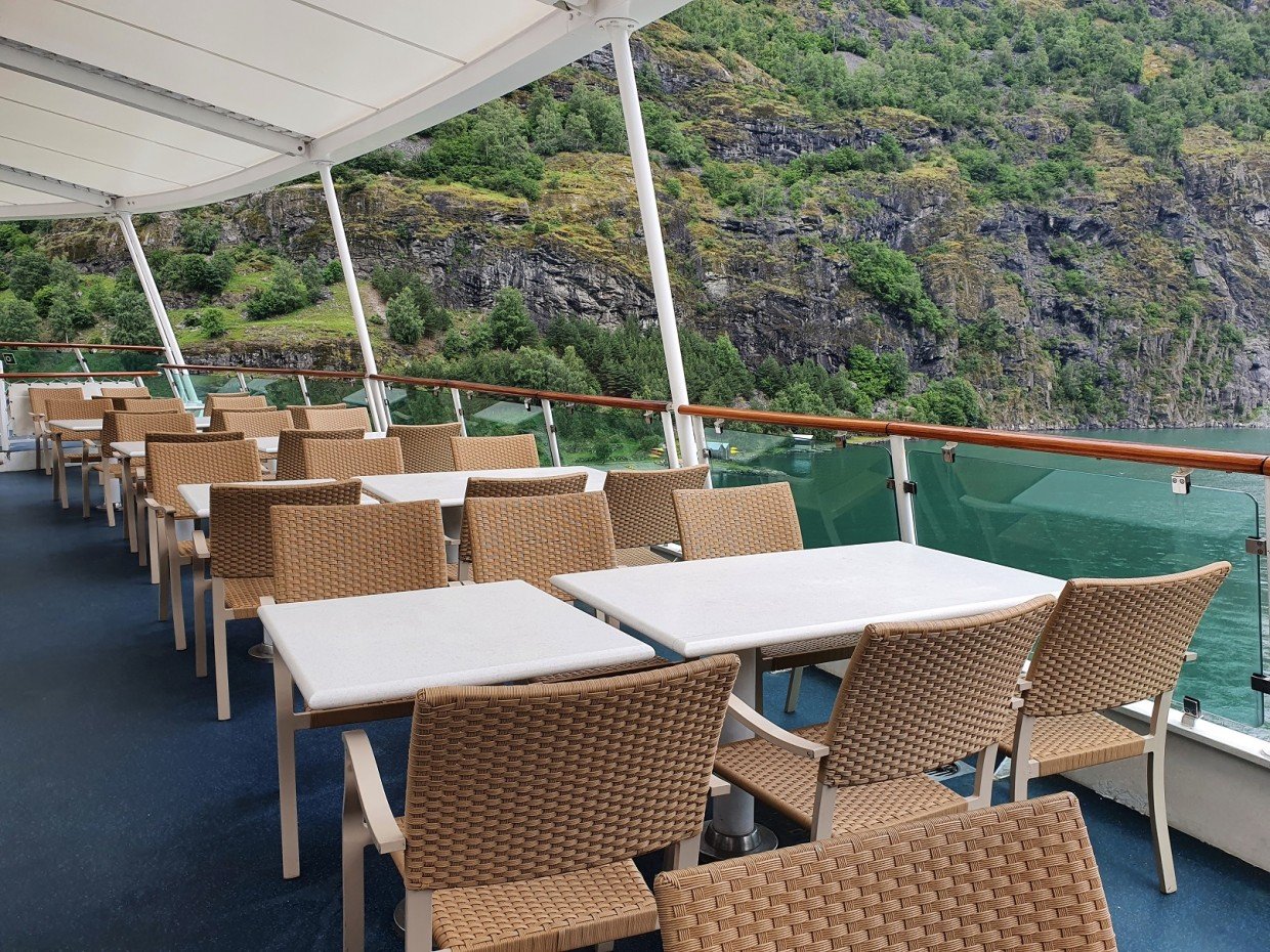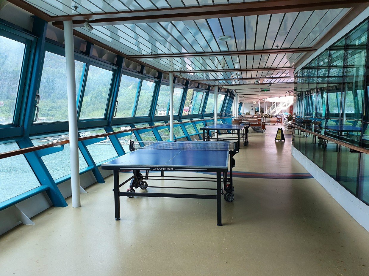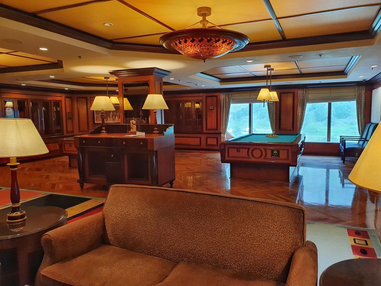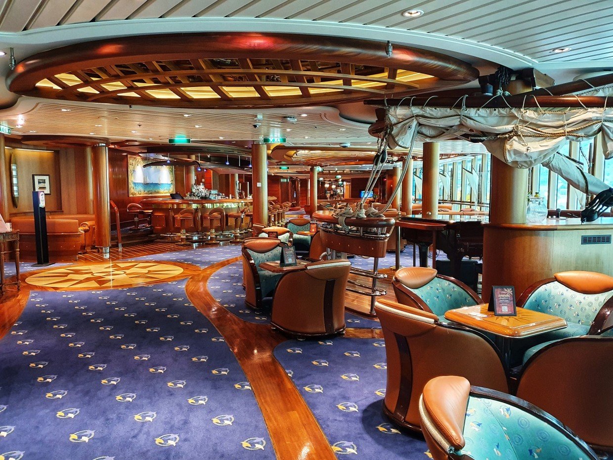Kuten jo aiemmin kerroin, laiva edustaa vanhempaa risteilytyyliä ja se näkyy sisustuksessa. Messinkiä, tummaa puuta ja tummia/värikkäitä värejä. Tyyli on vanhahtavaa ja ikä näkyy osassa kalusteita, mutta kaikkialla on siistiä. Isot ikkunat mahdollistavat maisemien ihailun sisältä ja laiva sopikin kuin nenä päähän Norjan risteilylle. Auringon paistaessa kuitenkin lämpötila nousi omalla risteilyllämme ikkunoiden lähettyvillä isostikin, eikä ilmastointi siihen auttanut, joten ihan lämpimille Karibian vesille ko. laivaa valitsisi vaan sellaisen, jossa ei olisi samaan malliin isoja ikkunapinta-aloja.