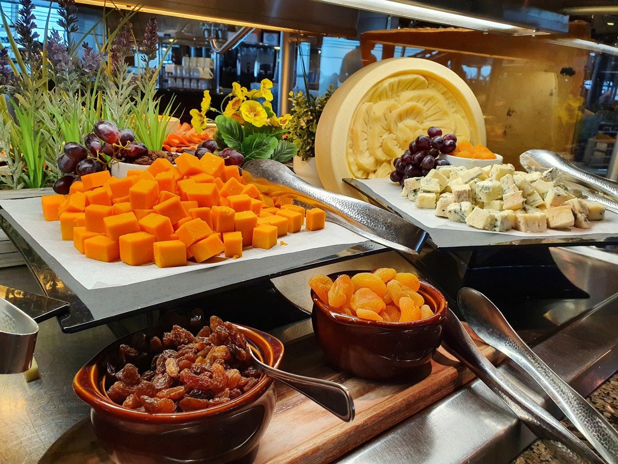 Risteilyn hintaan kuuluvia ruokaa tarjoavia paikkoja on useampiakin. Kahden kannen korkuisessa pääravintolassa (Tides Dining Room kansilla 4 ja 5) pääsee nauttimaan à la carte-tasoisista annoksista ja pöytiin tarjoiluista aamupala-, lounas- ja illallisaikaan. Kannella 5 olevassa osassa ruokailevat ne, joilla on kiinteä kattausaika ja kannella 4 puolestaan ne, jotka haluavat itse päättää ruokailuaikansa (My Time Dining). Siinä, missä kiinteän kattausajan varanneet istuvat joka ilta samassa pöydässä ja samat tarjoilijat palvelevat joka ilta, My Time Dining-asiakkaat ohjataan milloin mihinkin vapaaseen pöytään ja tarjoilijat myöskin vaihtuvat pöytien mukaan. Me tykästyimme muutamaan tarjoilijaan ja pyysimme pöytää heidän alueeltaan. Varustamo kiinnitti toiveeseemme huomiota ja jatkossa meidän sijoitettiin aina lempitarjoilijoidemme alueelle, vaikka illallisaikamme vaihtelikin risteilyn aikana.