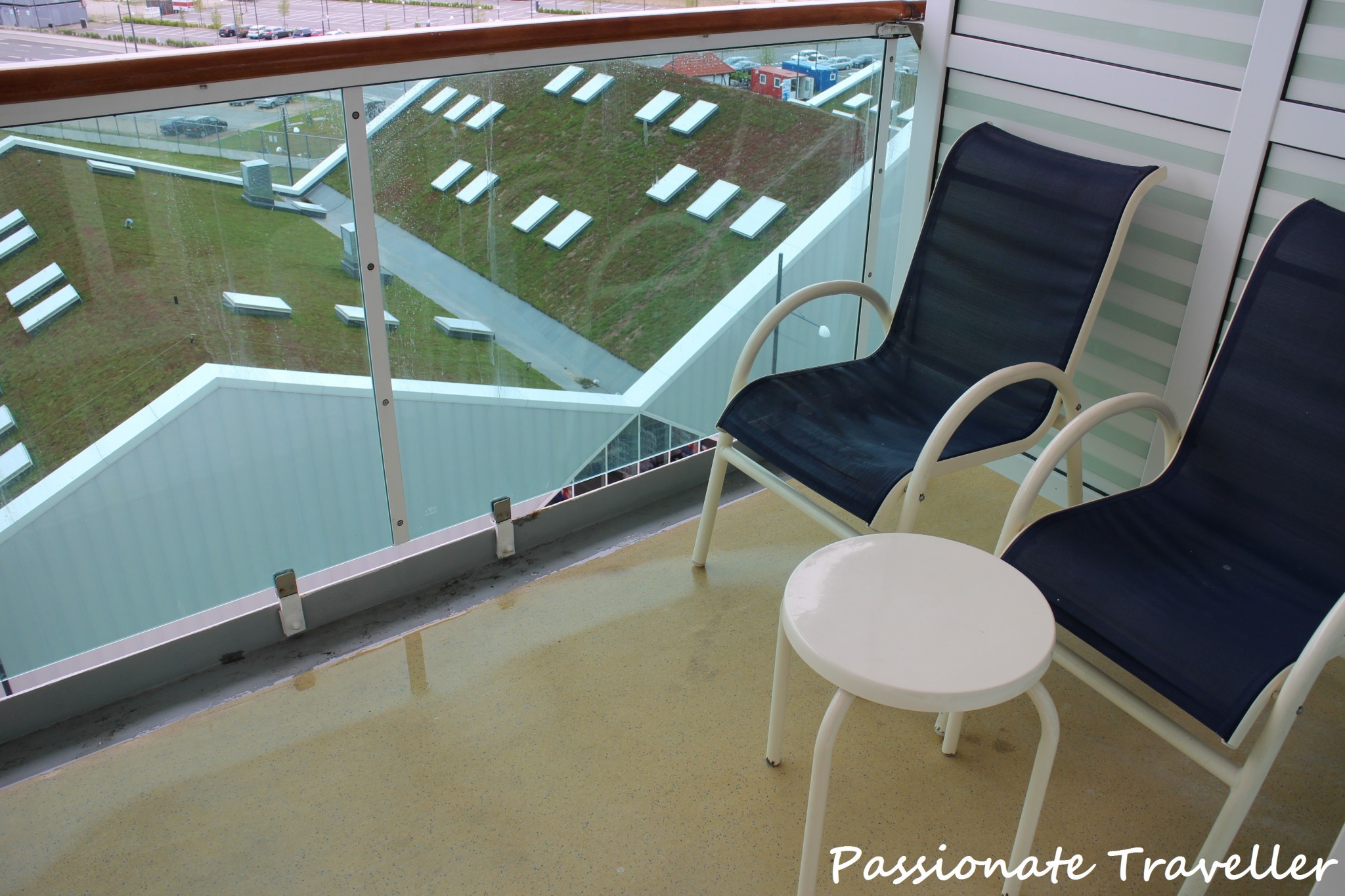 Kiitettävän kokoiselta parvekkeelta löytyy kaksi kangastuolia ja pieni pöytä. Aluksen rakenteiden takia muutamaa kerrosta ylempänä sijaitsee varjostava lippa, minkä takia ainakaan itse en suosittele varaamaan hyttiä heti lipan alta jos haluaa nauttia auringonpaisteesta.
