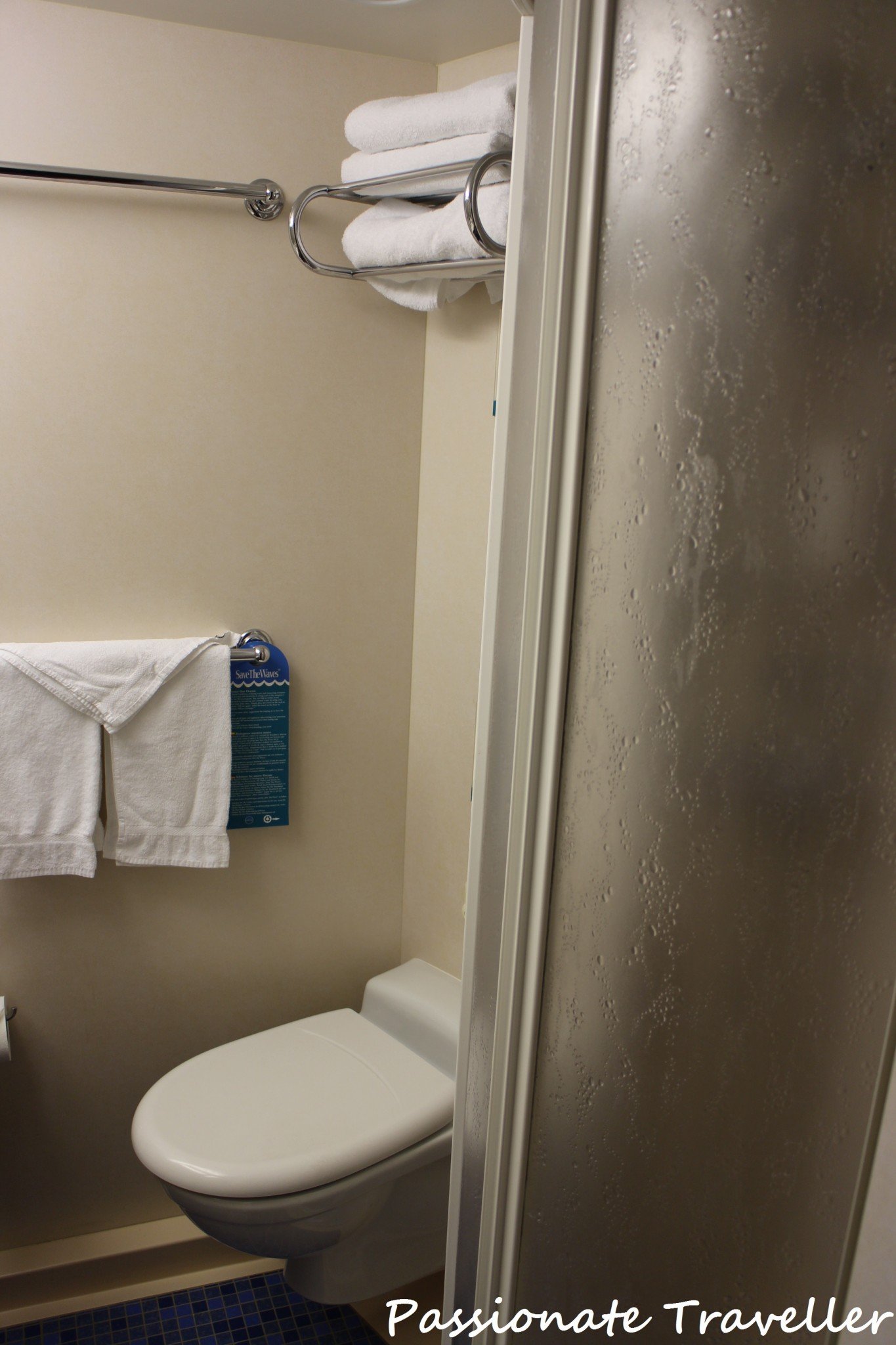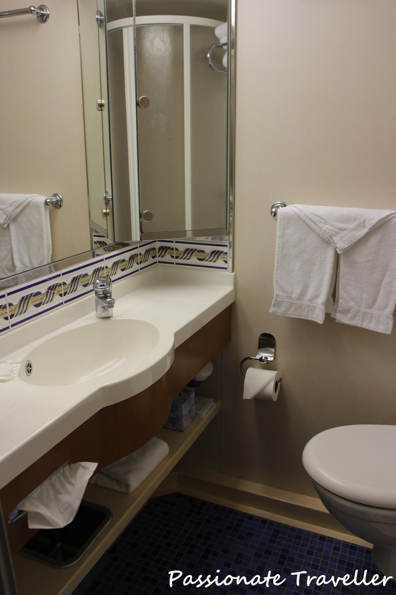 Kylpyhuone on laivoille tuttu kylpyhuone laattalattialla, mutta suihkuverho on korvattu oikealla suihkukaapilla. Kylpyhuoneesta löytyy hylly käsienpesualtaan alta ja kivana lisänä toisessa nurkassa on myös pienoinen peilikaappi.
