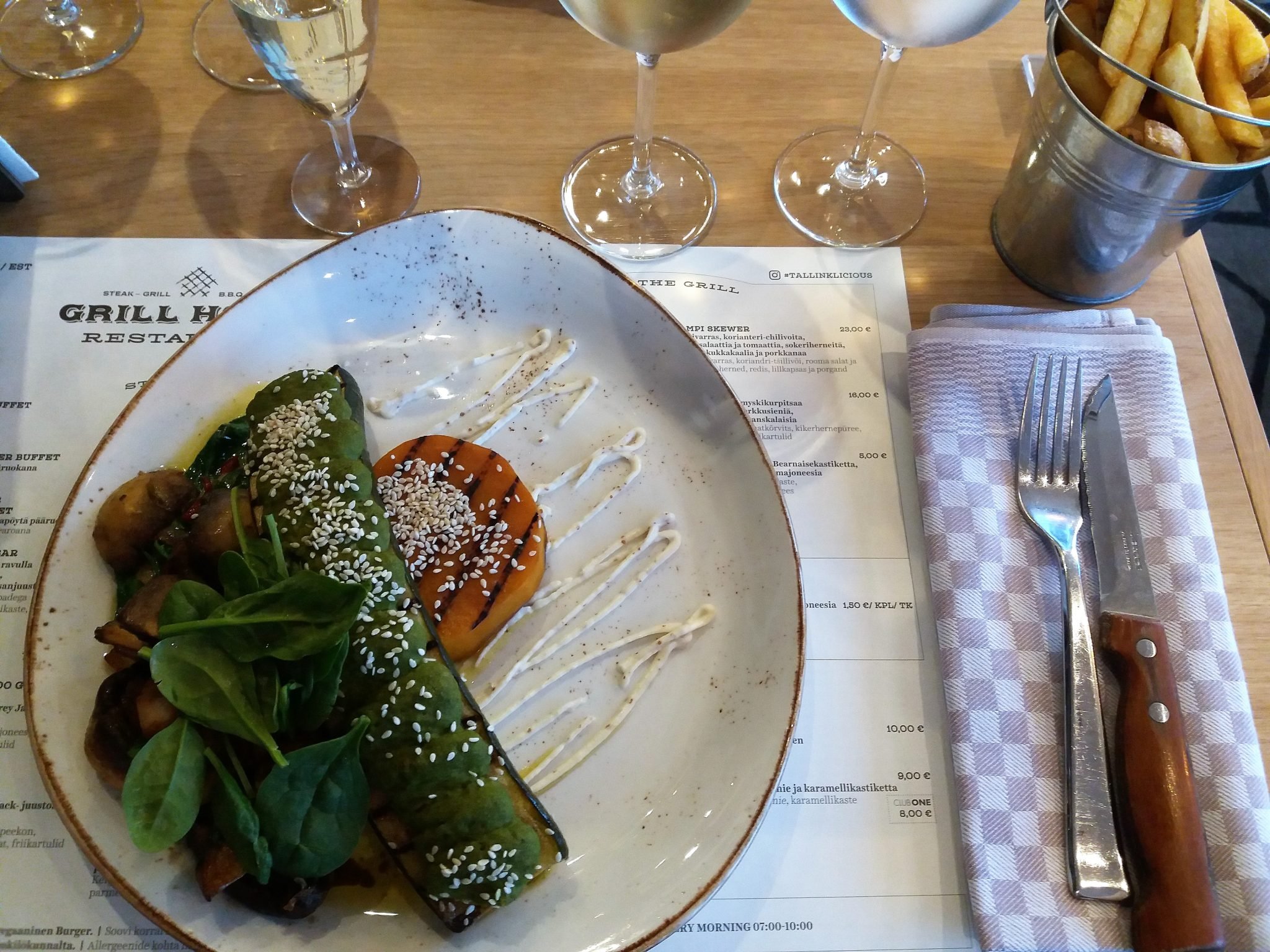 Halusimme syödä nopeammalla kaavalla, mutta nauttia samalla rauhasta ja palvelusta, joten päädyimme aterioimaan Grill House -ravintolaan heti sen avauduttua. Paikkavarausta emme tarvinneet, joskin ravintola täyttyi nopeaan tahtiin saavuttuamme sinne. Kannattaakin kiltisti tehdä pöytävaraus ravintolaan ennen matkaa.